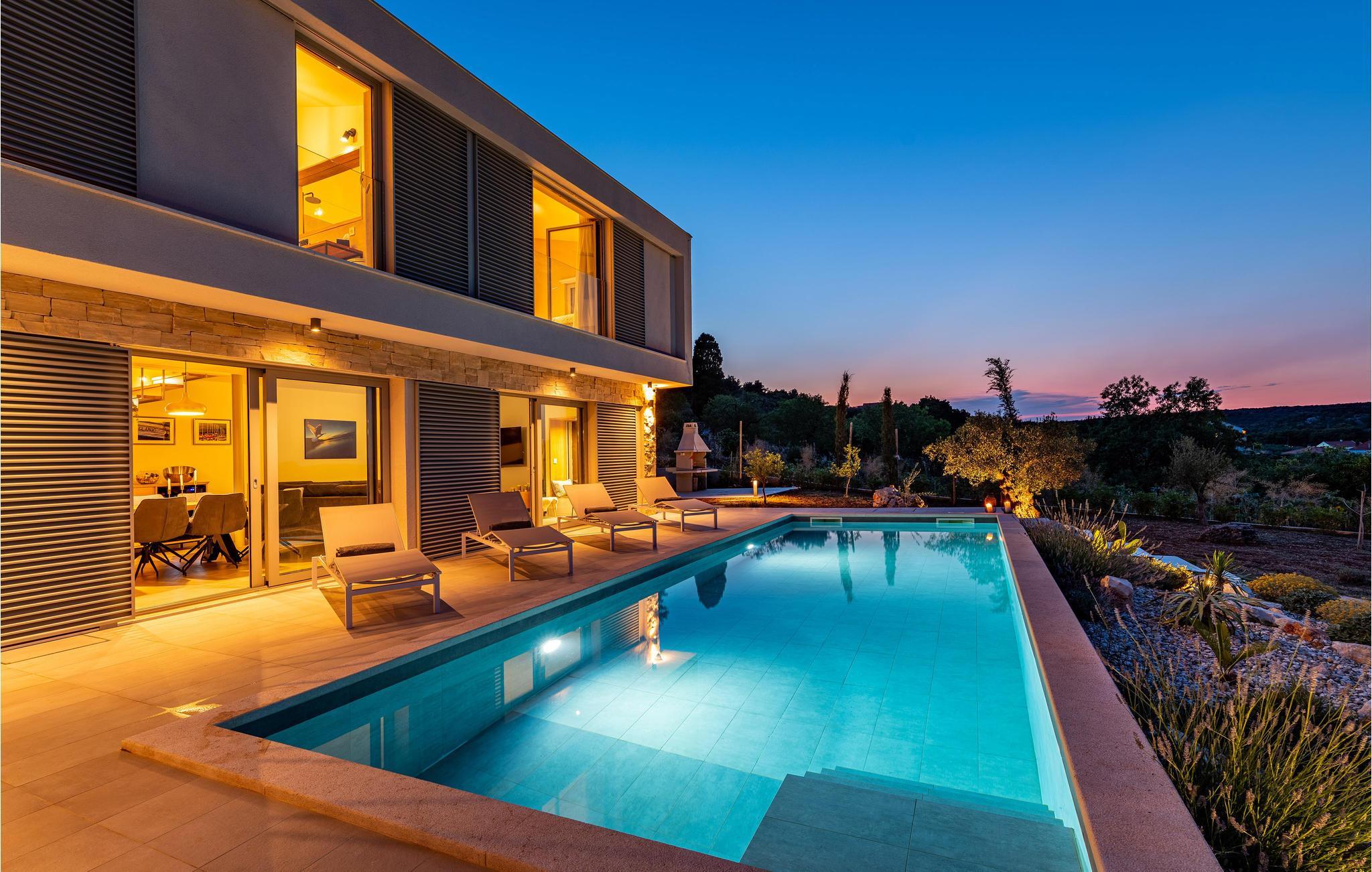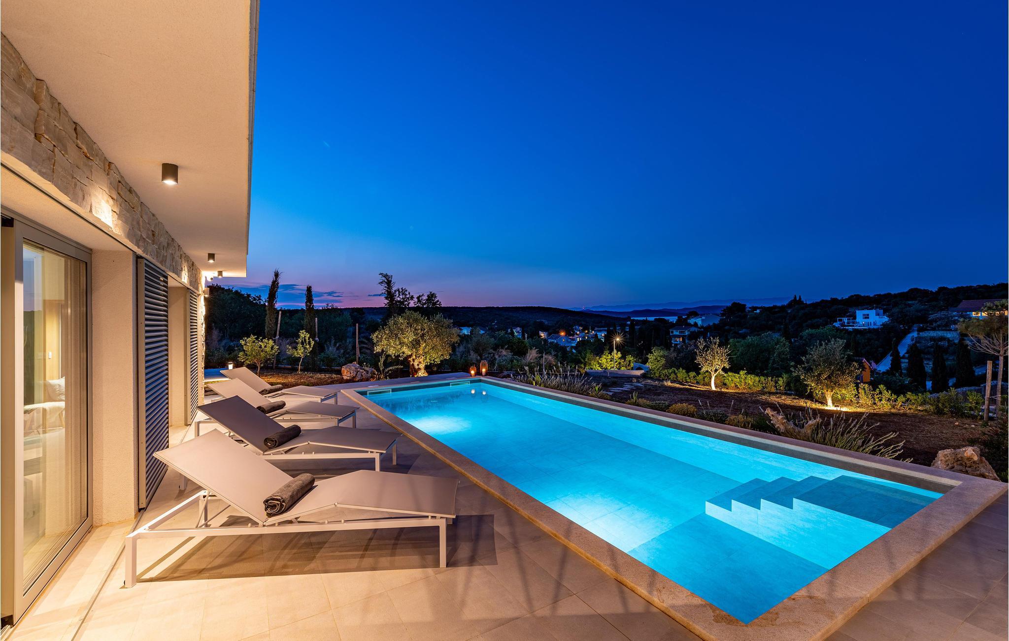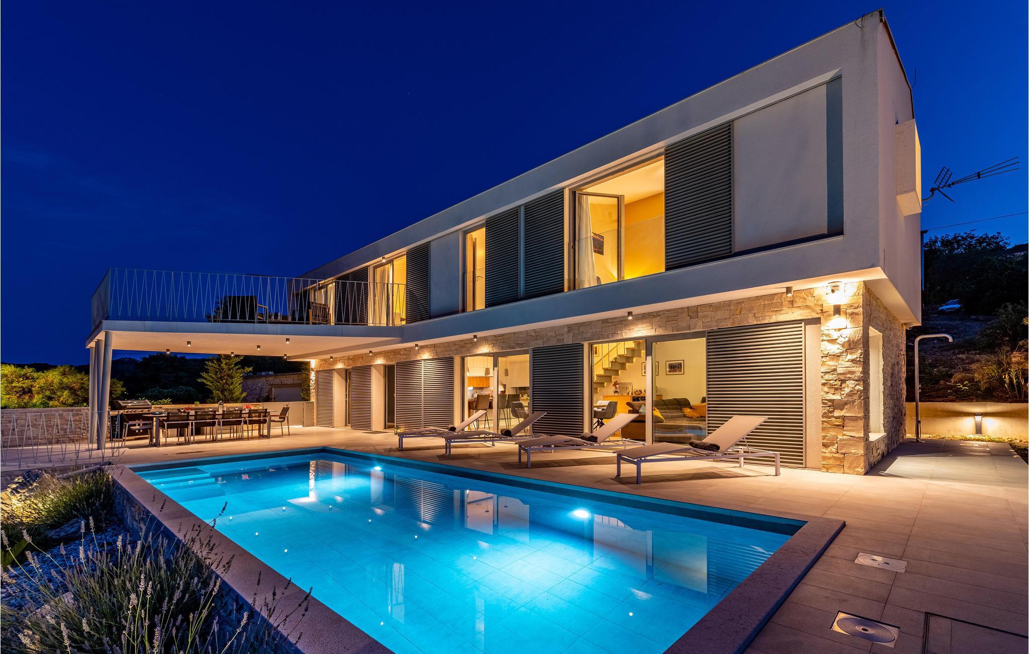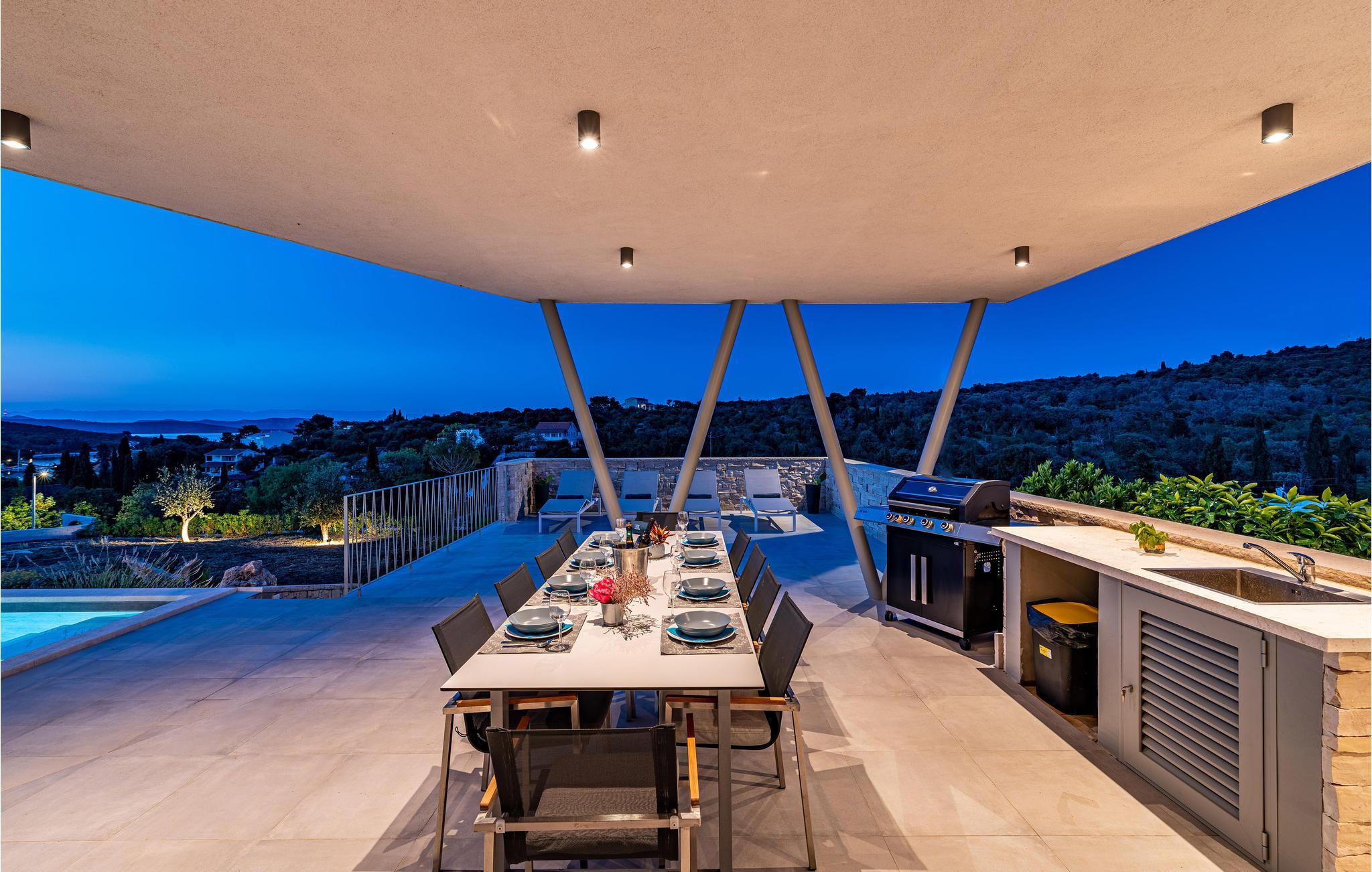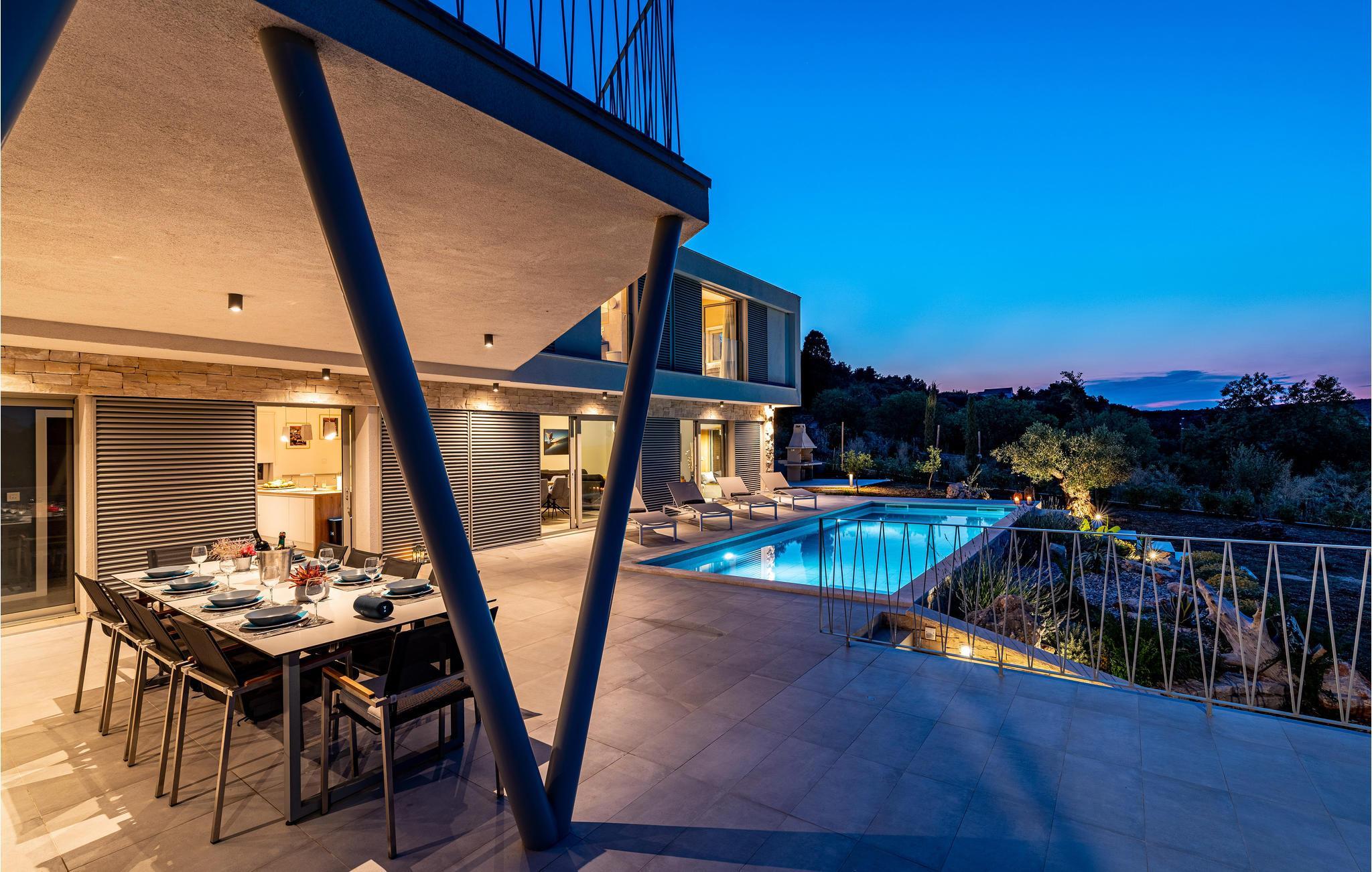 Denne ekstraordinære villa med moderne arkitektur lægger op til en uforglemmelig ferie. Den åbne planløsning i stueetagen kombinerer køkkenet, spisestuen og stuen for at skabe en luftig ramme, der fører direkte ud til solterrassen med pool. Hver etage har sin egen terrasse, hvor I kan nyde de rolige omgivelser. Poolen lover en forfriskning på varme dage, mens børnene leger i haven. Om aftenen kan I tilberede grillede specialiteter udendørs og afslutte dagen med at slappe af.