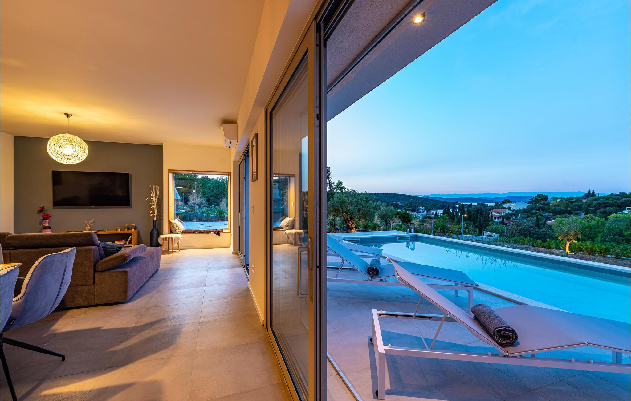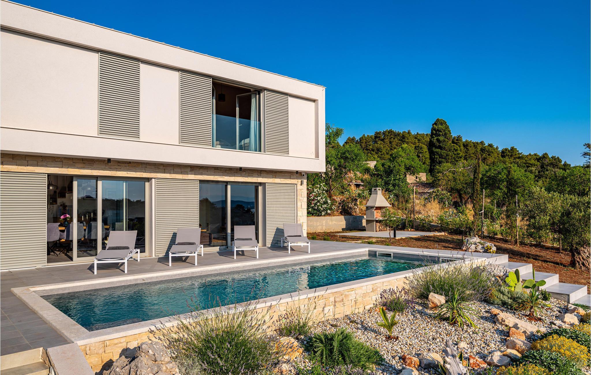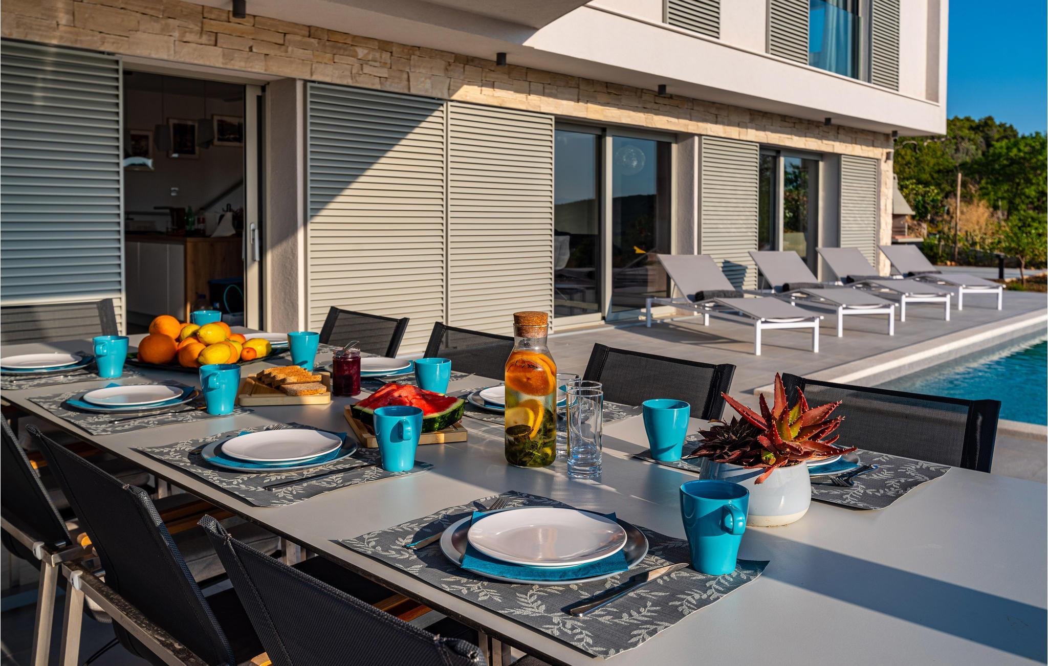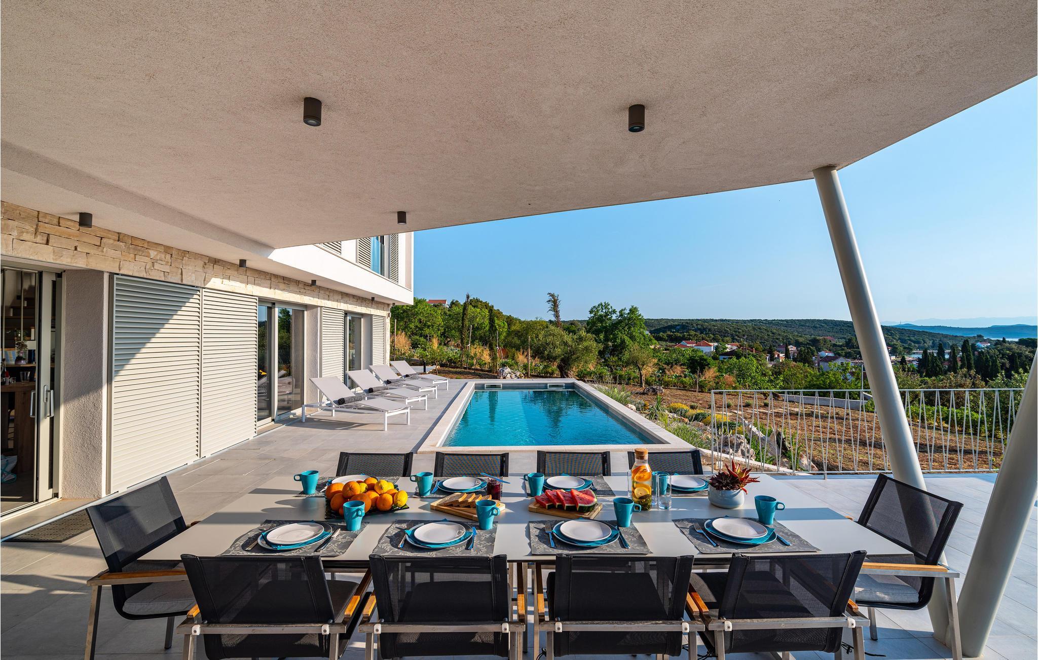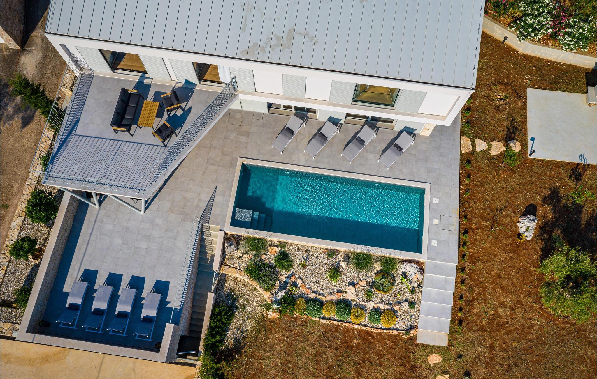Denne ekstraordinære villa med moderne arkitektur lægger op til en uforglemmelig ferie. Den åbne planløsning i stueetagen kombinerer køkkenet, spisestuen og stuen for at skabe en luftig ramme, der fører direkte ud til solterrassen med pool. Hver etage har sin egen terrasse, hvor I kan nyde de rolige omgivelser. Poolen lover en forfriskning på varme dage, mens børnene leger i haven. Om aftenen kan I tilberede grillede specialiteter udendørs og afslutte dagen med at slappe af.