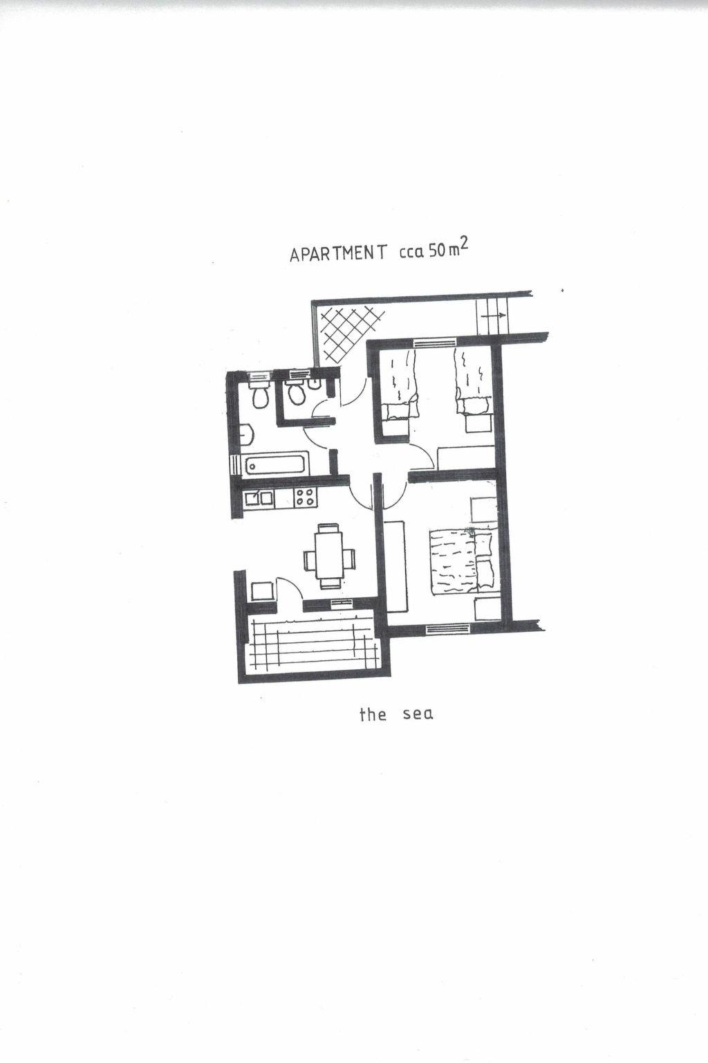 Apartment has a spacious terrace overlooking the sea, prefect for enjoying your daily meal or a glass of wine in the evening. Apartments is around 50 m2 and have two separate bedrooms and a dining room with a fully equipped kitchen.