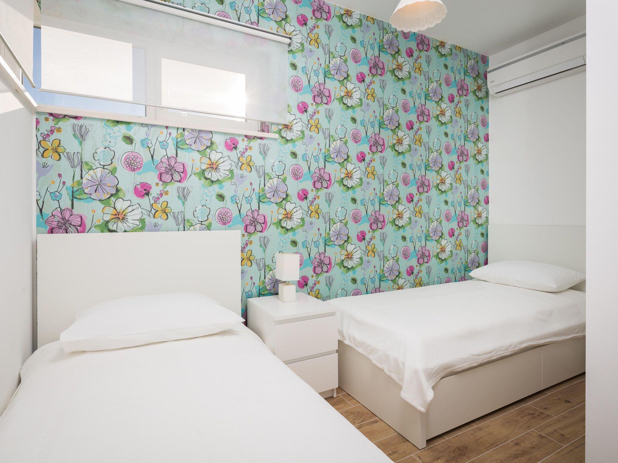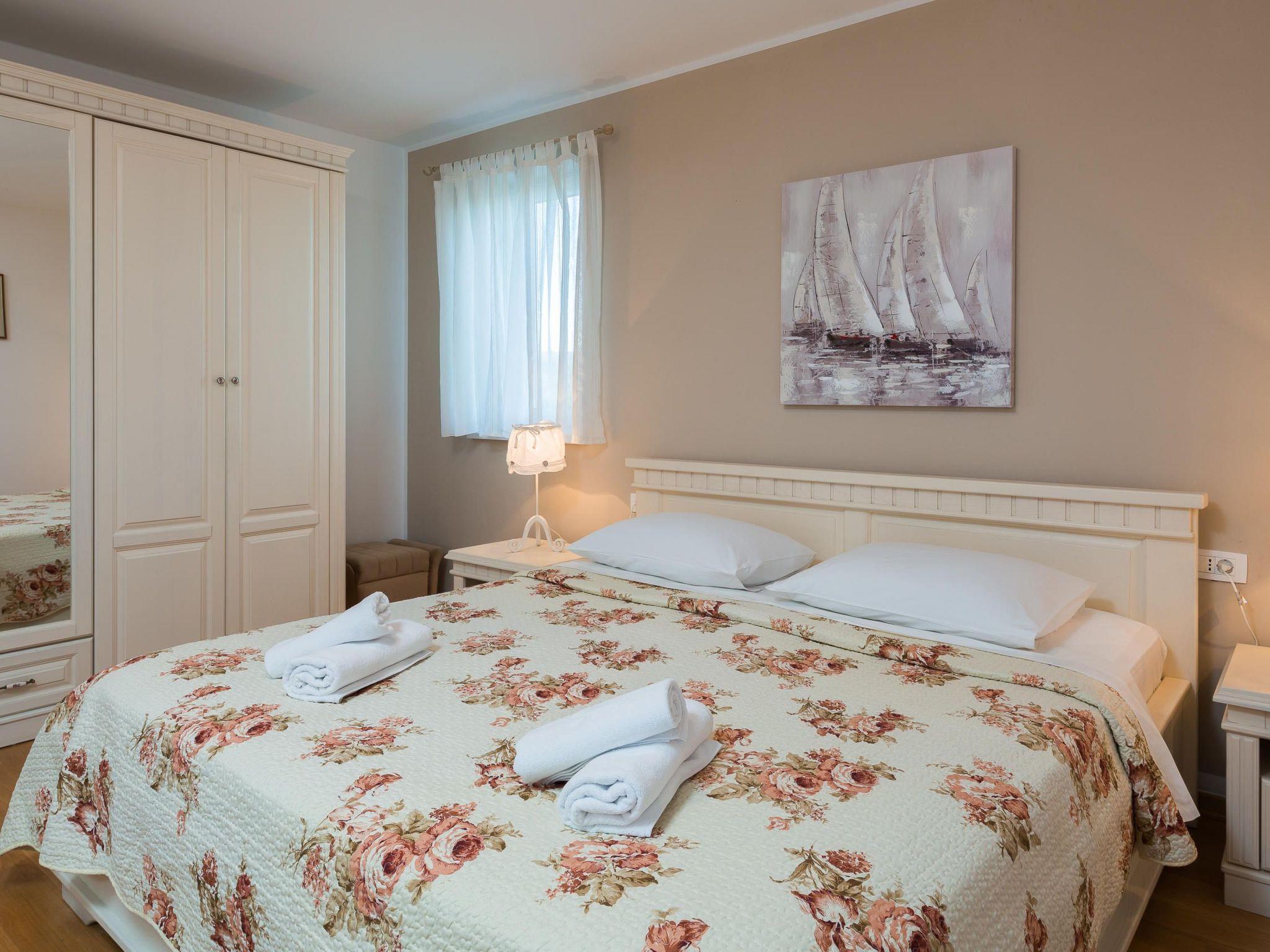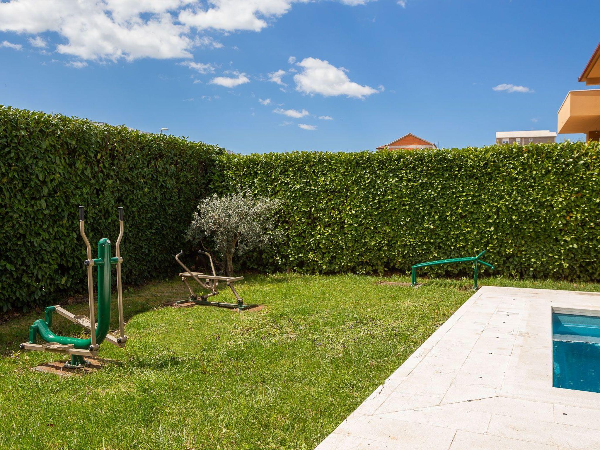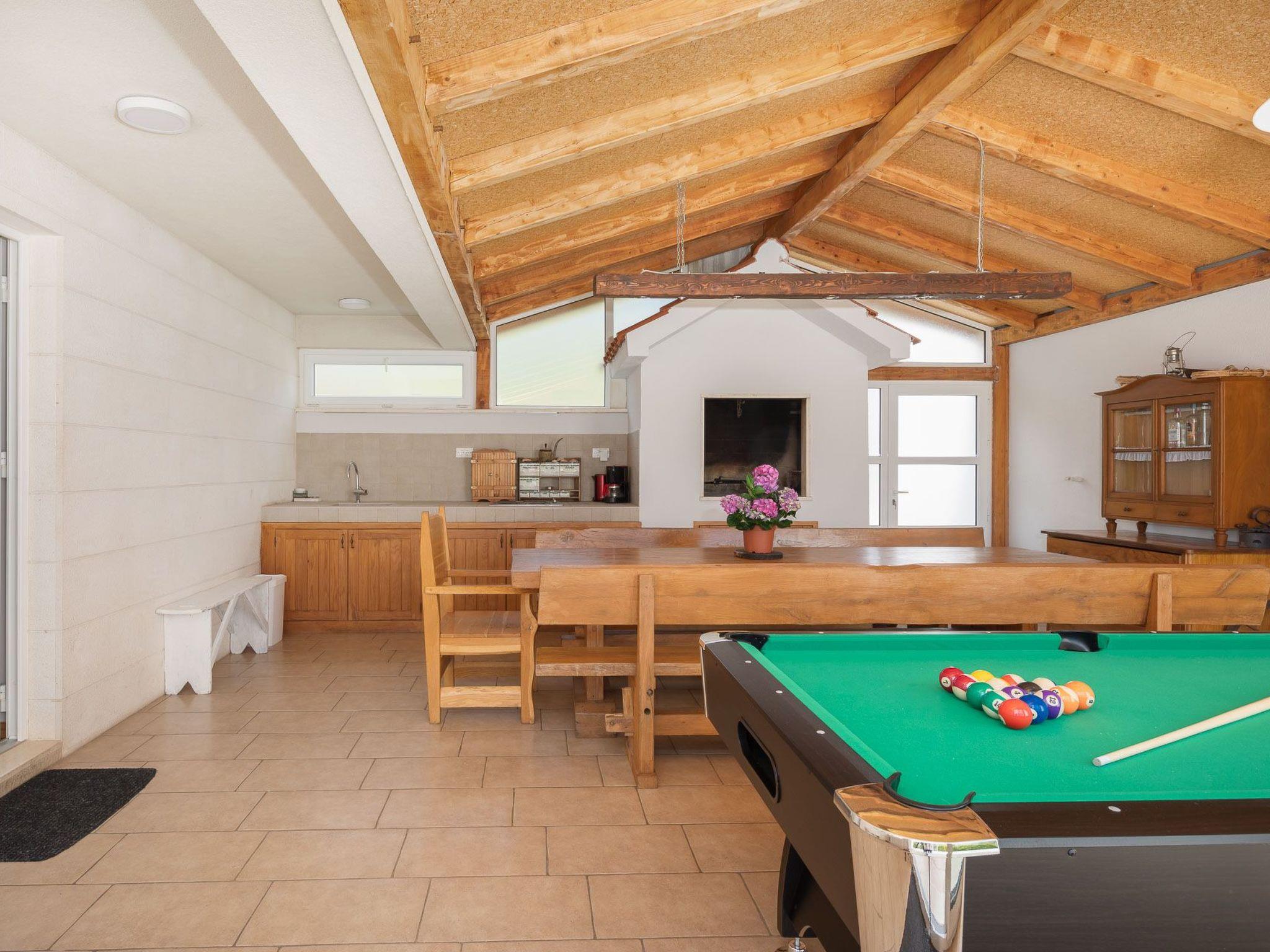 The Villa itself has two wings separated by a summer kitchen, each wing is completely independent, fully air- conditioned, completely equipped with all amenities you might need during your holiday, all together can accommodate 11 people. The summer kitchen is ideal for BBQ dinners „Al fresco“ and large familiy gatherings. The right villa wing on the ground floor has a bathroom, kitchen-dining-living area with direct acces to the terrace by the pool with lounge furniture. On the first floor there are two double bedrooms, each one with balcony and one bedroom for three persons. The left wing on the ground floor has a kitchen, living area with double sofa bed, one bathroom and one double „en suite“ bedroom, ideal for disabled people. On the first floor there is a two single bed bedroom, and a playroom with amusement games (PlayStation).