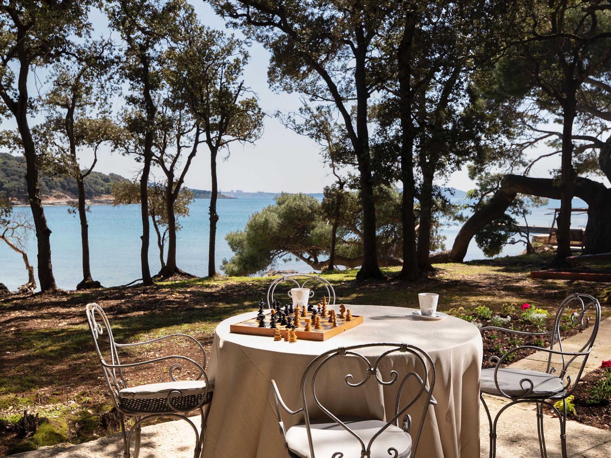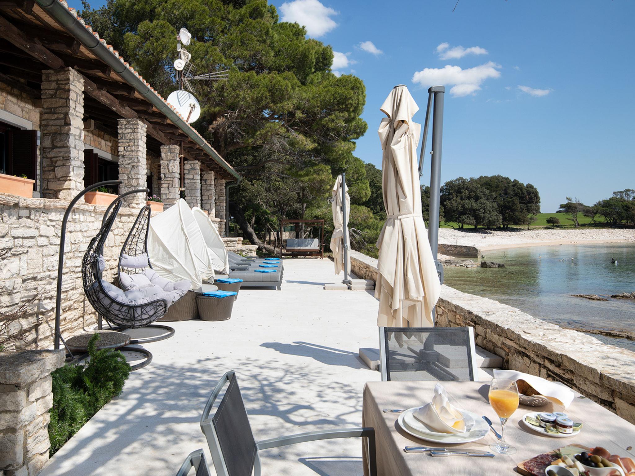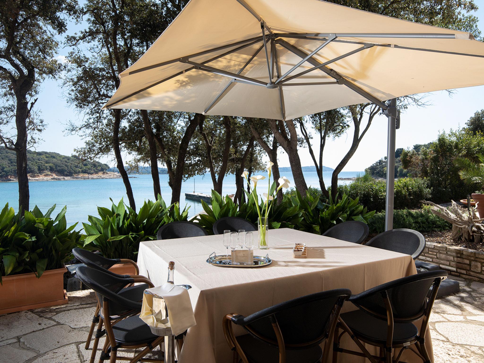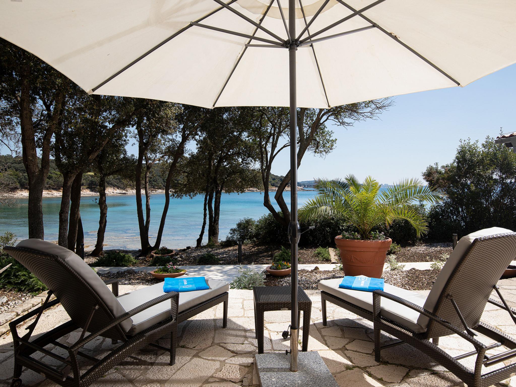 The Villa is located in the National park, The use of electric golf car and cycles is in price included. Available: speedboat for transfer from the land to the island and from the island to the land back. Villa "Lovorka". 3.5 km from the centre of Fažana, 5 m from the beach, direct access to the beach. Private: property 3'335 m2 (fenced). Outdoor shower, private beach, garden furniture, barbecue. In the house: internet access, sauna, hot tub. Room cleaning daily (included). Breakfast (included). Parking (for 2 cars, extra), single garage. E-charging station. Shop 3.5 km, supermarket 3.5 km, restaurant 1 km, bar 1 km, bus stop 3.5 km, pebble beach 5 m. Object suitable for 6 adults. Please note: airfield 10 km from the property.