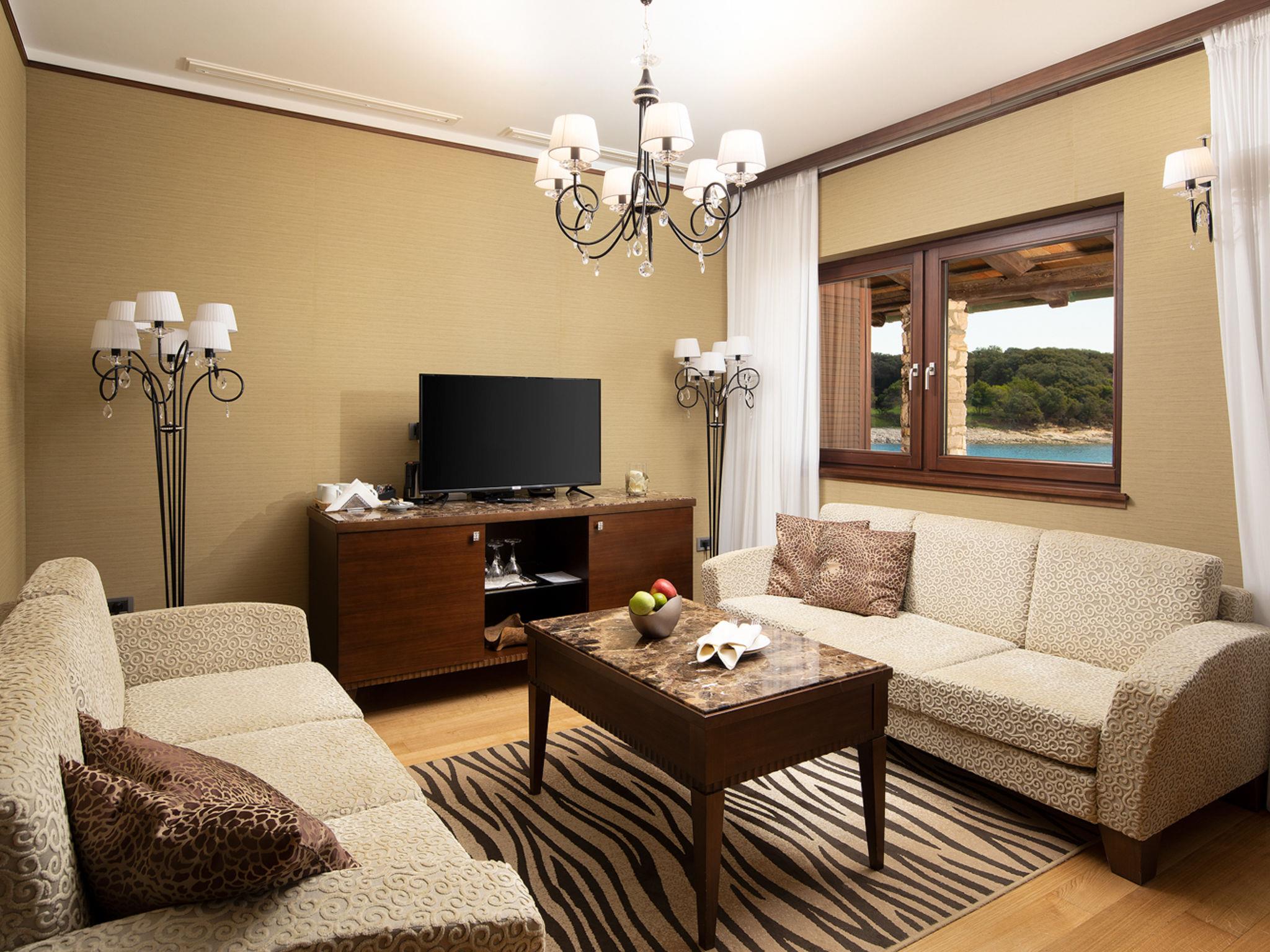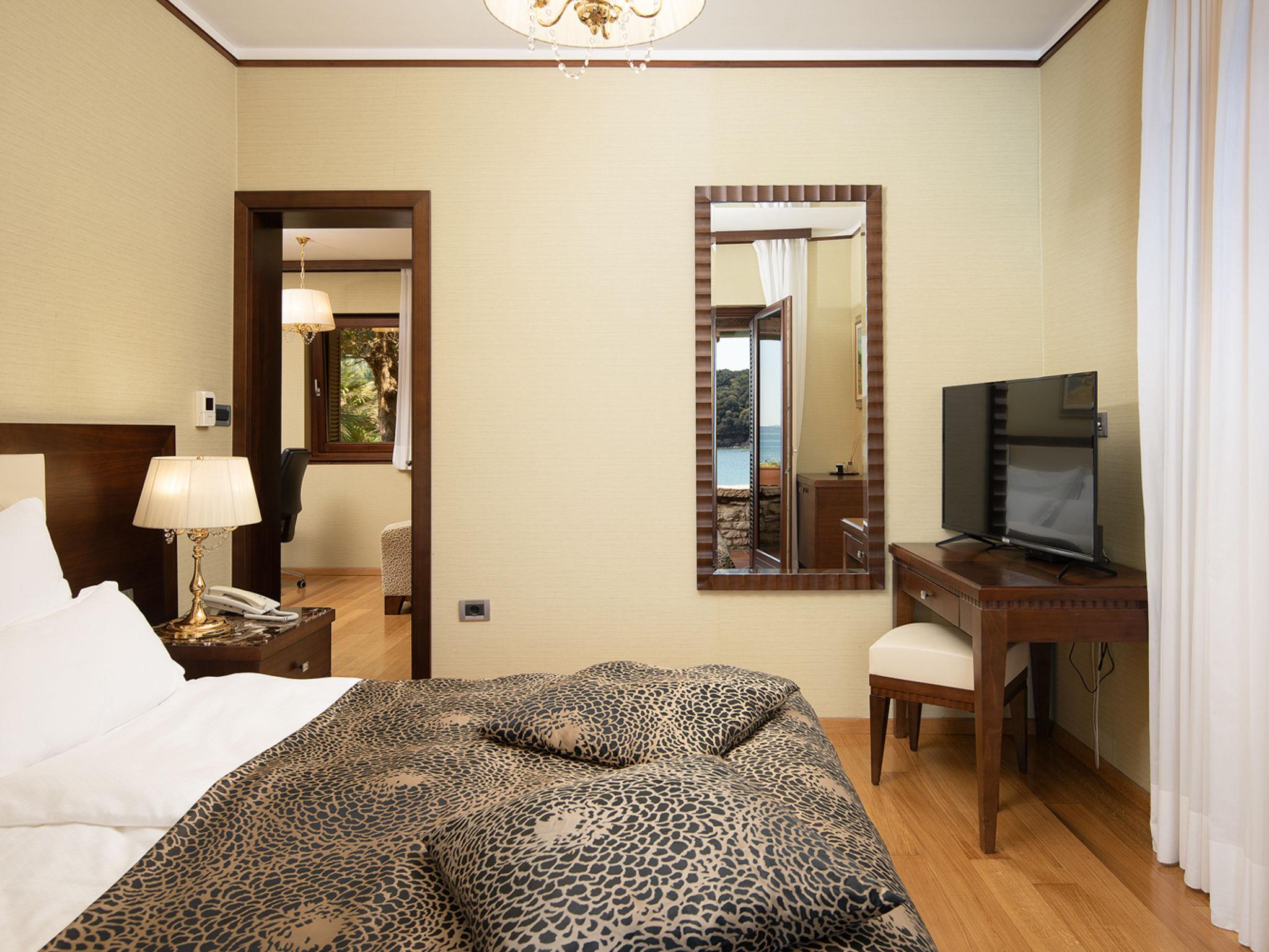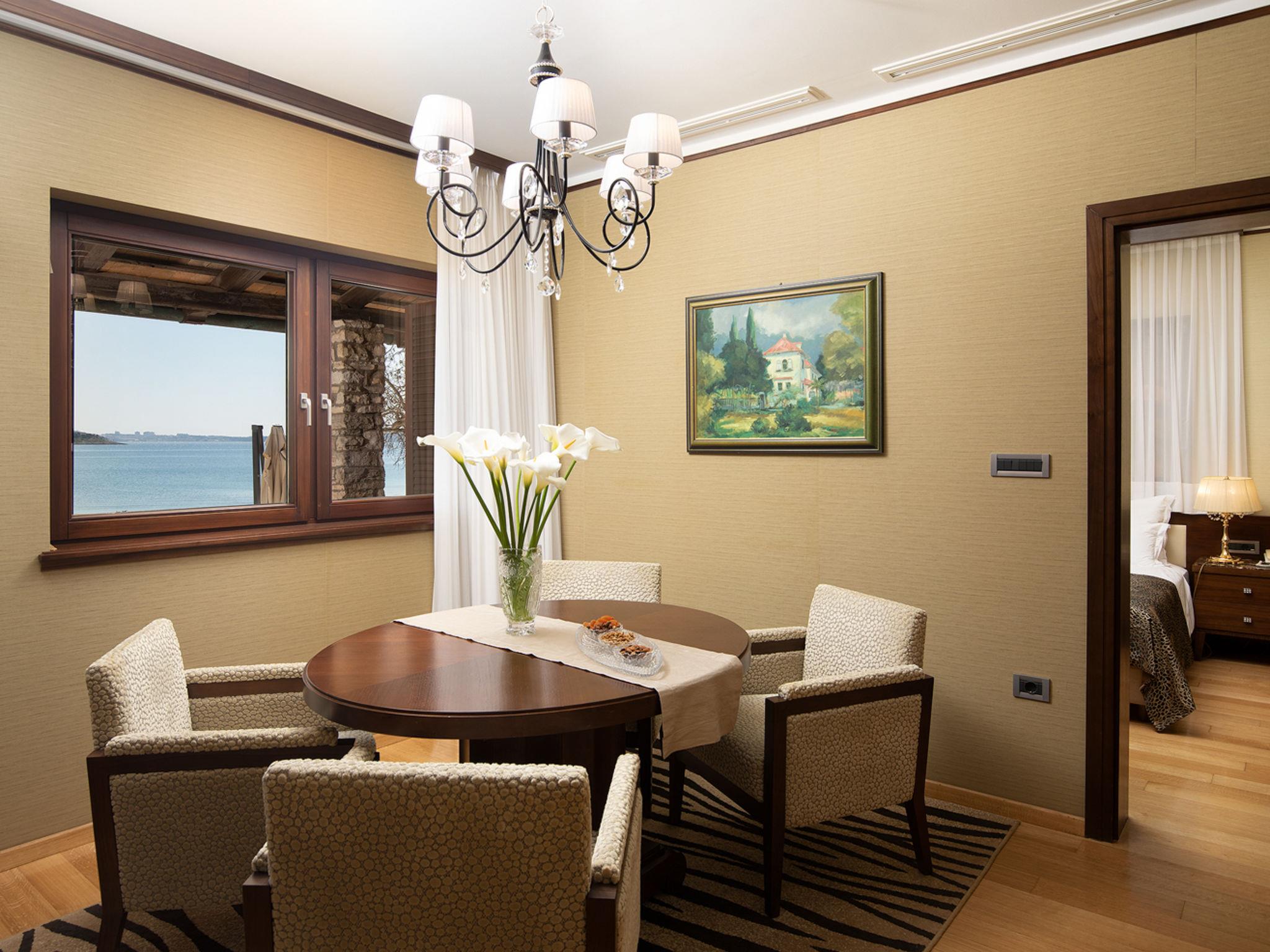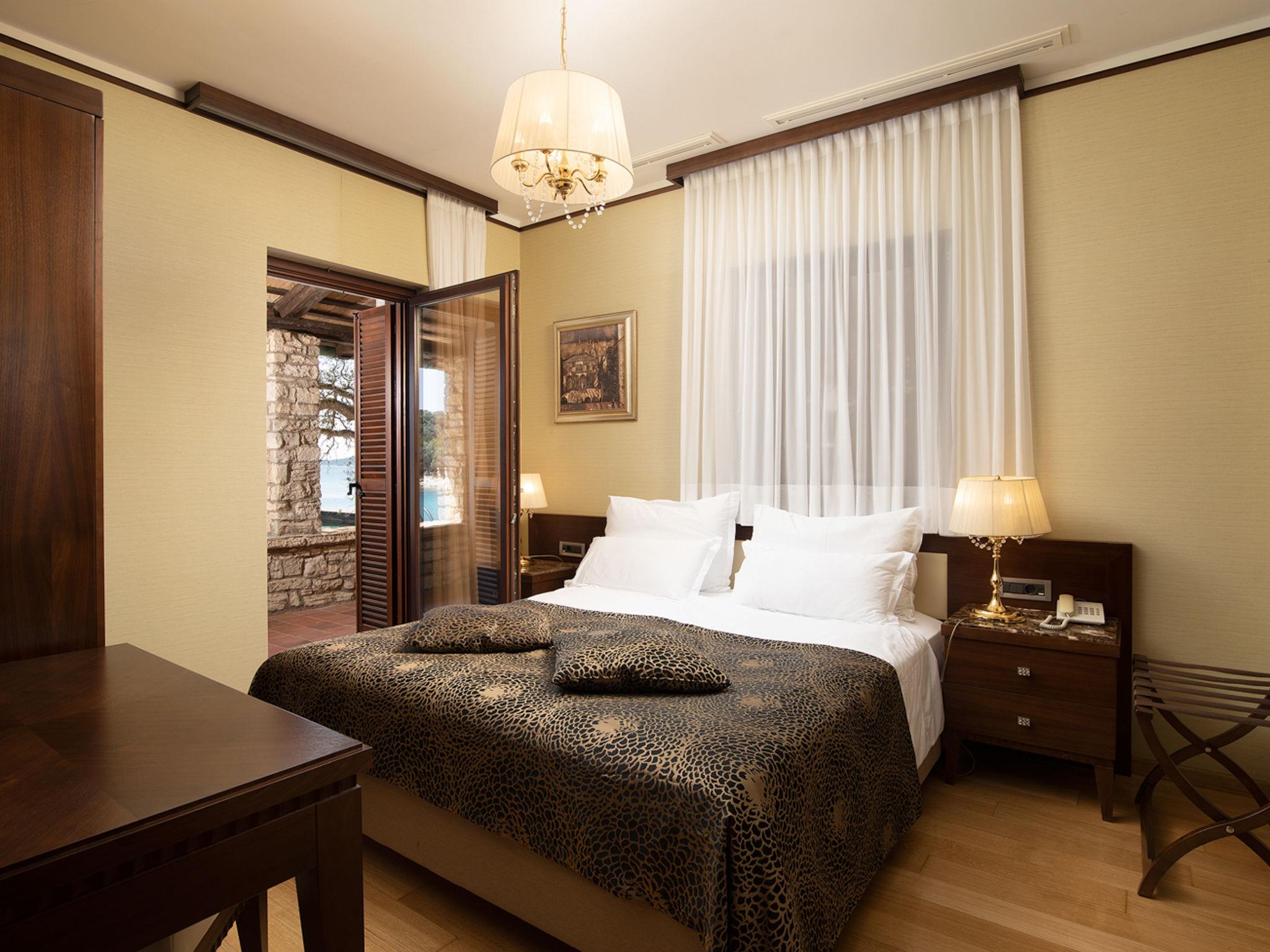 The Villa is located in the National park, The use of electric golf car and cycles is in price included. Available: speedboat for transfer from the land to the island and from the island to the land back. Villa "Lovorka". 3.5 km from the centre of Fažana, 5 m from the beach, direct access to the beach. Private: property 3'335 m2 (fenced). Outdoor shower, private beach, garden furniture, barbecue. In the house: internet access, sauna, hot tub. Room cleaning daily (included). Breakfast (included). Parking (for 2 cars, extra), single garage. E-charging station. Shop 3.5 km, supermarket 3.5 km, restaurant 1 km, bar 1 km, bus stop 3.5 km, pebble beach 5 m. Object suitable for 6 adults. Please note: airfield 10 km from the property.