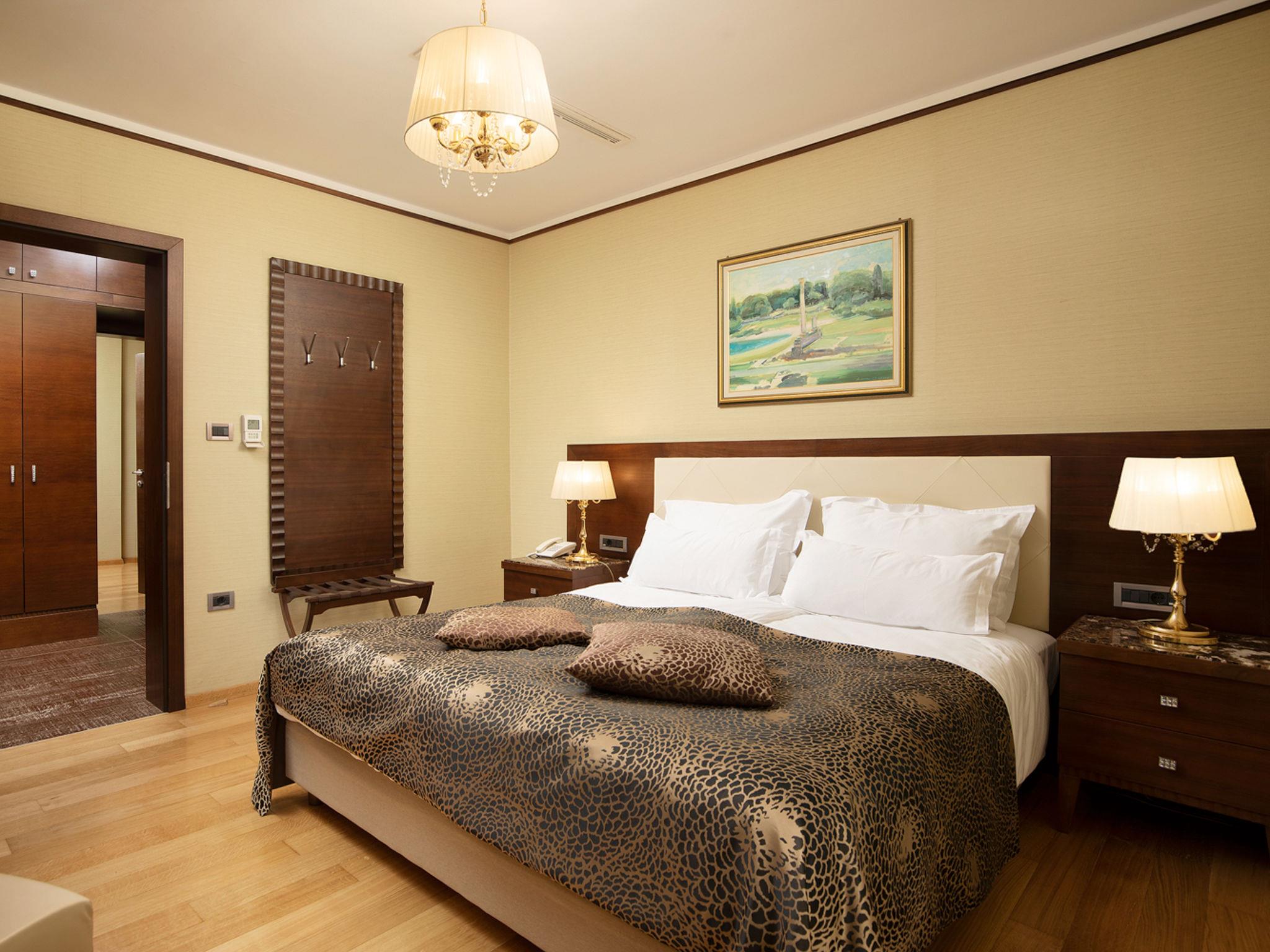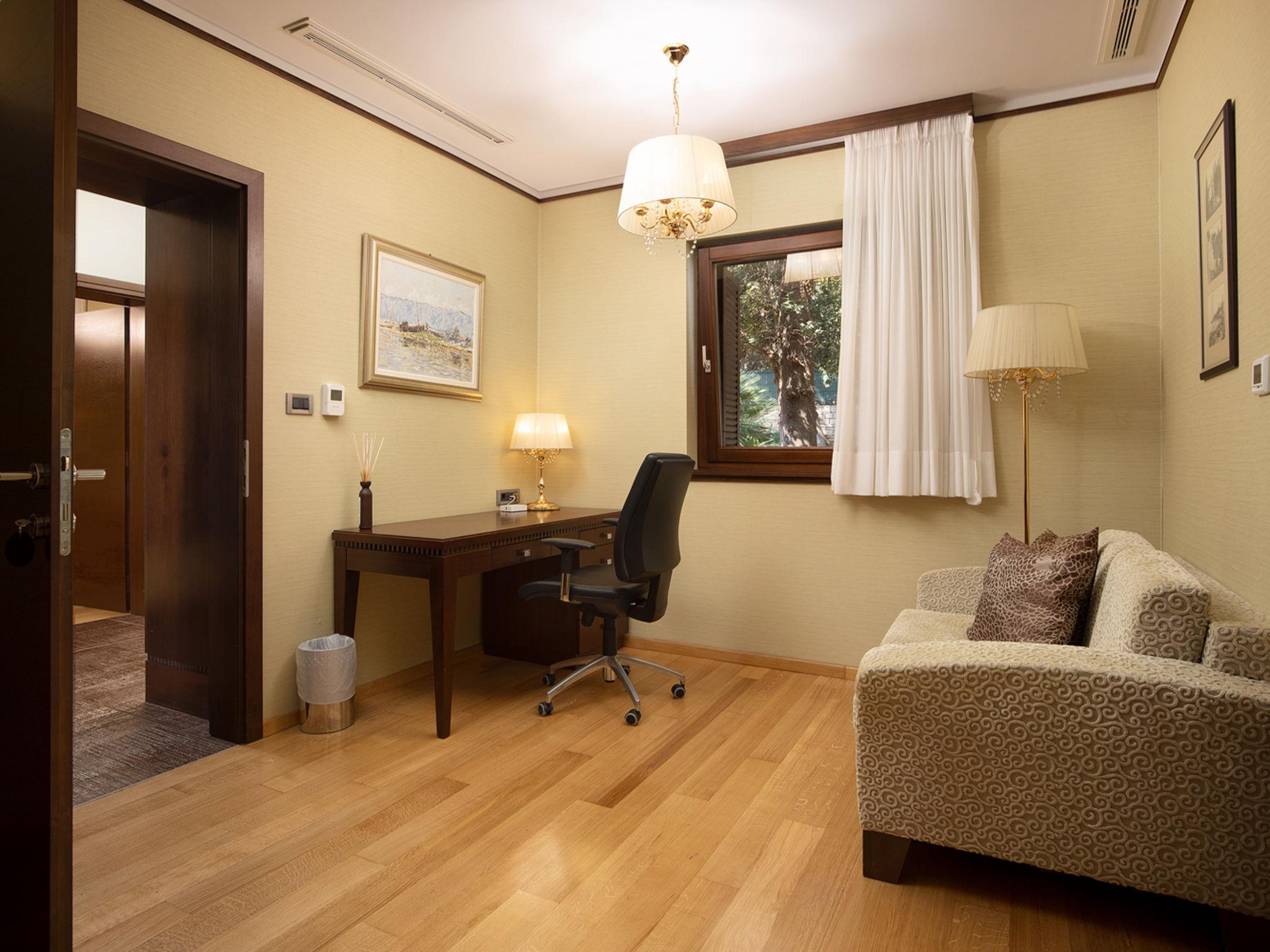 4-room villa 350 m2. Comfortable and modern furnishings: living/dining room with satellite TV (flat screen), air conditioning. Exit to the terrace. 2 rooms, each room with 1 french bed (180 cm, length 200 cm), shower/WC and satellite TV (flat screen). Exit to the terrace. 1 room with 1 french bed (180 cm, length 200 cm), bidet, bath/shower/WC and satellite TV (flat screen). Exit to the terrace. Open kitchen (oven, dishwasher, 4 ceramic glass hob hotplates, microwave, freezer, electric coffee machine). Sep. WC. Terrace 50 m2, roofed. Terrace furniture, barbecue, deck chairs. Beautiful view of the sea. Facilities: Internet (WiFi, free). Please note: maximum 1 pet/ dog allowed. Fire extinguisher.