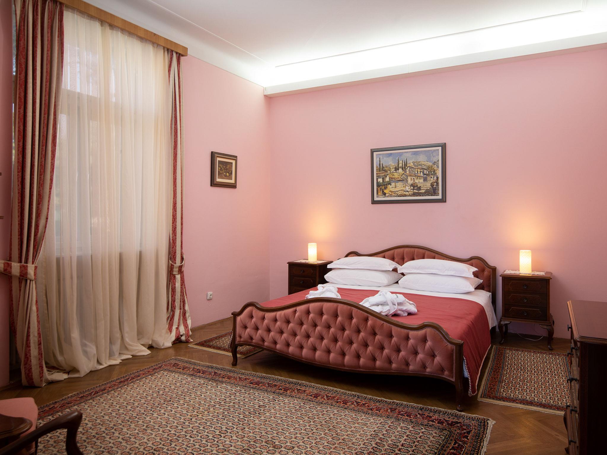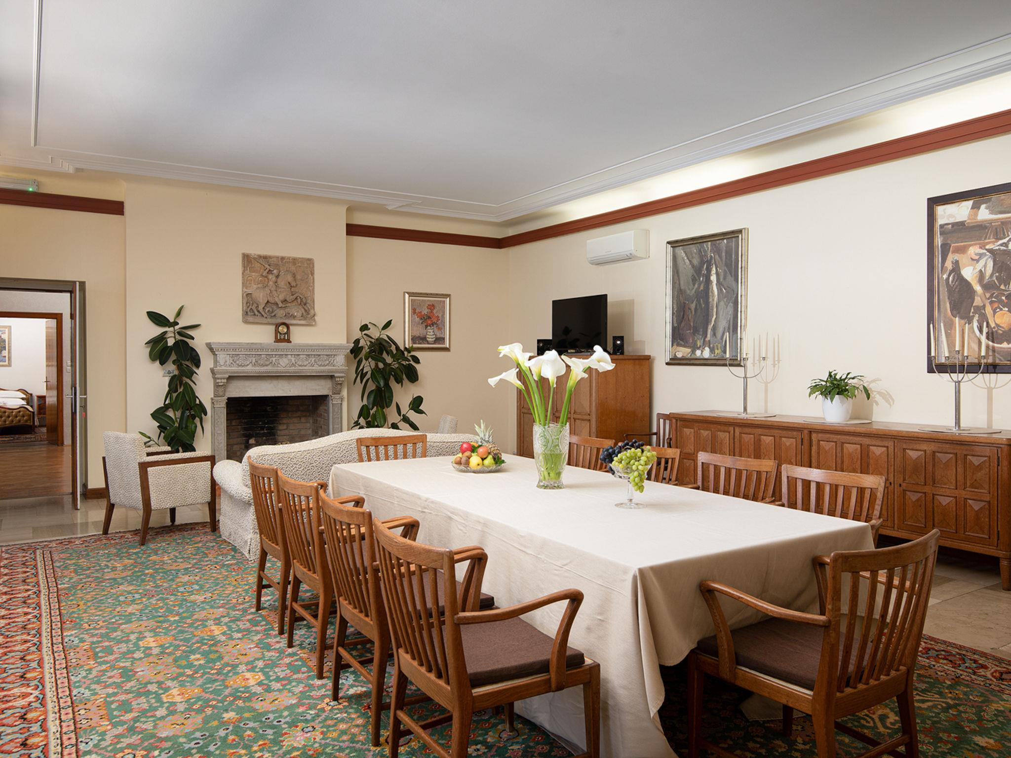 5-room villa 310 m2. Comfortable and antique furnishings: living/dining room with satellite TV (flat screen), air conditioning. Exit to the terrace. 1 room with 1 french bed (180 cm, length 200 cm), bidet, shower/WC and satellite TV (flat screen). 3 rooms, each room with 1 french bed (180 cm, length 200 cm), satellite TV (flat screen). Open kitchen (oven, dishwasher, 4 ceramic glass hob hotplates, microwave, freezer, electric coffee machine). Bath/WC. Terrace 50 m2, roofed. Terrace furniture, barbecue, deck chairs. Beautiful view of the sea. Facilities: Internet (WiFi, free). Please note: maximum 1 pet/ dog allowed. Fire extinguisher.