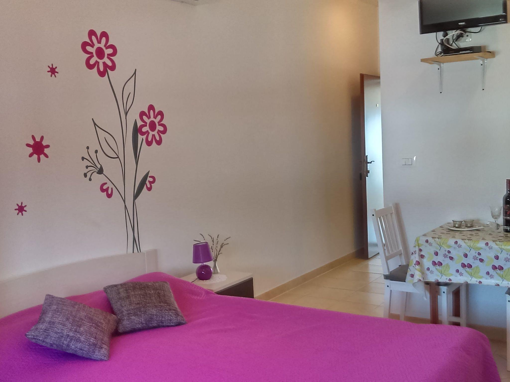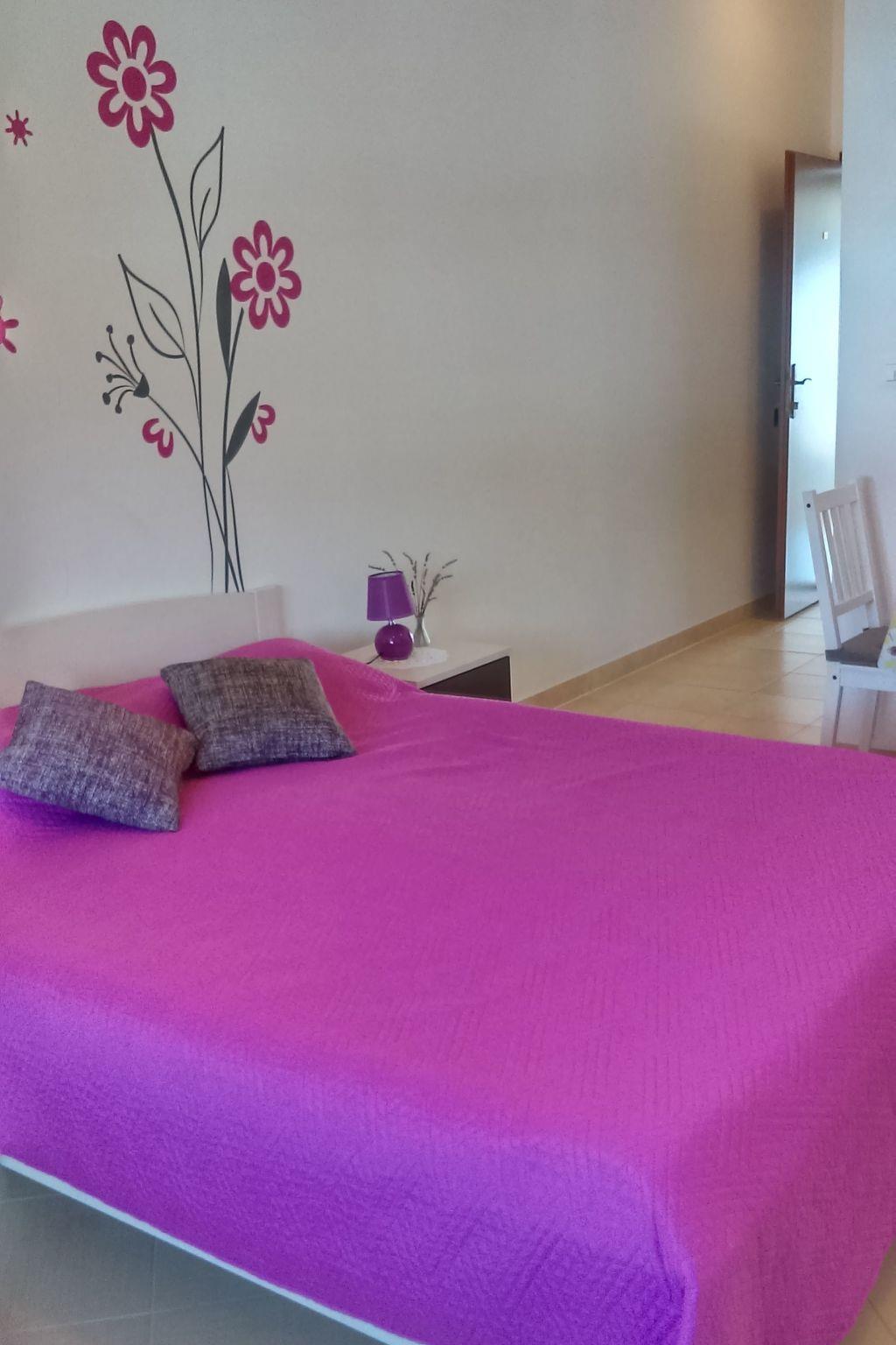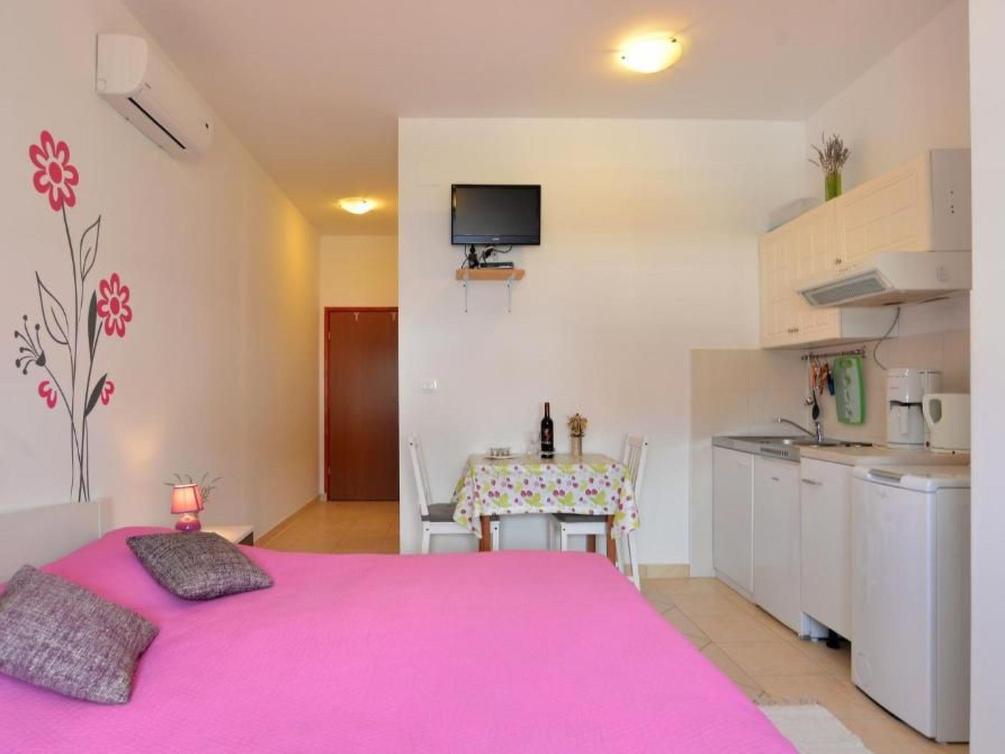 This studio flat is located on the second floor of the apartment block. It has a double bed, a mini-kitchen with dining table, air conditioning, TV and WiFi internet as well as a bathroom with shower.