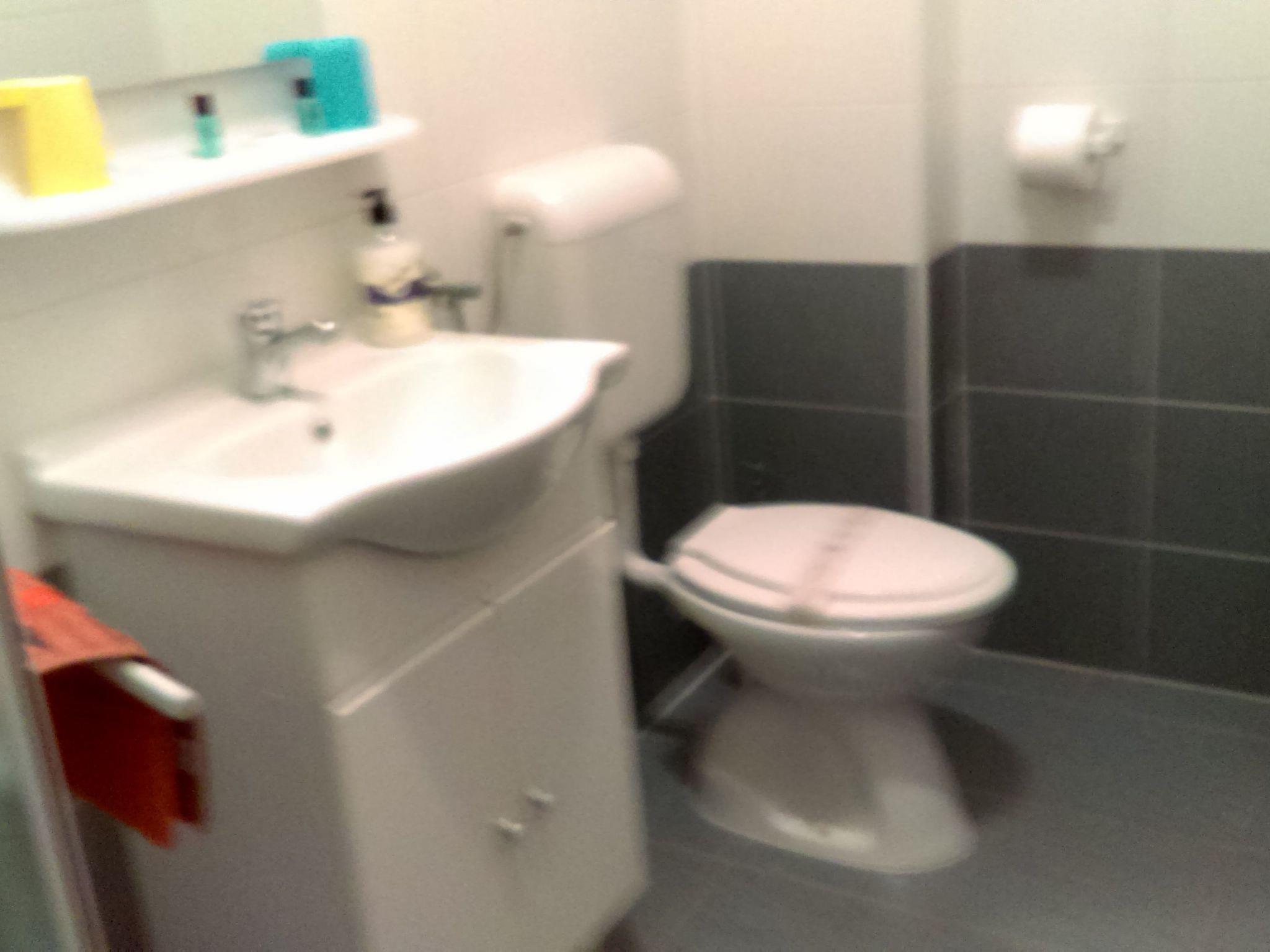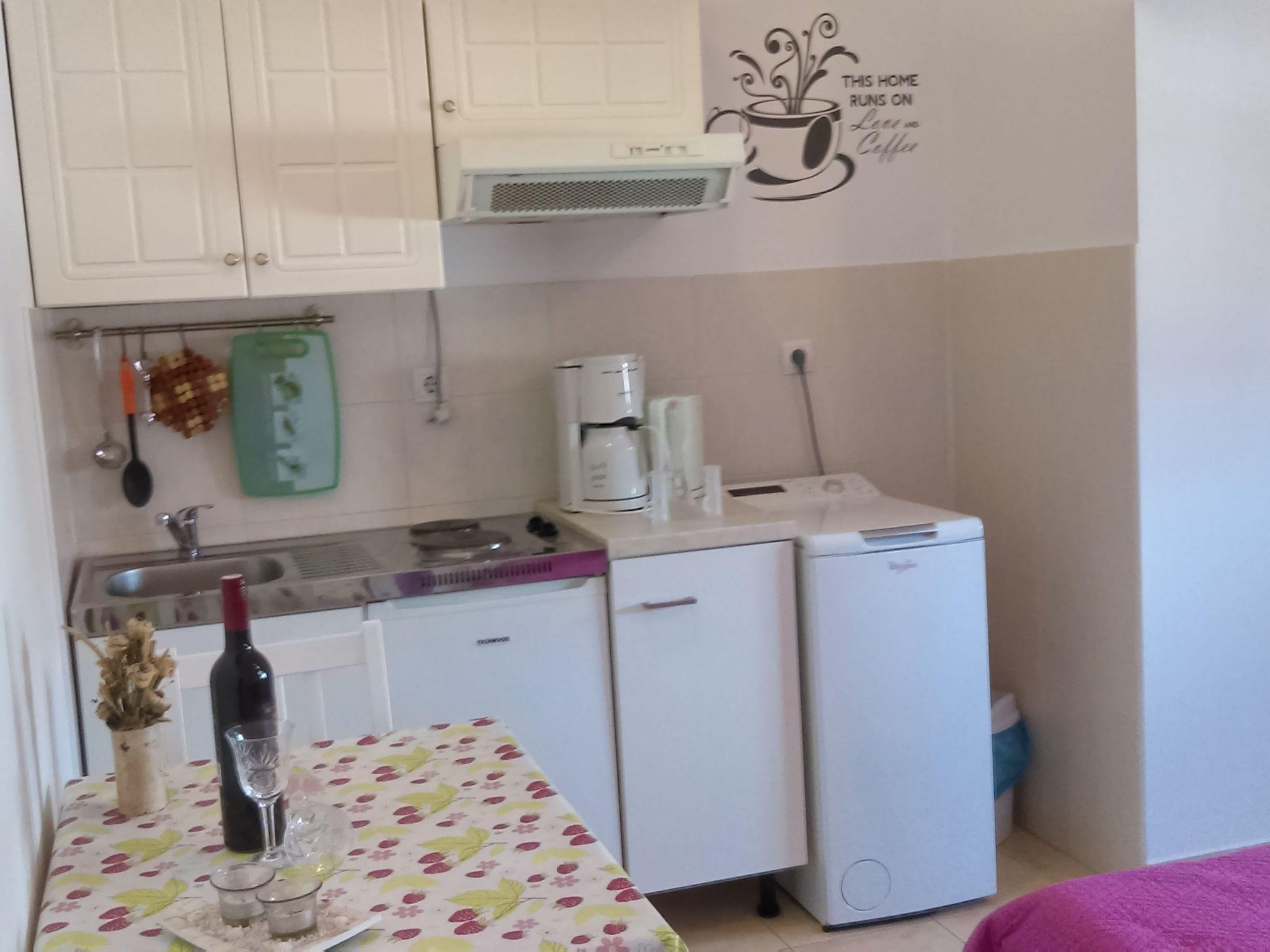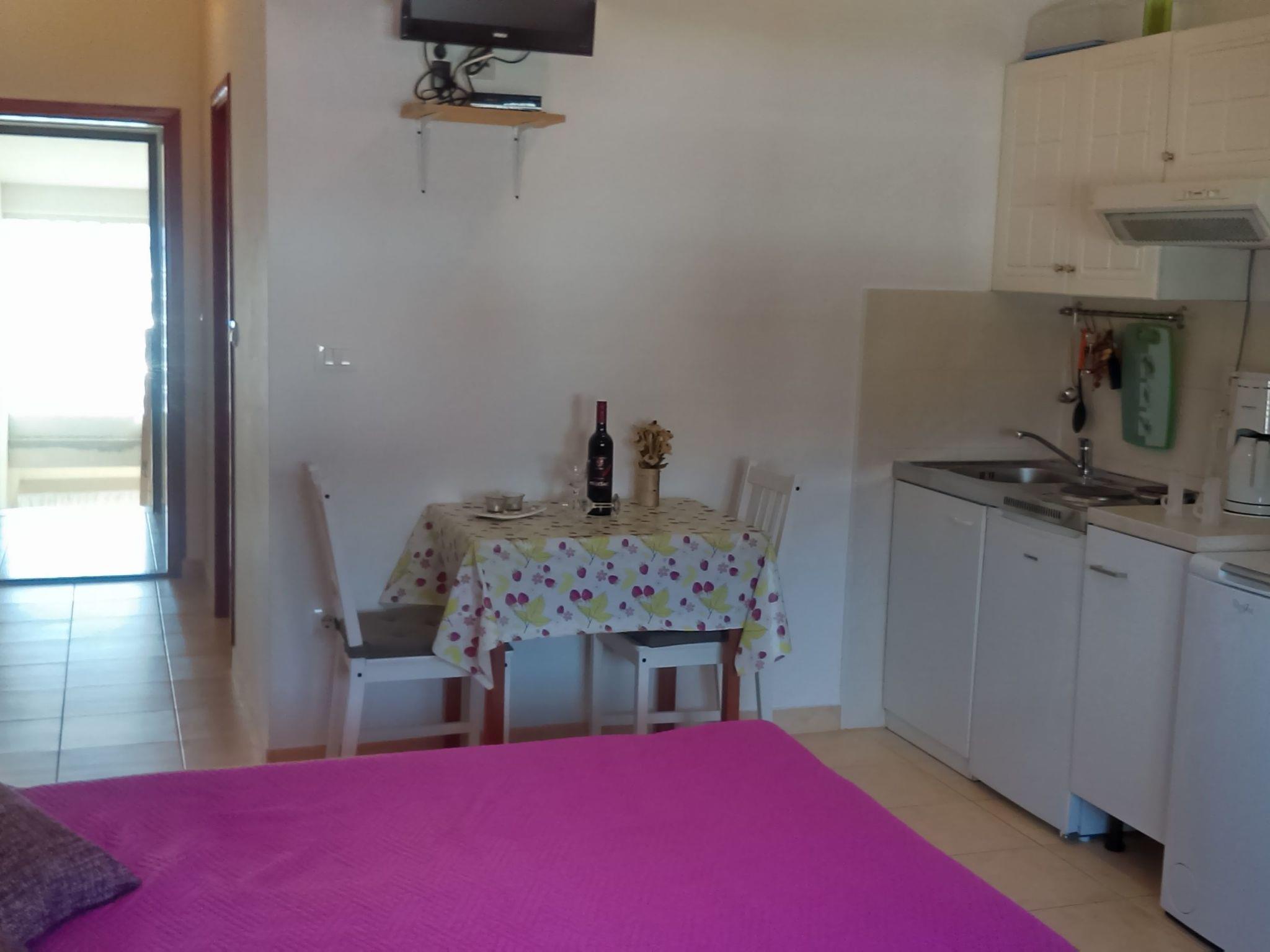 This studio flat is located on the second floor of the apartment block. It has a double bed, a mini-kitchen with dining table, air conditioning, TV and WiFi internet as well as a bathroom with shower.
