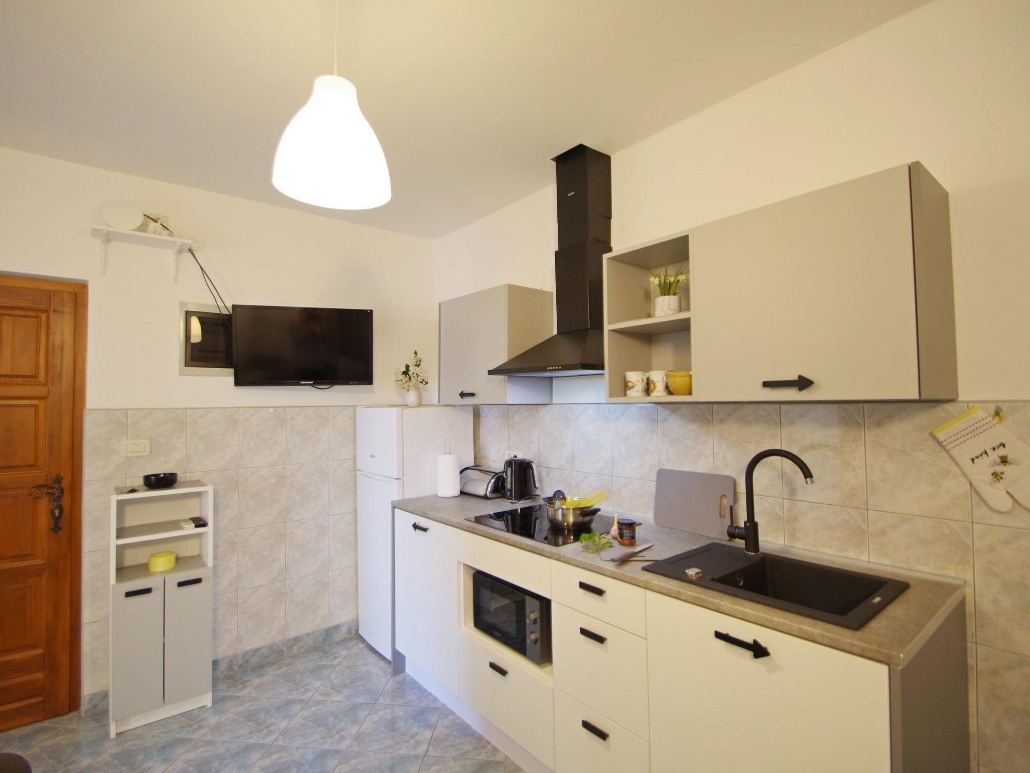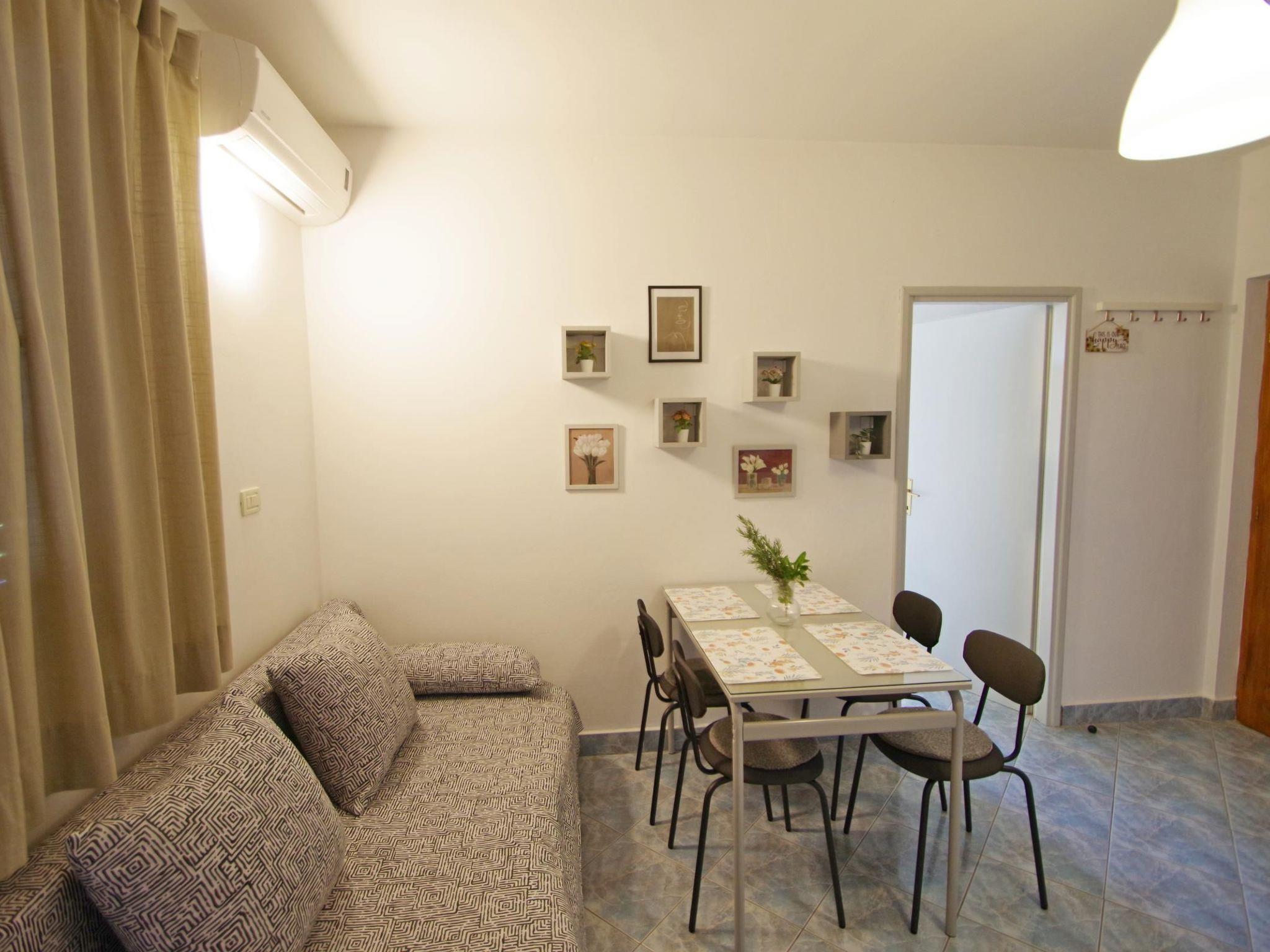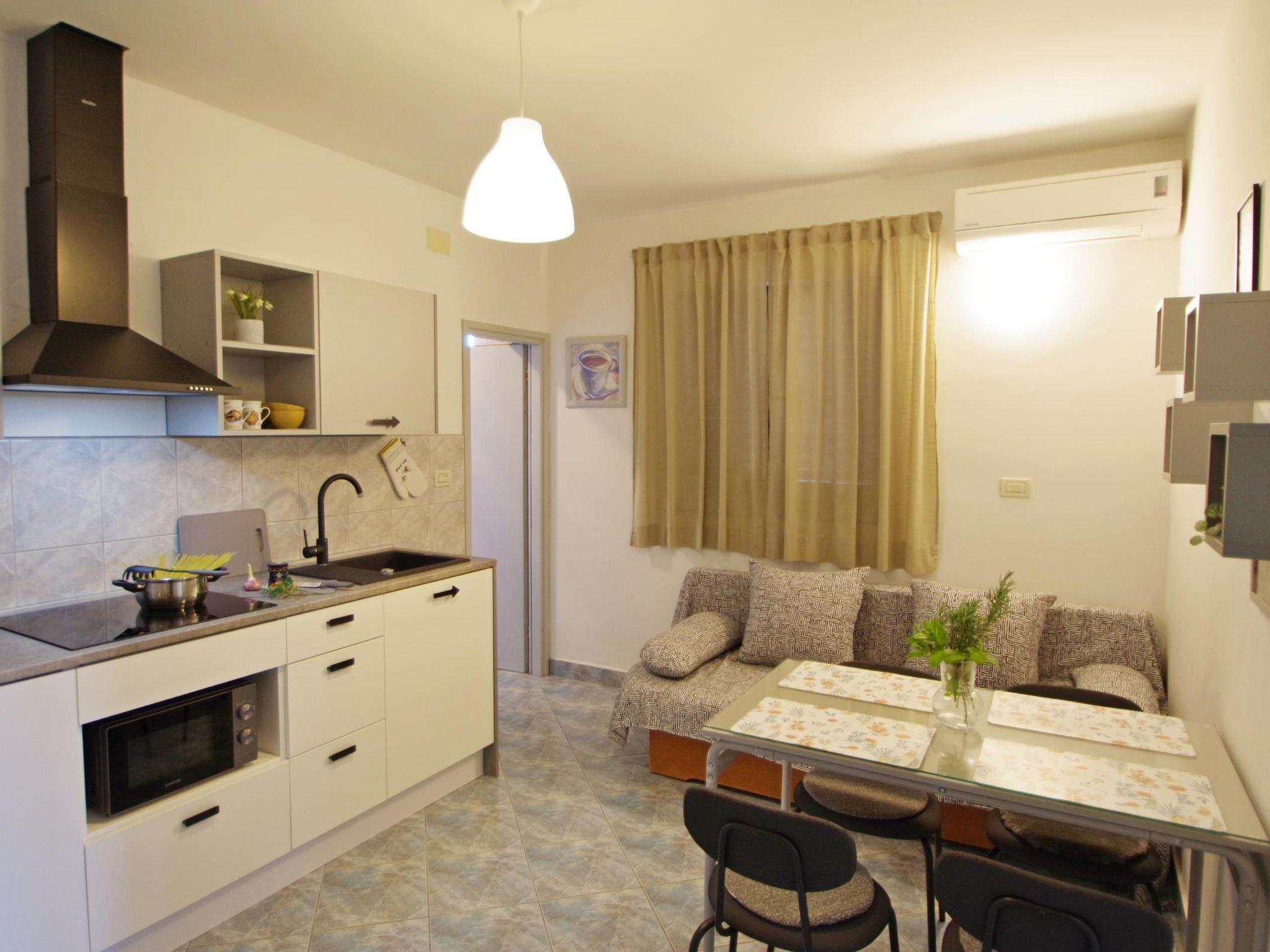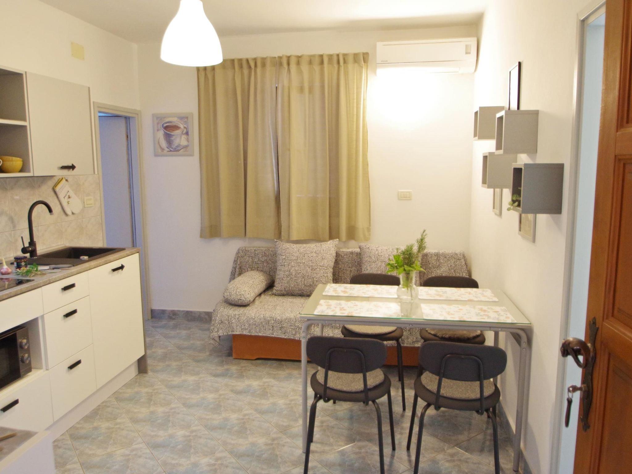 Inside, "Apartment Blue" features a welcoming living room equipped with a comfortable sitting/sleeping couch for two and an open kitchen that includes a dining table for enjoyable meal times. The kitchen is well-appointed with a stove, microwave, refrigerator with a freezing compartment, coffee machine and moka, cooking and eating utensils, toaster, and kettle, ensuring you have everything you need to prepare your favorite dishes. The master bedroom offers a cozy double bed, and the bathroom is complete with a shower, WC, and washbasin, making your stay as comfortable as possible.