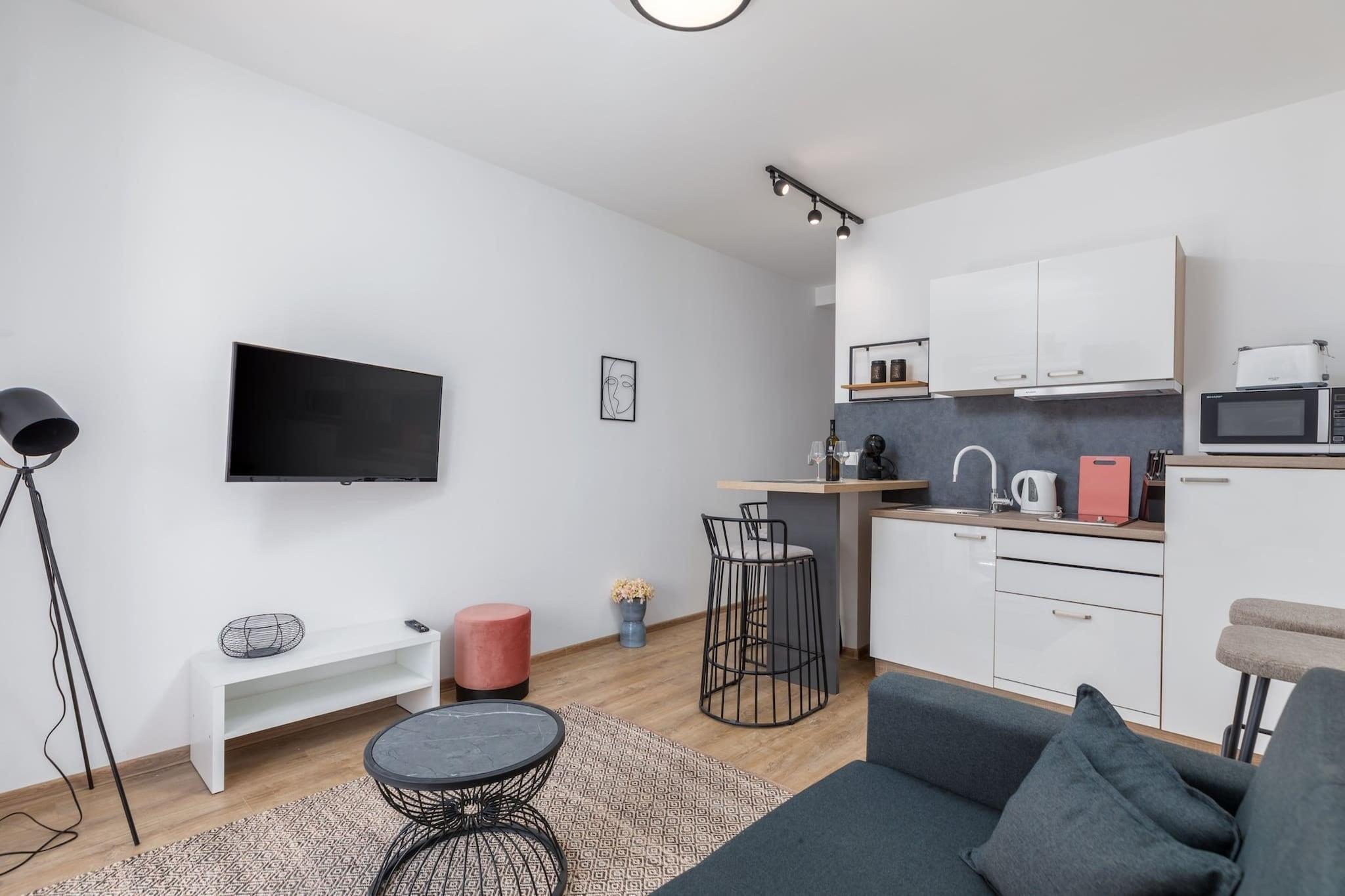 Denne moderne lejlighed er ideel til familier og tilbyder et behageligt ophold for op til 4 personer, med maksimalt 2 voksne og 2 børn. Lejligheden har et soveværelse med en queensize-seng, en sovesofa i opholdsstuen, et badeværelse, et fuldt udstyret køkken og en spiseplads. En rummelig balkon giver gæsterne mulighed for at nyde den friske luft. Ejendommen er fuldt klimatiseret, hvilket sikrer et behageligt ophold året rundt. Gæsterne har også adgang til en stor fælles have på over 2000 m² med swimmingpool, grillfaciliteter og masser af plads til at slappe af. Barnesenge er tilgængelige efter anmodning, hvilket gør det bekvemt for familier med små børn. Lejligheden ligger i Valbandon, kun 900 meter fra stranden og 600 meter fra en købmand. Fažana, en lille kystby kendt for sin smukke arkitektur og familievenlige strand, ligger også i nærheden. Besøgende kan udforske den fantastiske nationalpark Brijuni ved at tage en båd fra Fažana. Området byder på masser af muligheder for udendørs aktiviteter, herunder vandre- og cykelture, med nem adgang til lokale caféer, restauranter og attraktioner. Pula, med sine historiske steder og pulserende kulturscene, er en kort køretur væk. Lejligheden har et veludstyret køkken med alle de nødvendige apparater til et ophold med egen forplejning, herunder køleskab, komfur og ovn. Yderligere faciliteter omfatter gratis Wi-Fi, aircondition og privat udendørs parkering. For dem med kæledyr tager lejligheden imod dyr mod et ekstra gebyr, undtagen for farlige dyr. Der opkræves et rengøringsgebyr ved ankomsten, og cykelentusiaster har mulighed for at opbevare cykler.