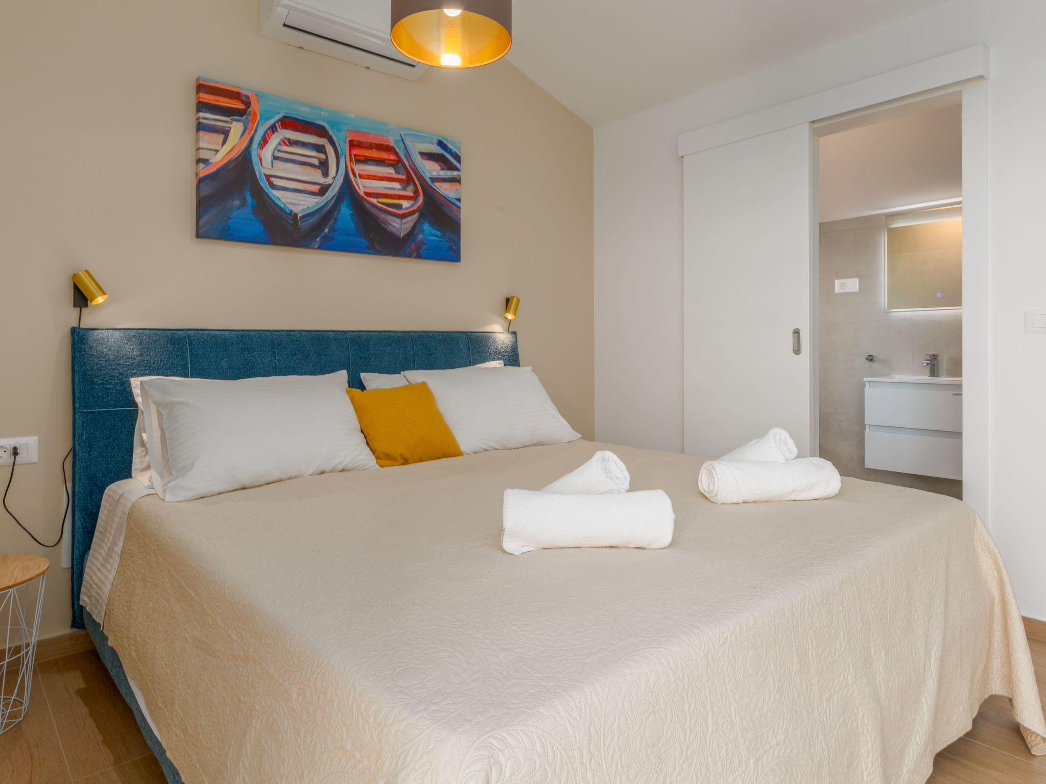 The interior of the villa leaves nothing to be desired. On 147 m² of living space, spread over two air-conditioned floors, up to 6 people will find their holiday home in modernly furnished rooms. On the cosy ground floor, the living room with a fully equipped kitchen, a dining area and direct access to the covered terrace invites you to linger. A double bedroom with shower/WC and a separate WC round off the rooms on offer. On the upper floor, guests will find two further double bedrooms, each with a private shower/WC and a shared terrace with breathtaking panoramic views of the sea.