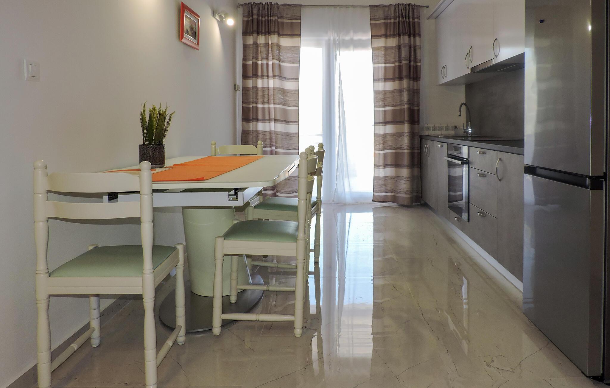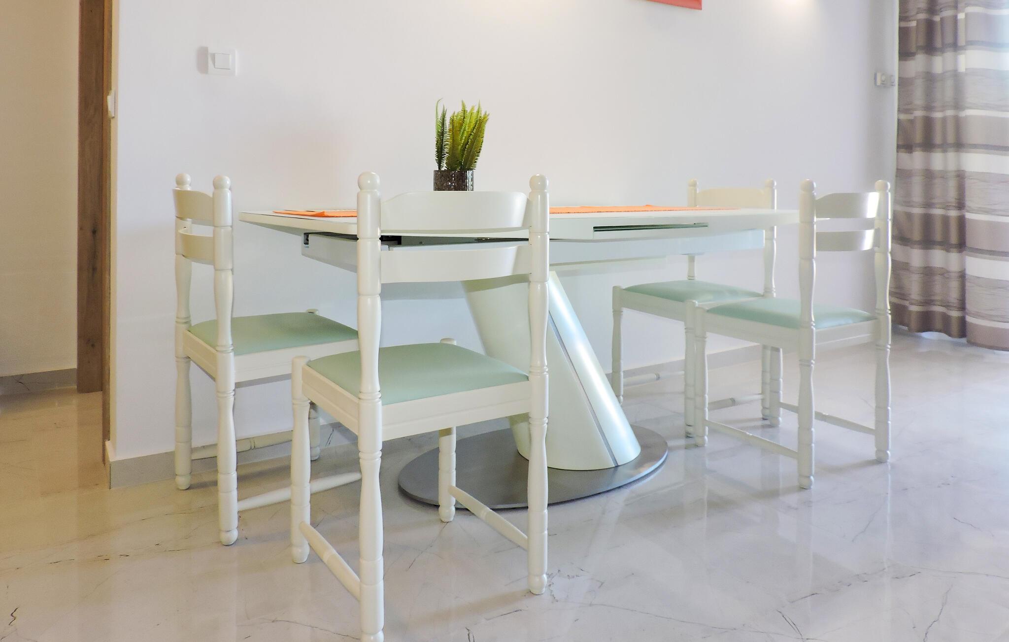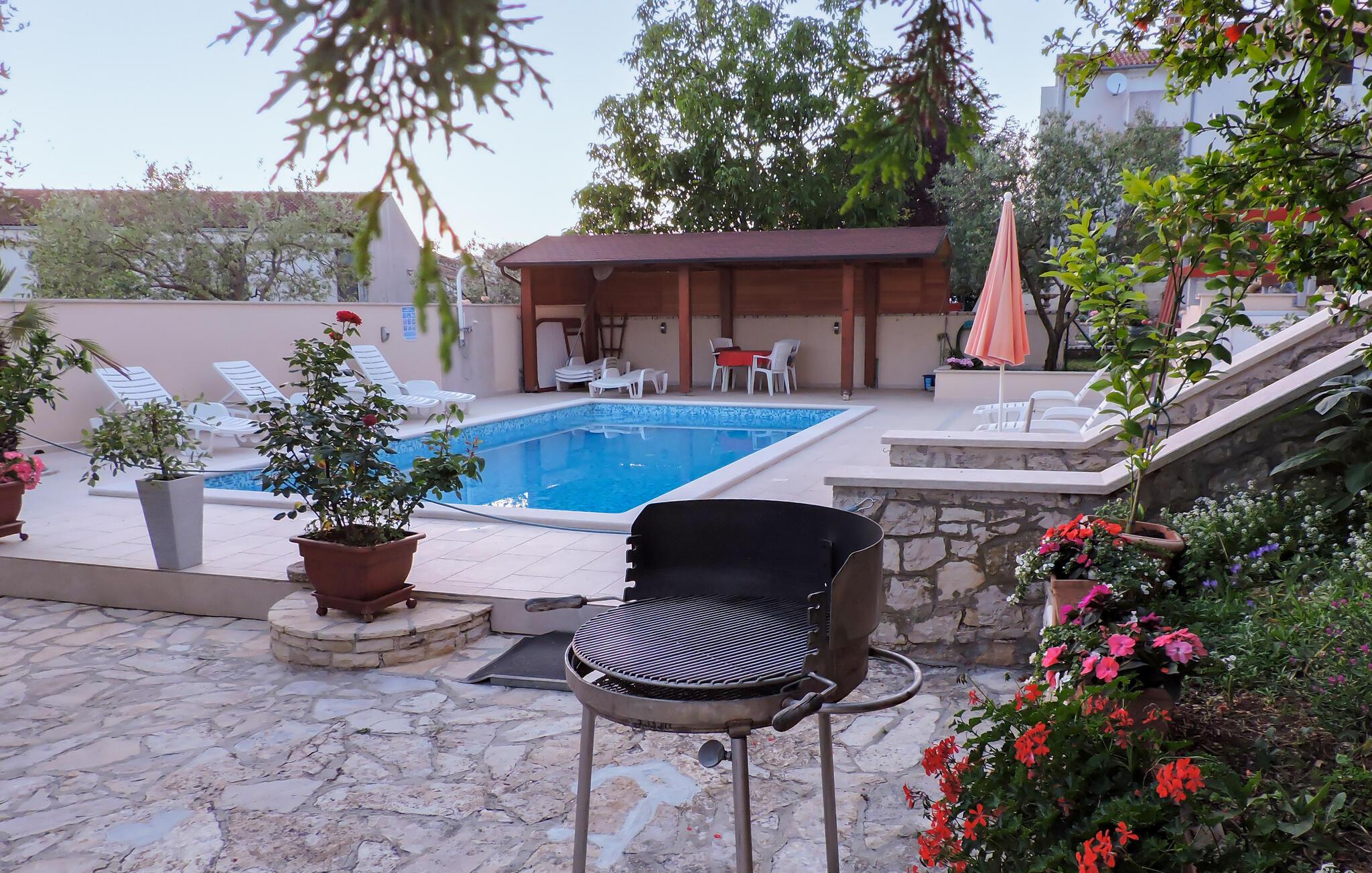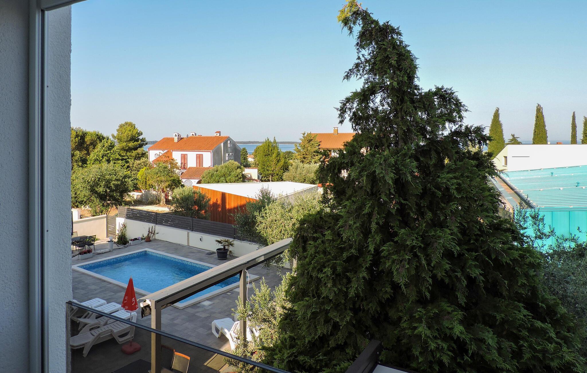 Nyd en solrig ferie i denne lejlighed med havudsigt og adgang til poolen. Velkommen til denne lyse og smagfuldt møblerede lejlighed, ideelt beliggende nær charmerende destinationer til afslappende dage med familien eller venner. Tilbered jeres yndlingsmåltider og planlæg jeres udflugter til afslappende middage. Efter en begivenhedsrig dag kan I slappe af med en spilleaften eller fordybe jer i en god bog på den behagelige sofa. Nyd jeres første kaffe på altanen og glæd jer til en lang dag under den blå himmel, mens I kigger ud over havet. Forfrisk jer selv i den fælles pool og forkæl jer selv med afslappende siestaer på liggestolene. Udforsk Brijuni Nationalpark med båd og nyd gåture gennem middelhavslandskaber og historiske udgravninger. Slentr gennem den romerske gamle bydel i Pula og besøg amfiteatret. Cykl langs kysten til Barbariga, svøm ved strandene i Valbandon og smag kroatiske specialiteter på en hyggelig taverna i Rovinj.