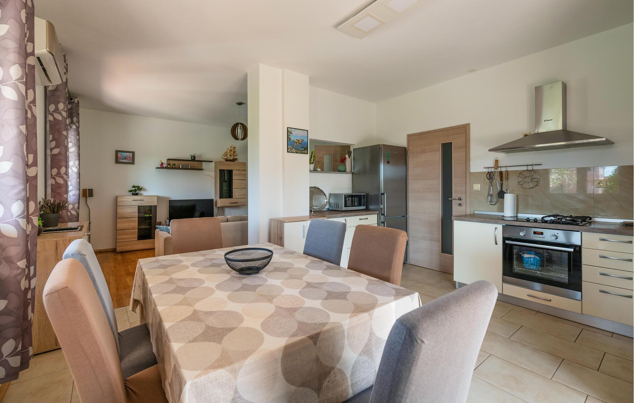 Velkommen til Istrien, hvor dette indbydende hus, der ligger i rolige, naturskønne omgivelser, danner rammen om en ferie spækket med dejlige oplevelser. Huset er smagfuldt indrettet med behagelige farveskalaer, gode møbler og fine faciliteter, der gør det nemt at slappe af efter en begivenhedsrig feriedag. Kræs om livretterne i køkkenet og servér dem ved spisebordet, inden I hiver brætspillene frem eller rykker over i sofaerne med snacks og en god film på tv'et.