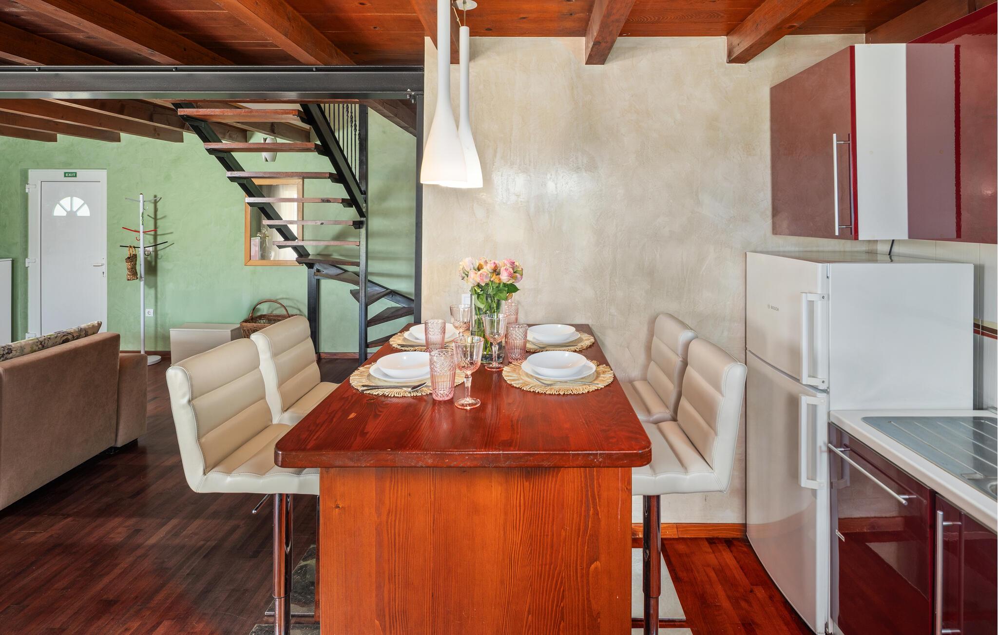 På øverste etage, hvor loftet har en minimumshøjde på ca. 140 cm, er der to soveværelser, hvoraf det ene er et gennemgangsrum, mens der i stueetagen er en stue med køkken og badeværelse. Stuen fører til en overdækket terrasse, hvor du kan spise ude med familien og slappe af med et godt glas vin om aftenen. I mellemtiden kan dine børn lege uforstyrret i den indhegnede have.