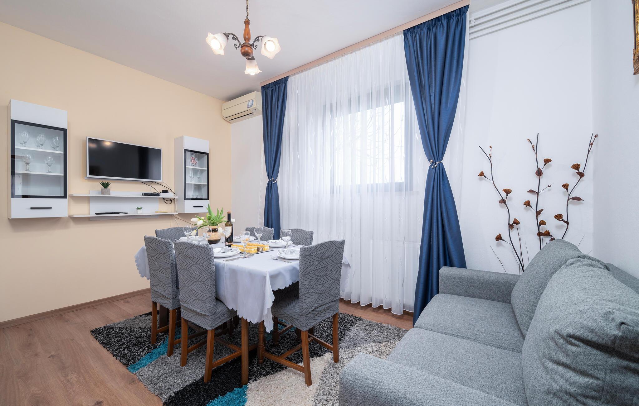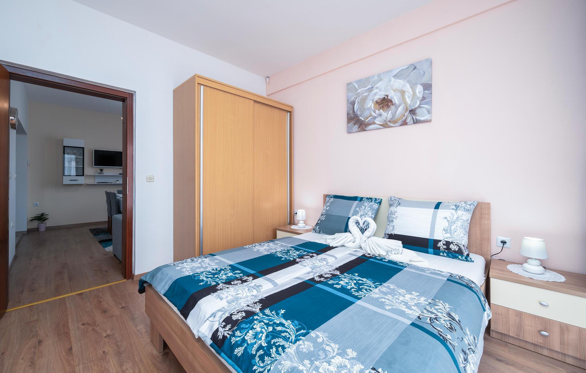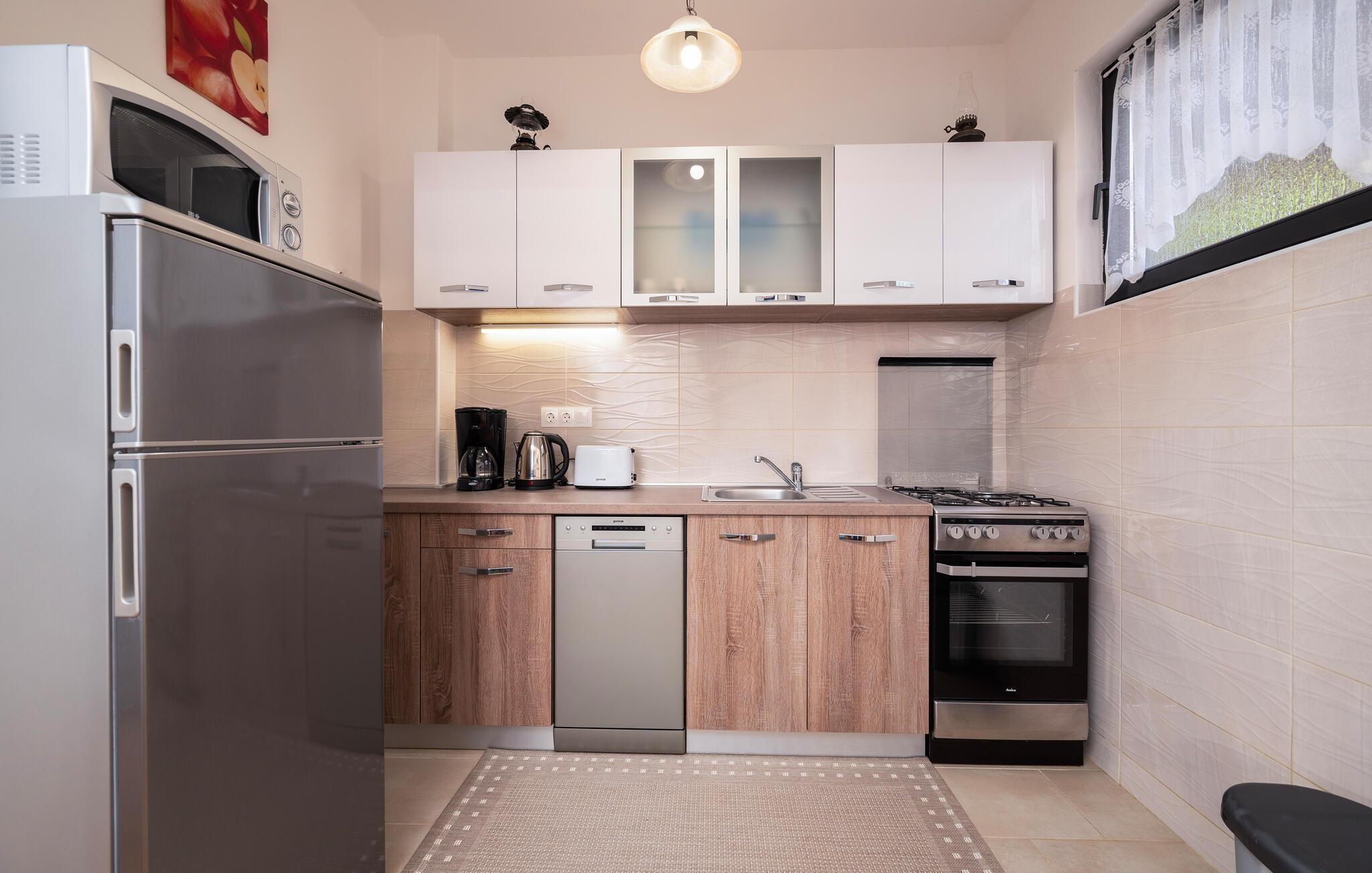 Lejligheden tilbyder den nødvendige komfort og består af tre soveværelser og to badeværelser. Den store have er ideel til ubekymret leg for de små. Nyd terrassen, mens I forbereder grillede retter eller drikker et glas god isstrisk vin som den berømte Malvasia eller Teran. I nærheden finder I fremragende restauranter og taverner, hvor I har den unikke mulighed for at smage fine traditionelle specialiteter og nyde uforglemmelige istriske smag. Udforsk området, besøg nærliggende Fažana og deltag i de mange begivenheder, der finder sted i sommermånederne.