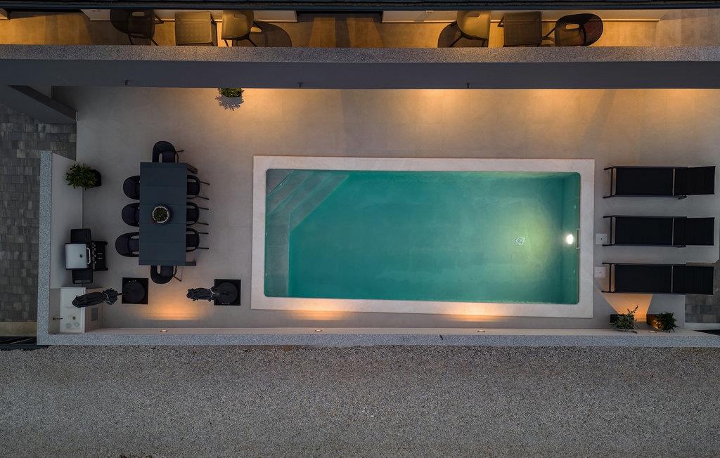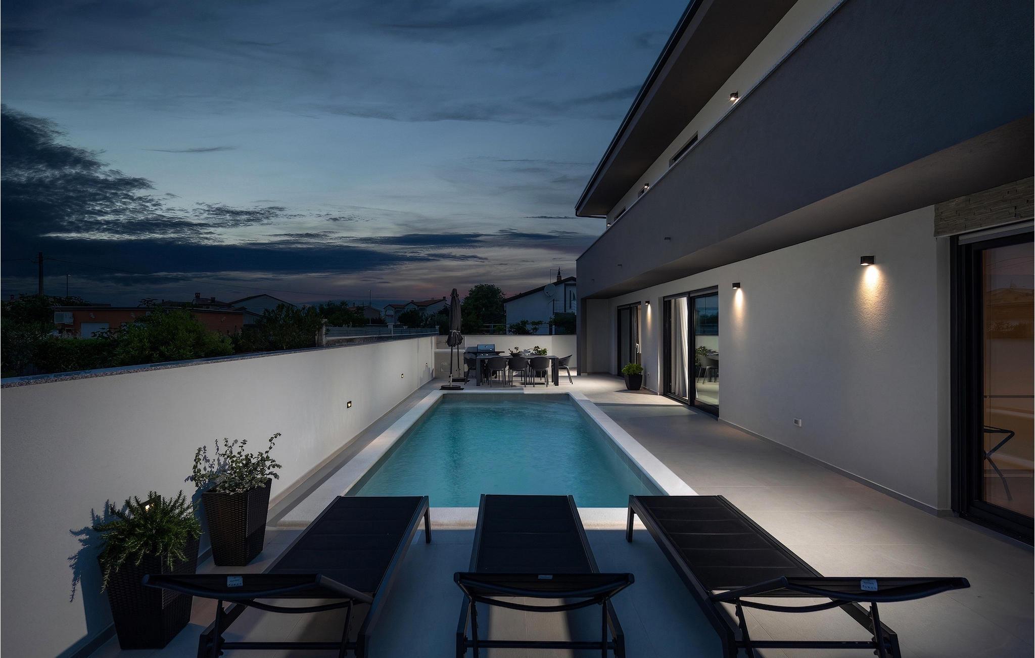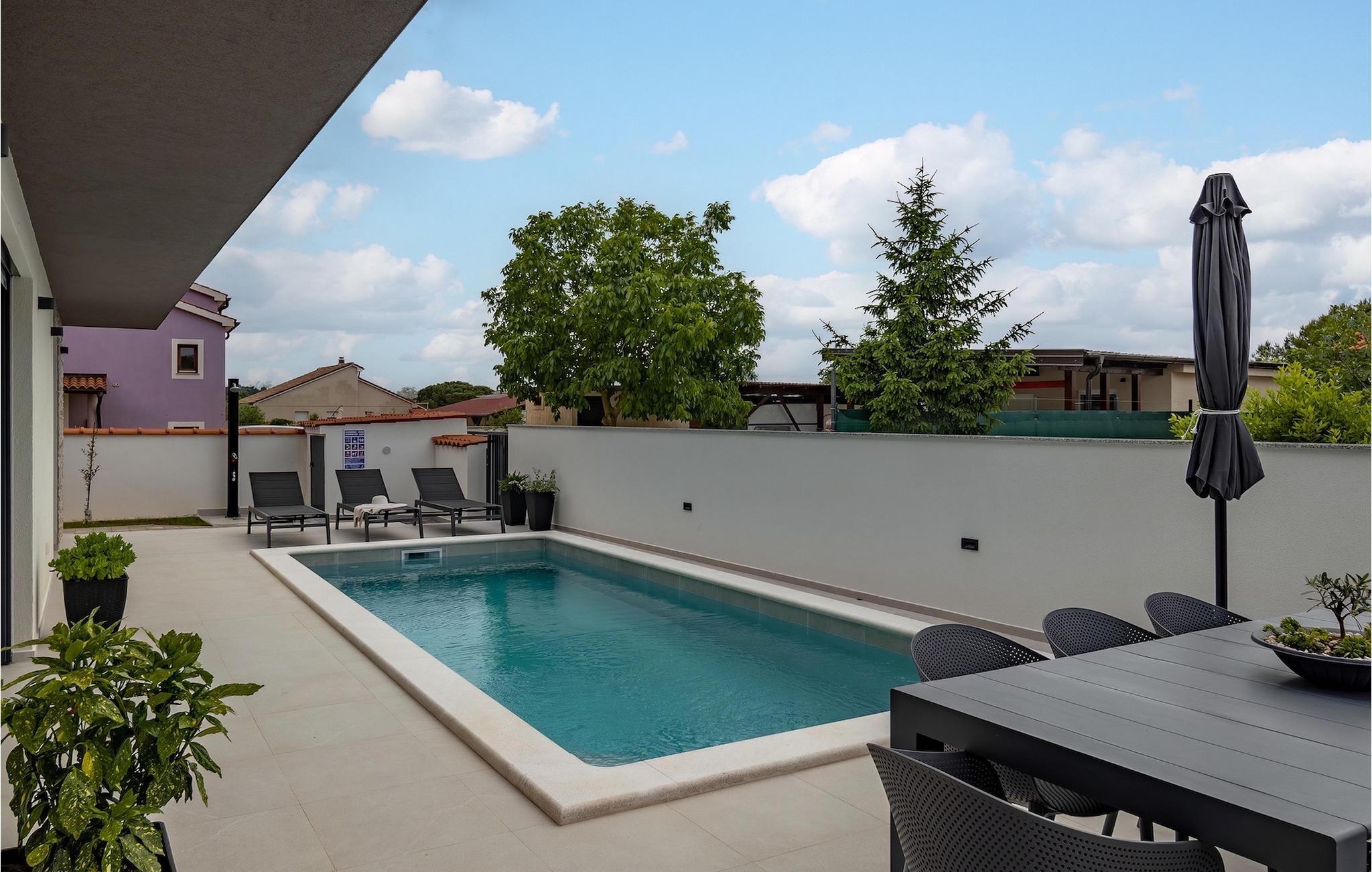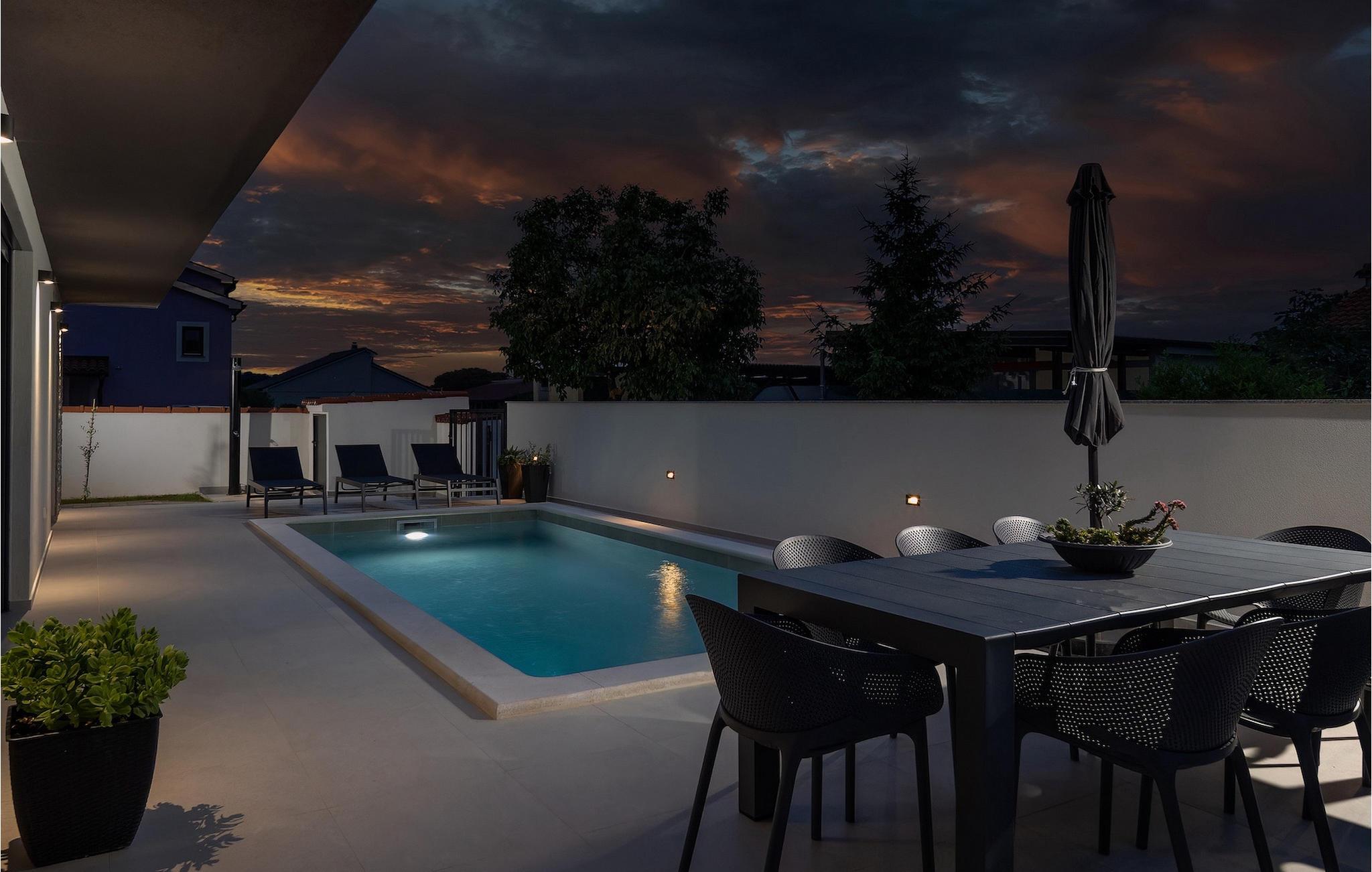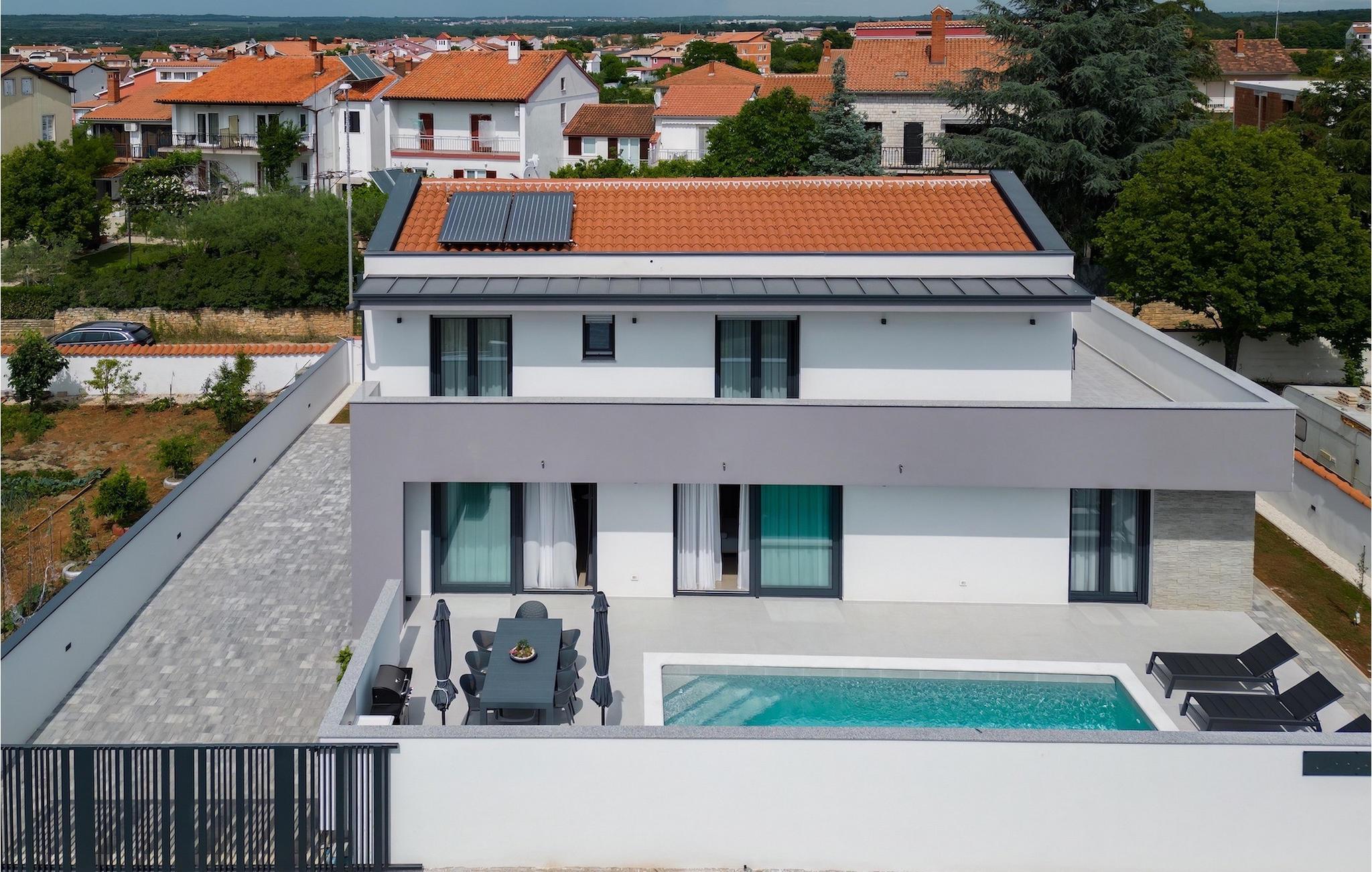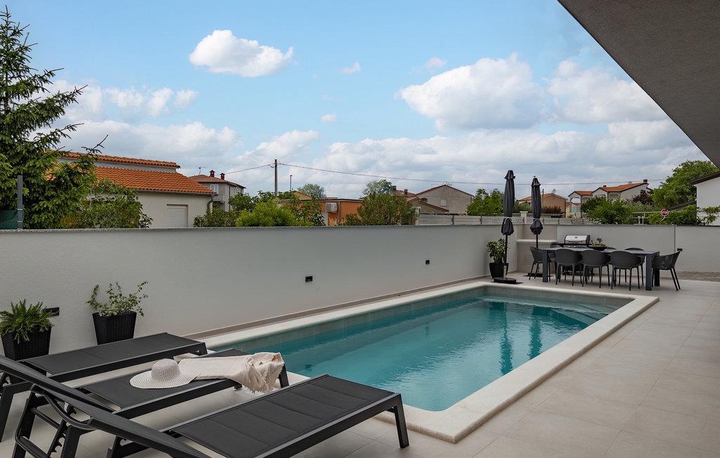 Villa Adria er en smuk ferievilla nær havet i den istriske landsby Valbadon. Denne fuldt lukkede villa tilbyder en rolig ferie og fuldstændig intimitet. Villaen har et moderne design og foran den er der en smuk pool på 21 m2. Ideelt til afslapning og forfriskning på varme dage Nyd solbadning eller tilbring uforglemmelige stunder ved poolen ved et bord med 8 siddepladser. Prøv din hånd med at tilberede traditionelle retter på grillen til hele familien og venner. og en stue, hvorfra du kan svømme i poolen foran villaen. Det første soveværelse med en dobbeltseng og en-suite badeværelse i stueetagen er beregnet til hvile og fredelige drømme. Der er et separat toilet med vaskemaskine. På første sal er der tre mere komfortable, moderne soveværelser med eget badeværelse og dobbeltsenge. Alle værelser er udstyret med tv og aircondition. Soveværelserne har adgang til en stor terrasse, hvor du kan tilbringe din morgen med en kop kaffe og en interessant bog i en istrisk atmosfære. Gå ikke glip af din afslappende ferie i Villa Adria og lad dig fortrylle af Valbadons charme.