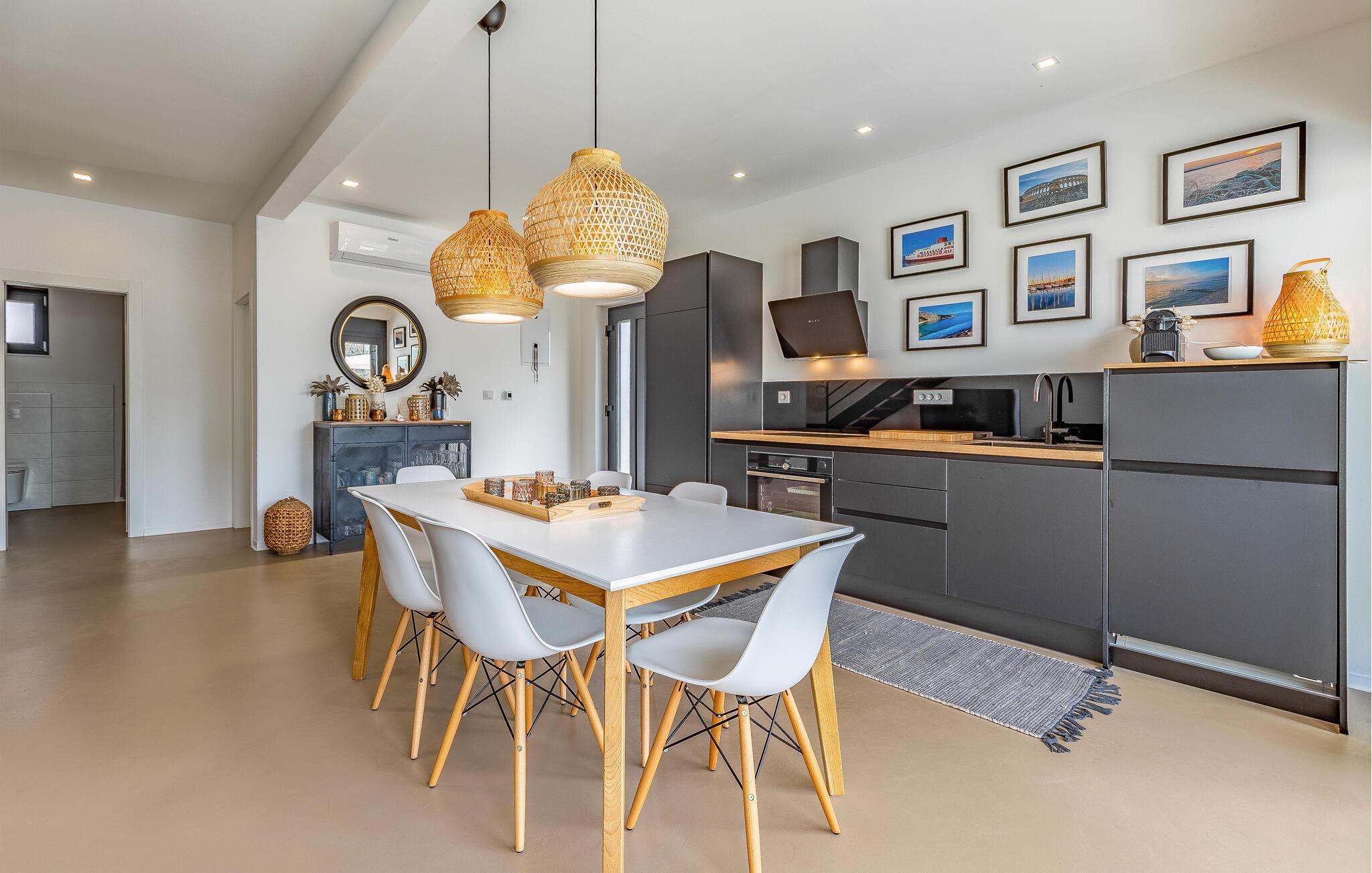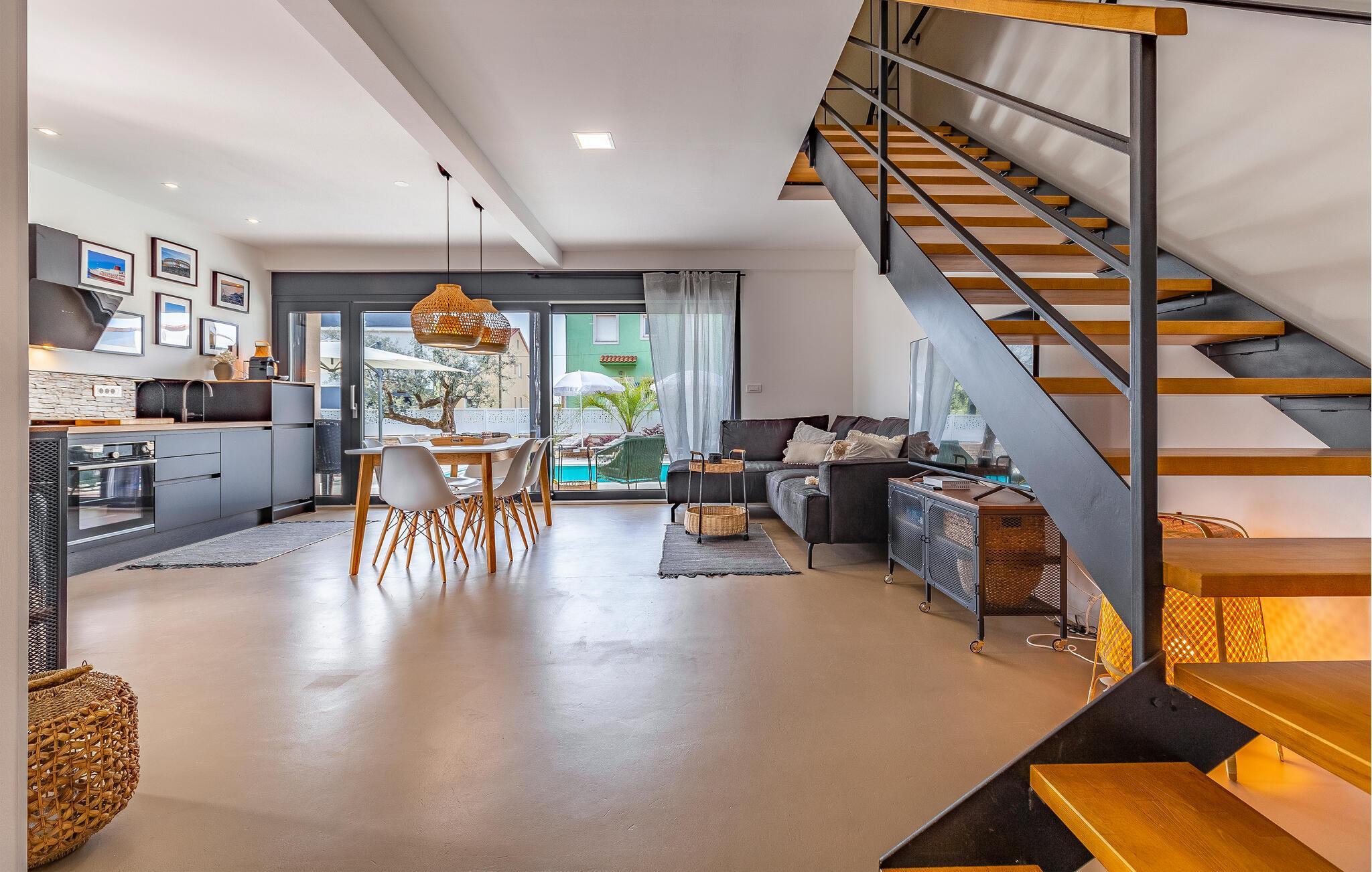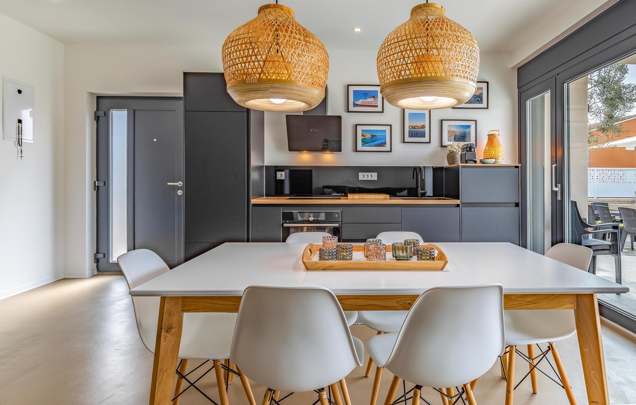 Huset byder på masser af plads og rigelig med komfort til en ferie med en større familie eller venneflok. Indretningen fremtræder både moderne og hyggelig og indbyder til mange hyggelige fællesstunder. Giv jer god tid til madlavningen i det veludstyrede køkken og nyd måltiderne på terrassen. Der går en skydedør fra stuen ud til terrassen, så I kan kombinere ude- og indeliv ganske gnidningsfrit. På de varme dage er det bare at finde et dejligt spot i solen eller skyggen. Skal I køle jer af, dypper I jer i poolen så tit, I lyster. Nyd snacks og lækre drinks, inden I trasker mod havet eller til centrum af Fazana.