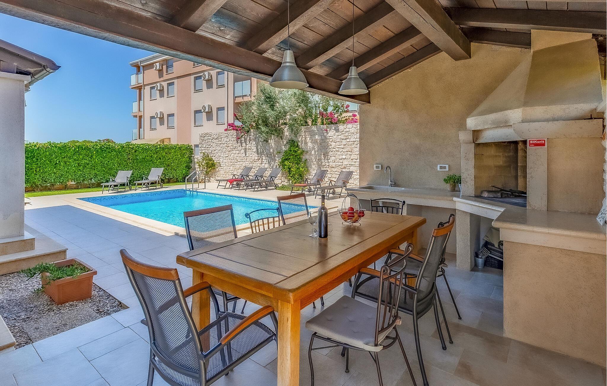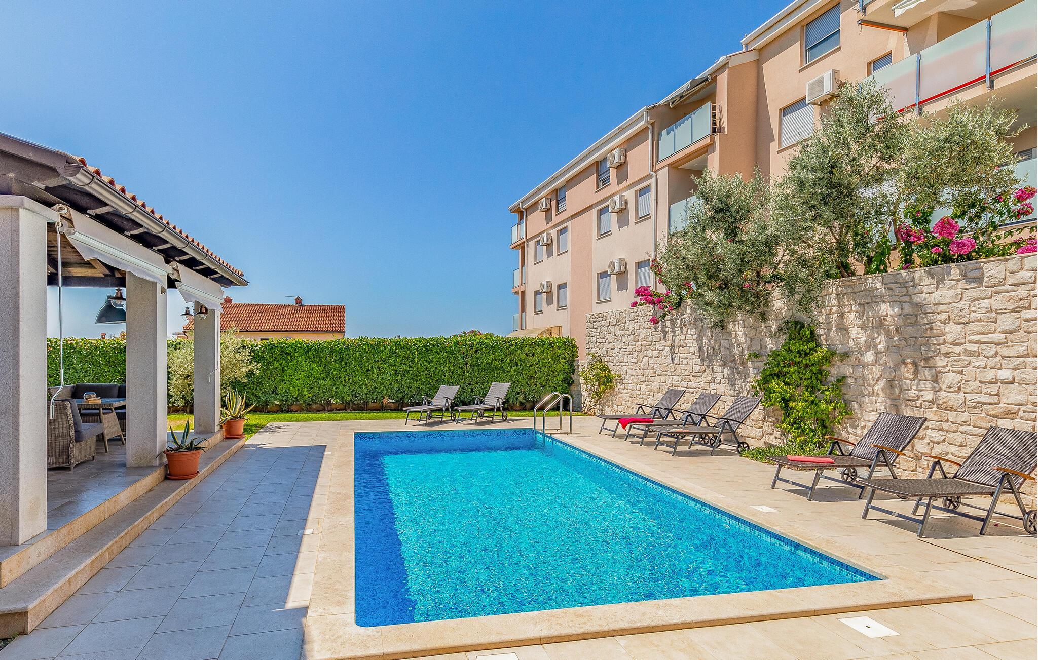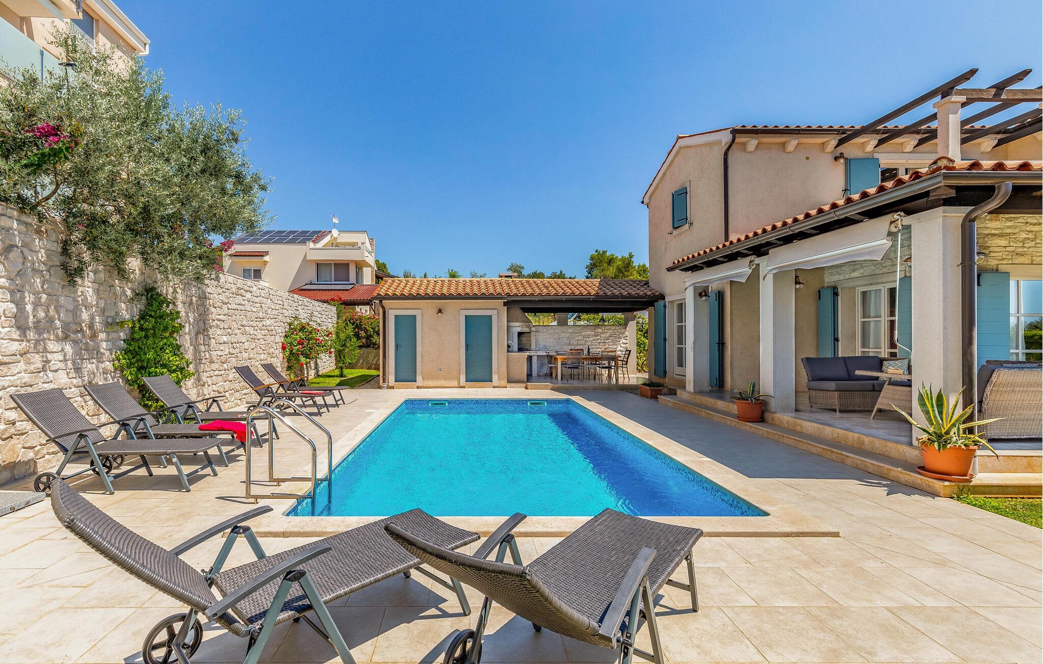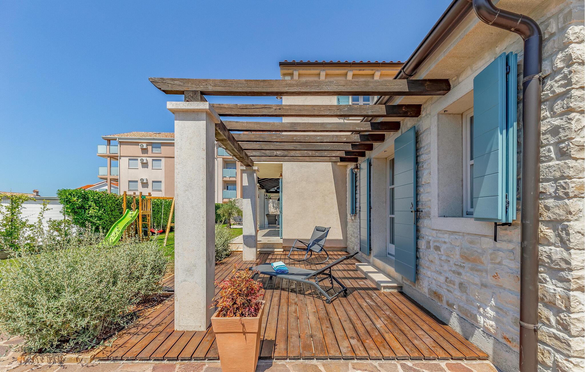 Denne skønne moderne ferievilla ligger i byen Fazana, der er kendt for sin havn, fra hvilken I kan tage båden ud til Brijuniøerne, men også for sine strande, promenade, skove og restauranter – et perfekt rejsemål til en afvekslende ferie. Til huset hører legeredskaber i den indhegnede have. Der er god mulighed for at forkæle sig selv her, hvor der både er pool, sauna og fitnessrum. Især er det skønt at tage en forfriskende svømmetur når dagen er varmest. Udforsk den lille by Fazana og de nærmeste omgivelser på cykel, de står nemlig klar og hører med til huset. Når I vil opleve det sande Istrien kan vi anbefale en tur ind midt på den skønne halvø. Smag egnens specialiteter på de mange lokale restauranter og i vinkældrene.