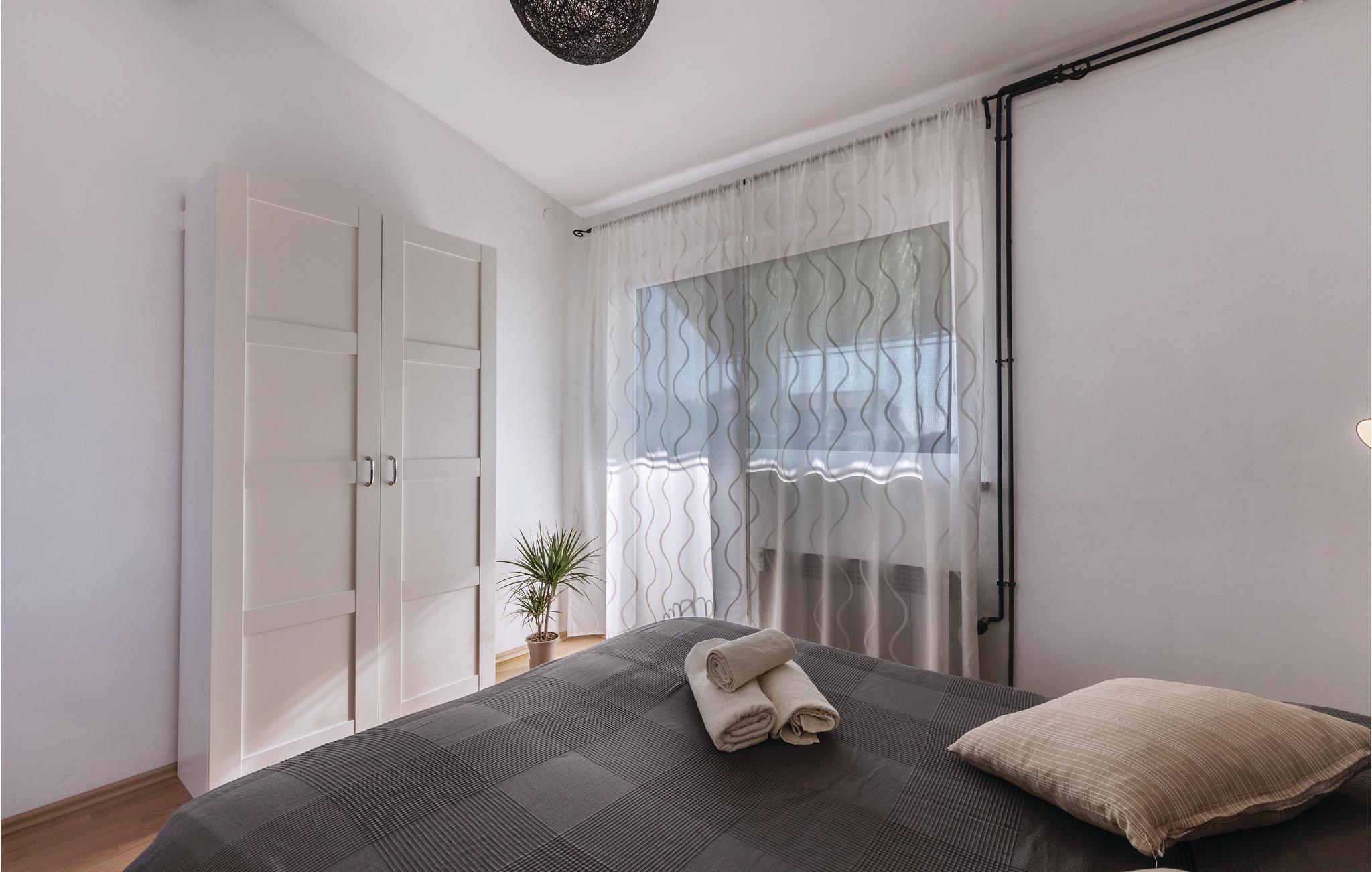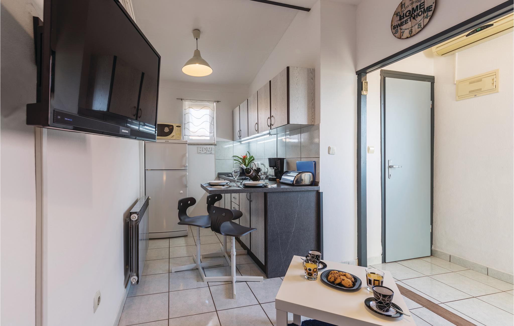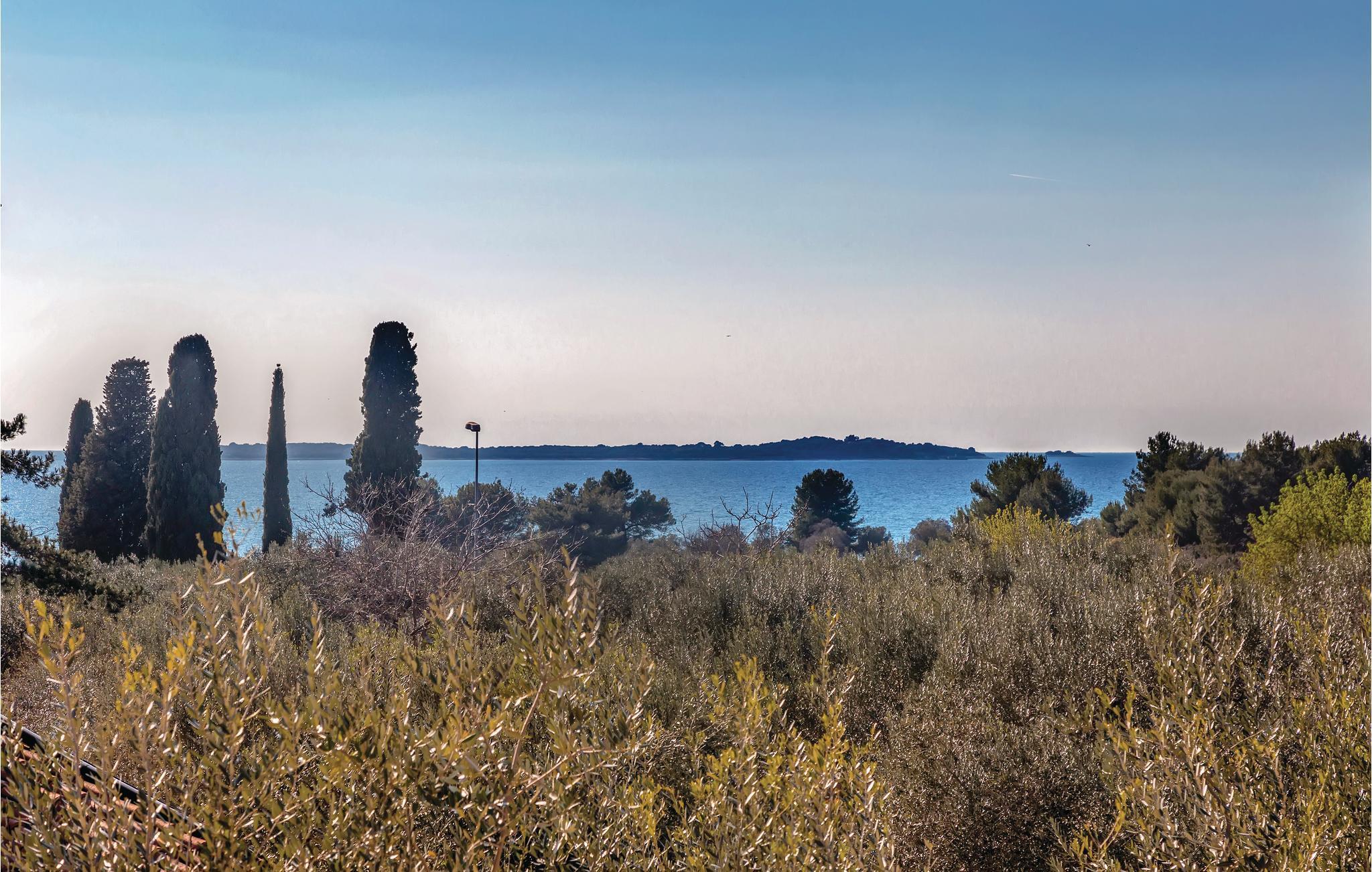 Lejligheden rummer en kombineret stue med køkken, et badeværelse og et soveværelse med udgang til en altan, hvorfra der er delvis udsigt til Brijuniøerne.