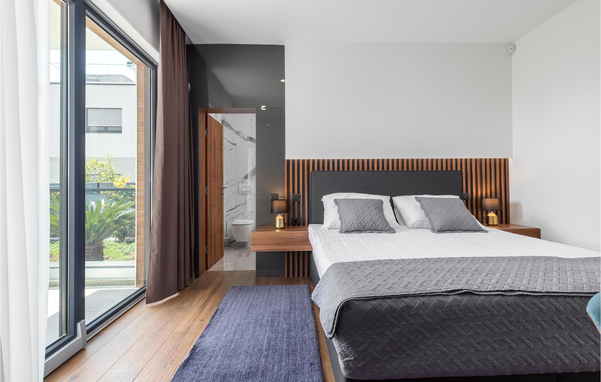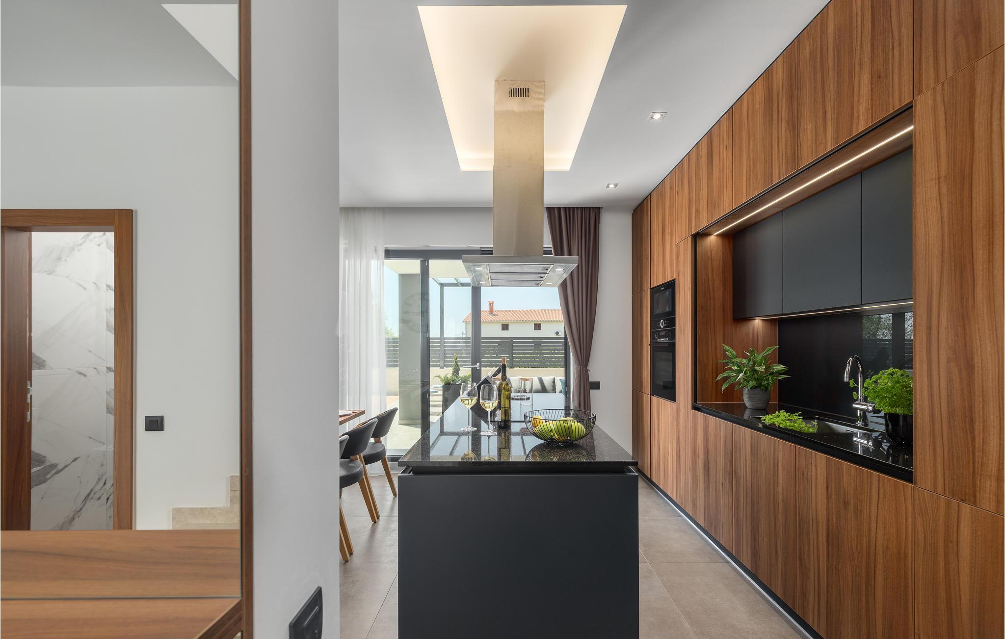 Det stilfuldt indrettede feriehus med sine rummelige terrasser, hvor du er omgivet af duft af natur, tilbyder komfort og afslapning for hele familien. De smagfulde møbler samt aircondition, tv og soveværelser med egne badeværelser er bare nogle af de ting, der er med til at give jer den bedste tænkelige ferieoplevelse. Der er også et soveværelse med badeværelse i stueetagen. På øverste etage finder du tre soveværelser med badeværelser, mens der på anden sal findes et fitnesscenter med professionelt træningsudstyr, og de, der vil slappe af, kan nyde en vidunderlig panoramaudsigt over Brijuni-øhavet. I stueetagen er der en rummelig stue, køkken og spisestue med adgang til den lækre pool, som er ideel til svømmere. Udendørs finder I også et sommerkøkken, hvor I kan tilberede alt til jeres lækre grillmiddage.