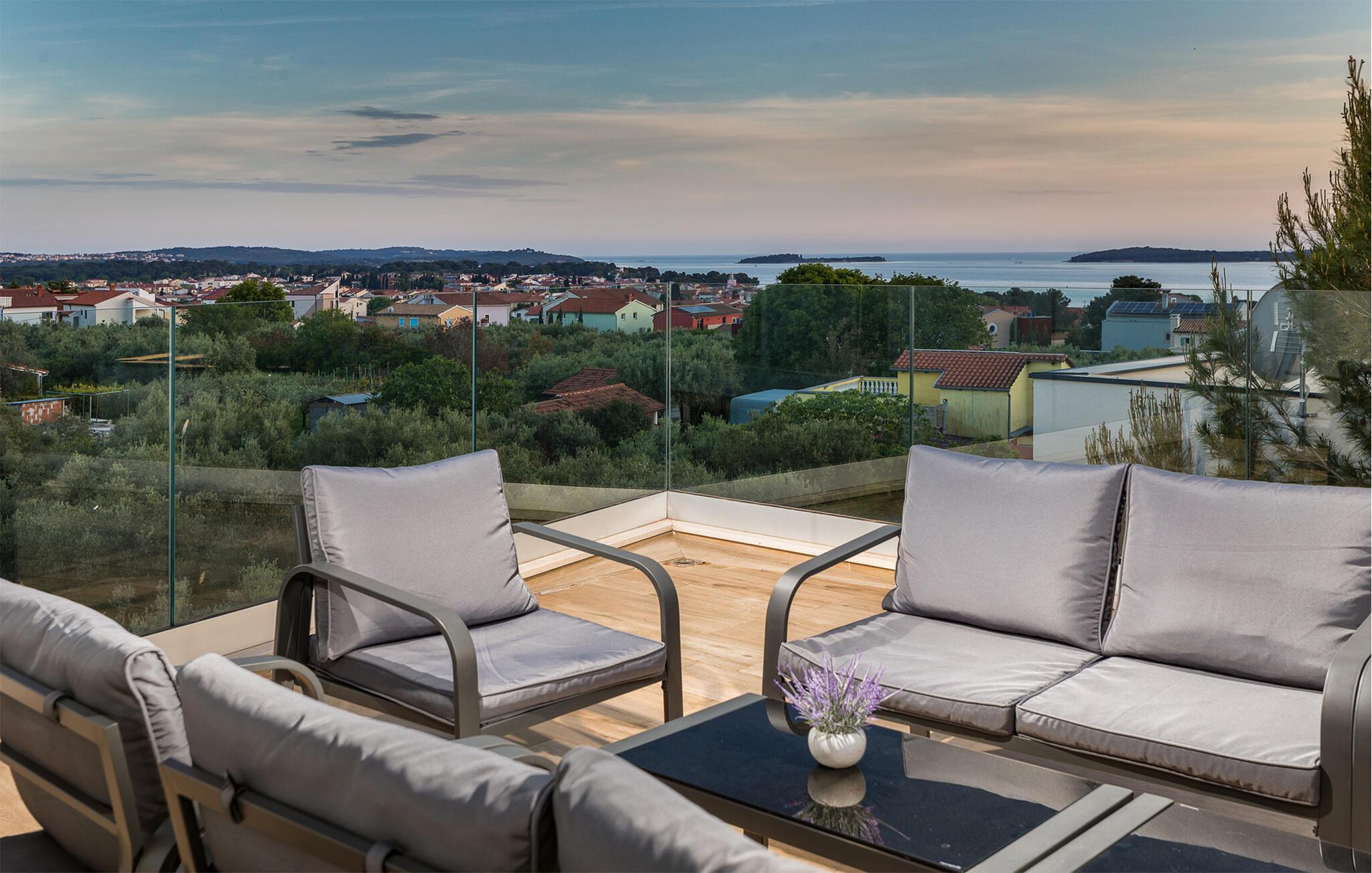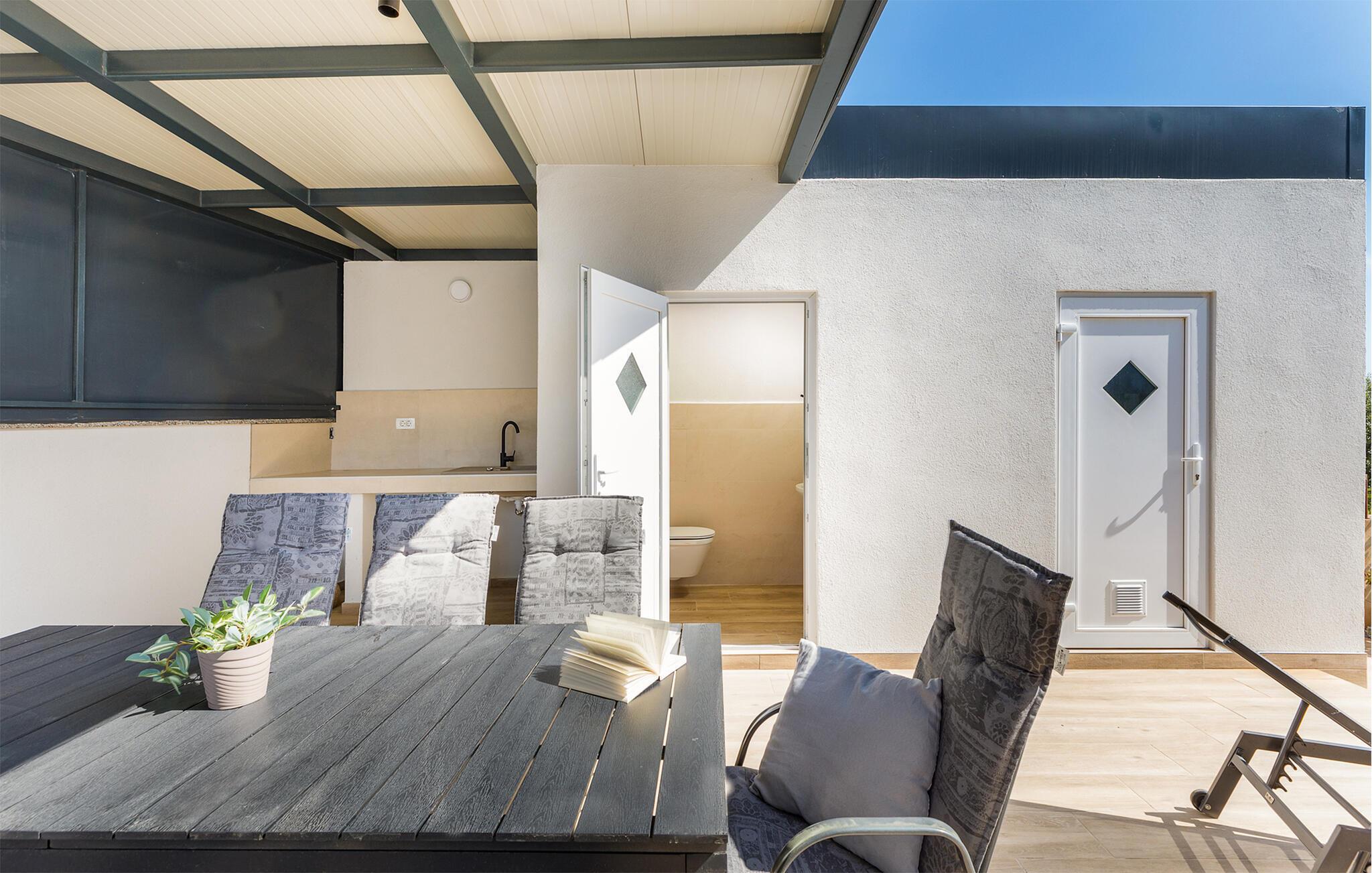 Jeres moderne og luksuriøse feriehus byder på et imponerende udendørsområde. Her kan I nyde de solrige dage og lune aftener fuldt ud. Det rummelige poolområde indbyder til svømning og afslapning. Læn jer tilbage på de komfortable liggestole, og lad sjælen finde ro. Nyd jeres måltider i det overdækkede udendørs spiseområde, og lad jer inspirere af den friske luft og de smukke omgivelser. Nyd den betagende udsigt fra terrassen. De hyggelige siddepladser tilbyder jer det ideelle sted at observere solnedgangen om aftenen. Brug de forskellige terrasseområder til at trække jer lidt tilbage og nyde freden.