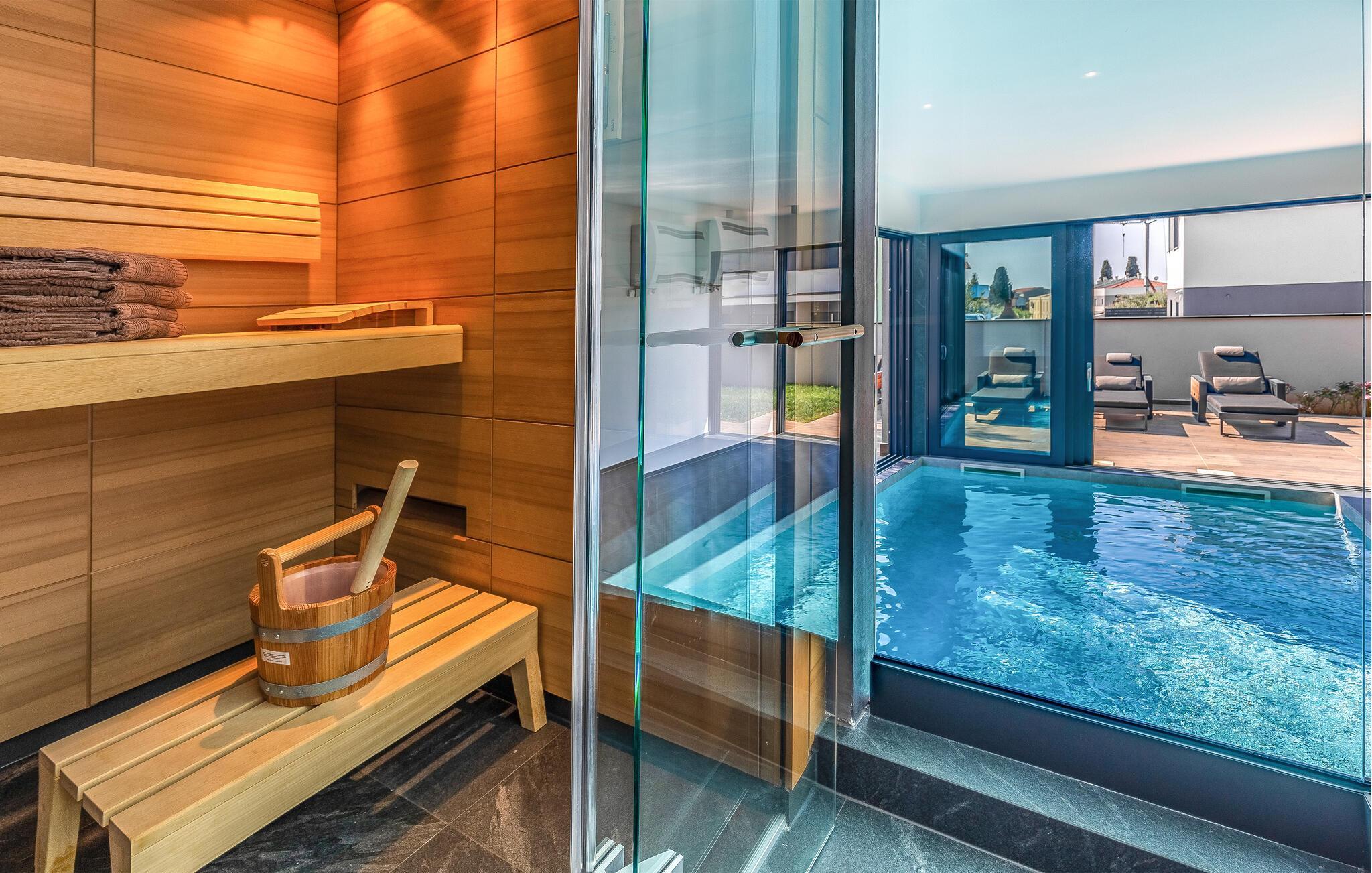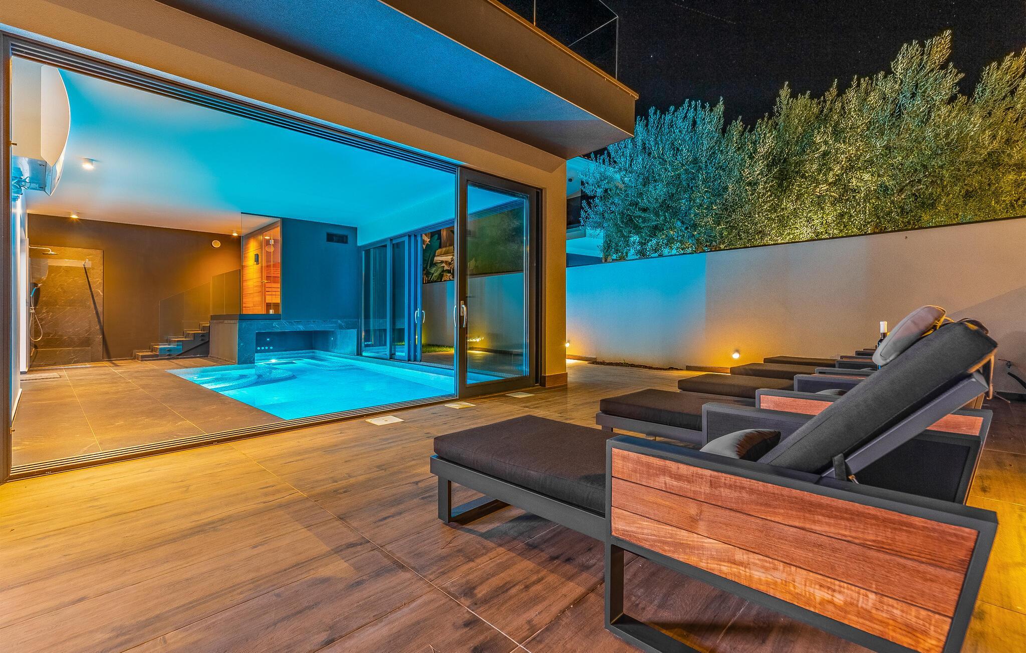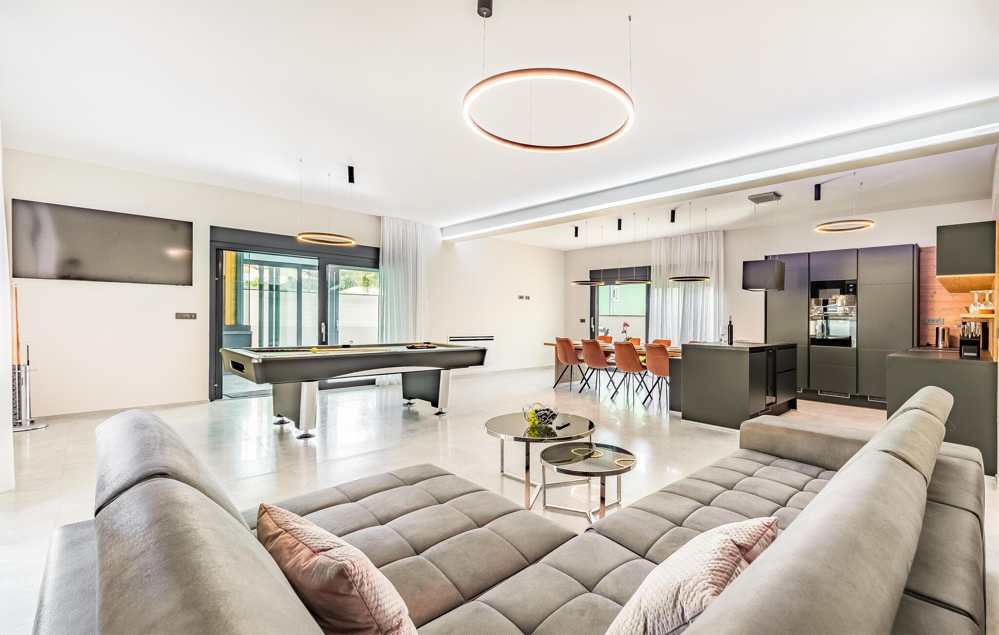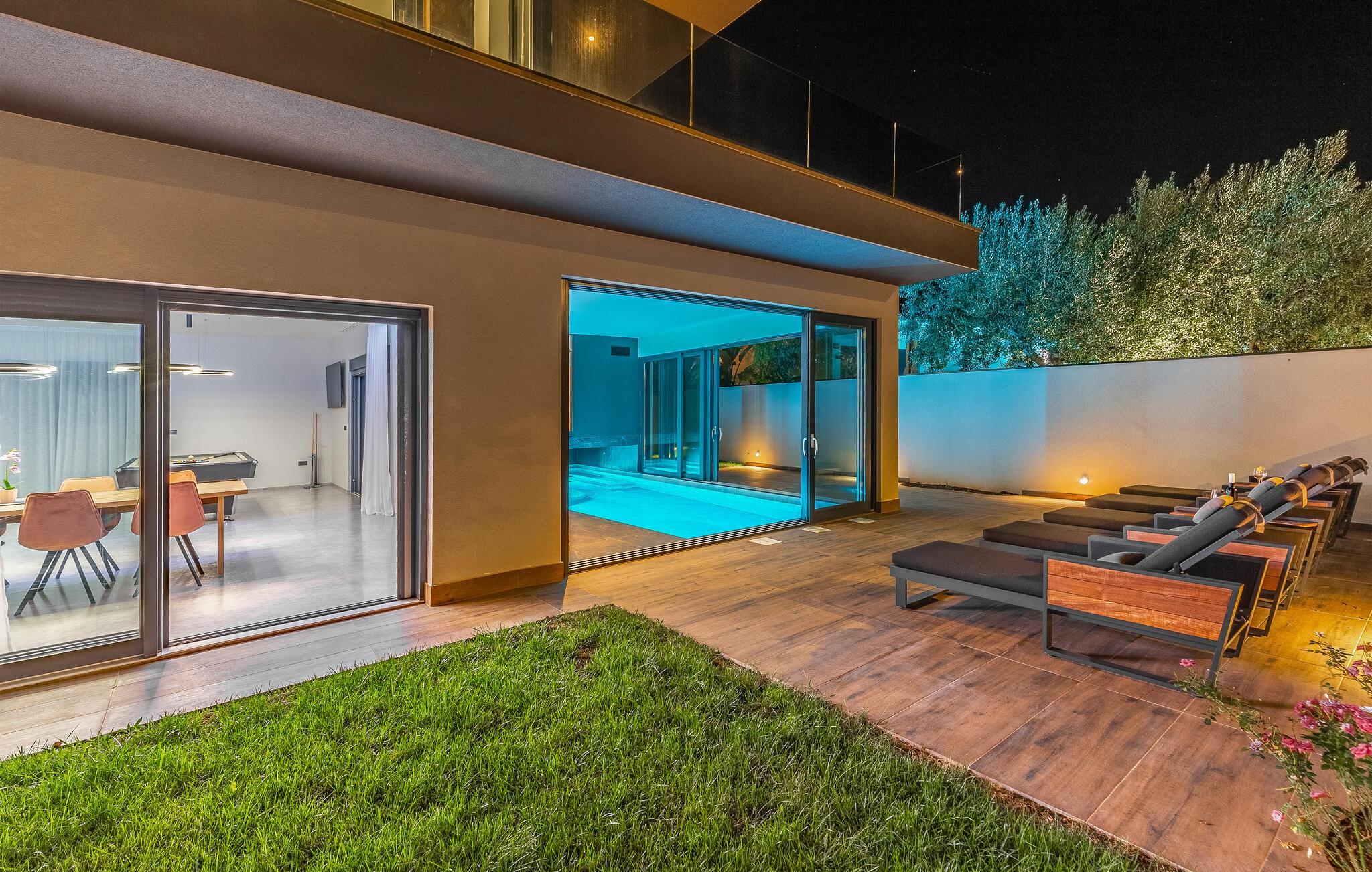 Tilbring ferien i denne luksuriøse villa i Fazana, som vil imponere jer med sit elegante design og kvalitetsløsninger. Den åbne opholdsstue i stueetagen giver jer masser af plads til tid sammen, uanset om I laver mad i det rummelige køkken eller spiller et spil billard. Ovenpå er der private soveværelser med eget badeværelse, nogle med udgang til den store terrasse, ideelt til afslappende yogaøvelser i morgensolen. Slap af i den opvarmede indendørs pool, nyd saunaen eller lounge på liggestolene på den rummelige terrasse.