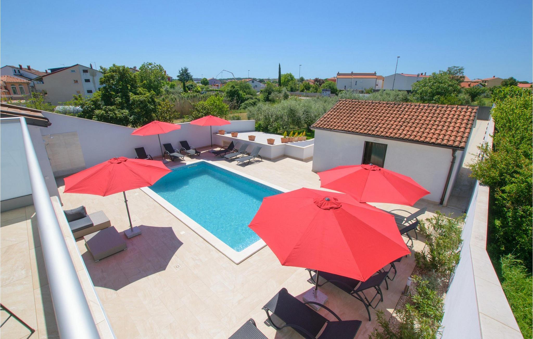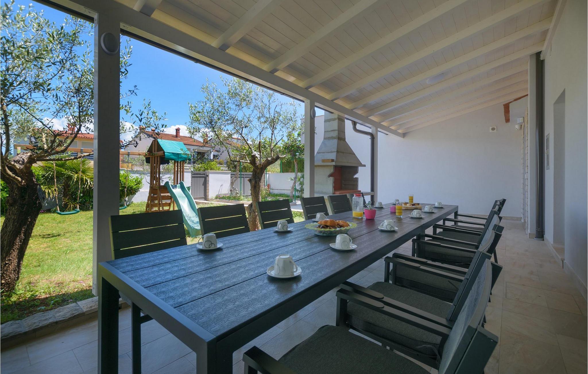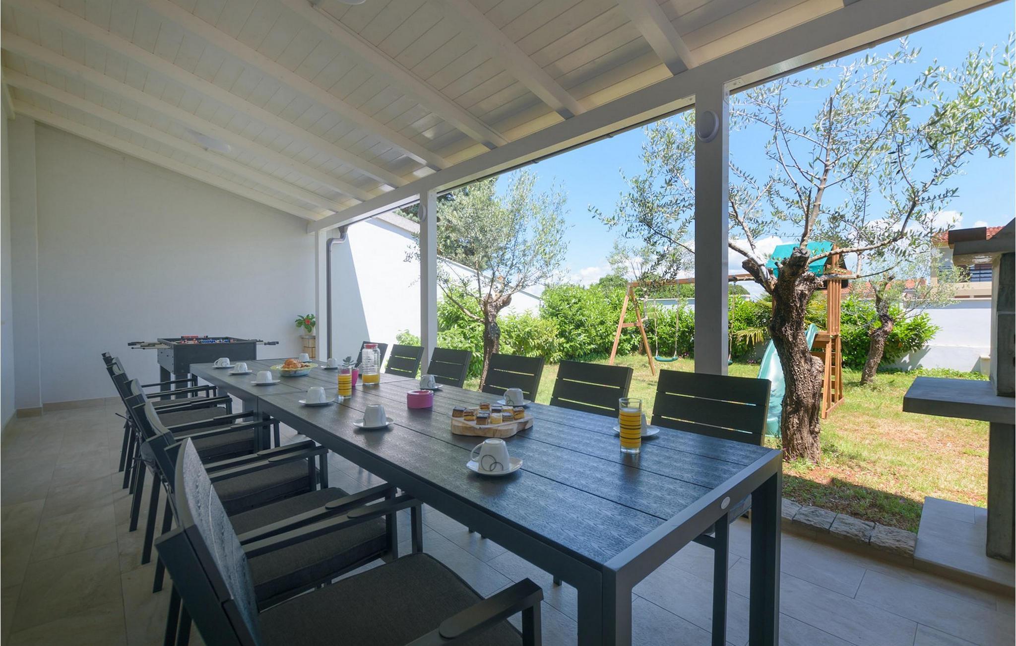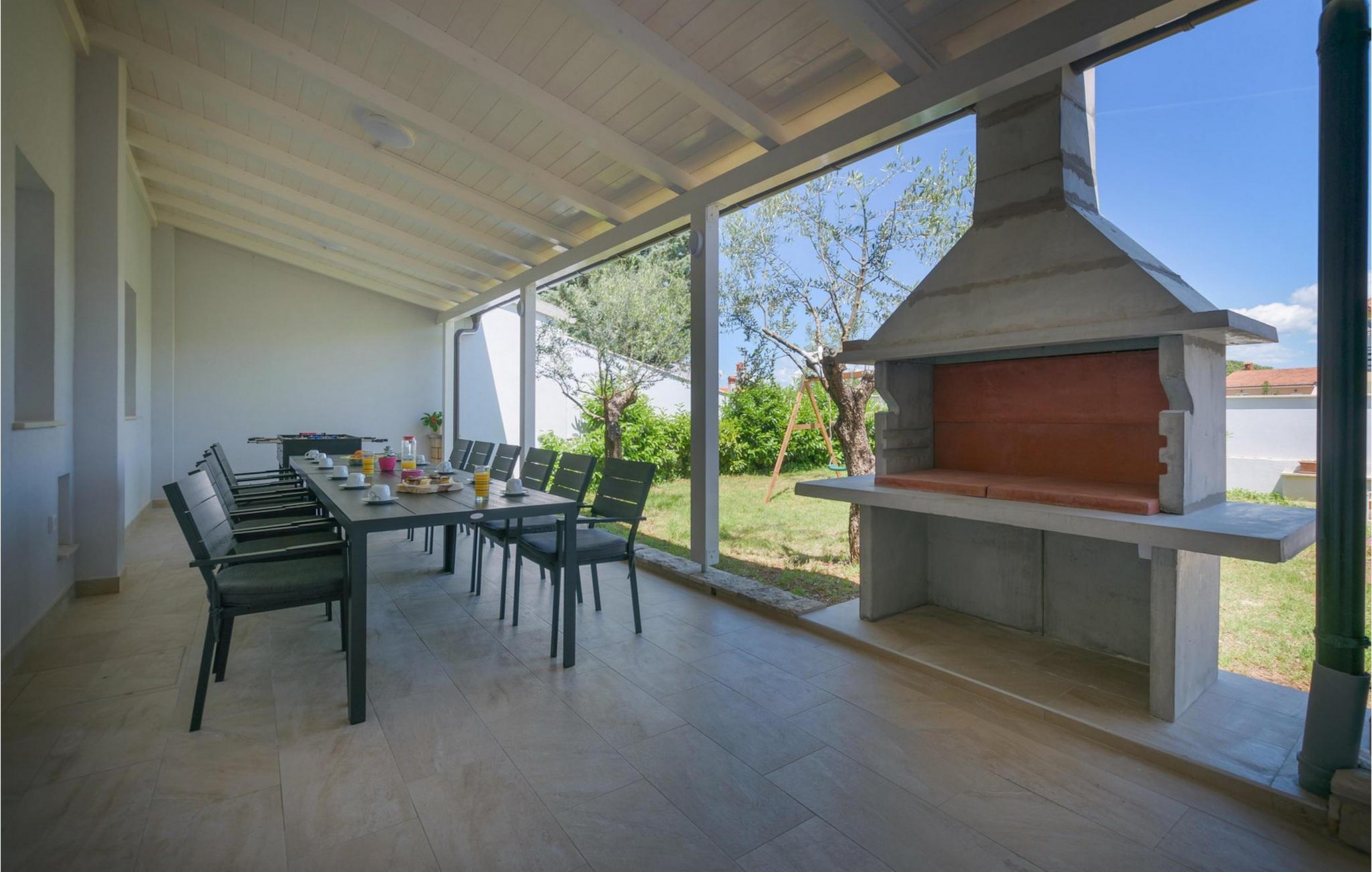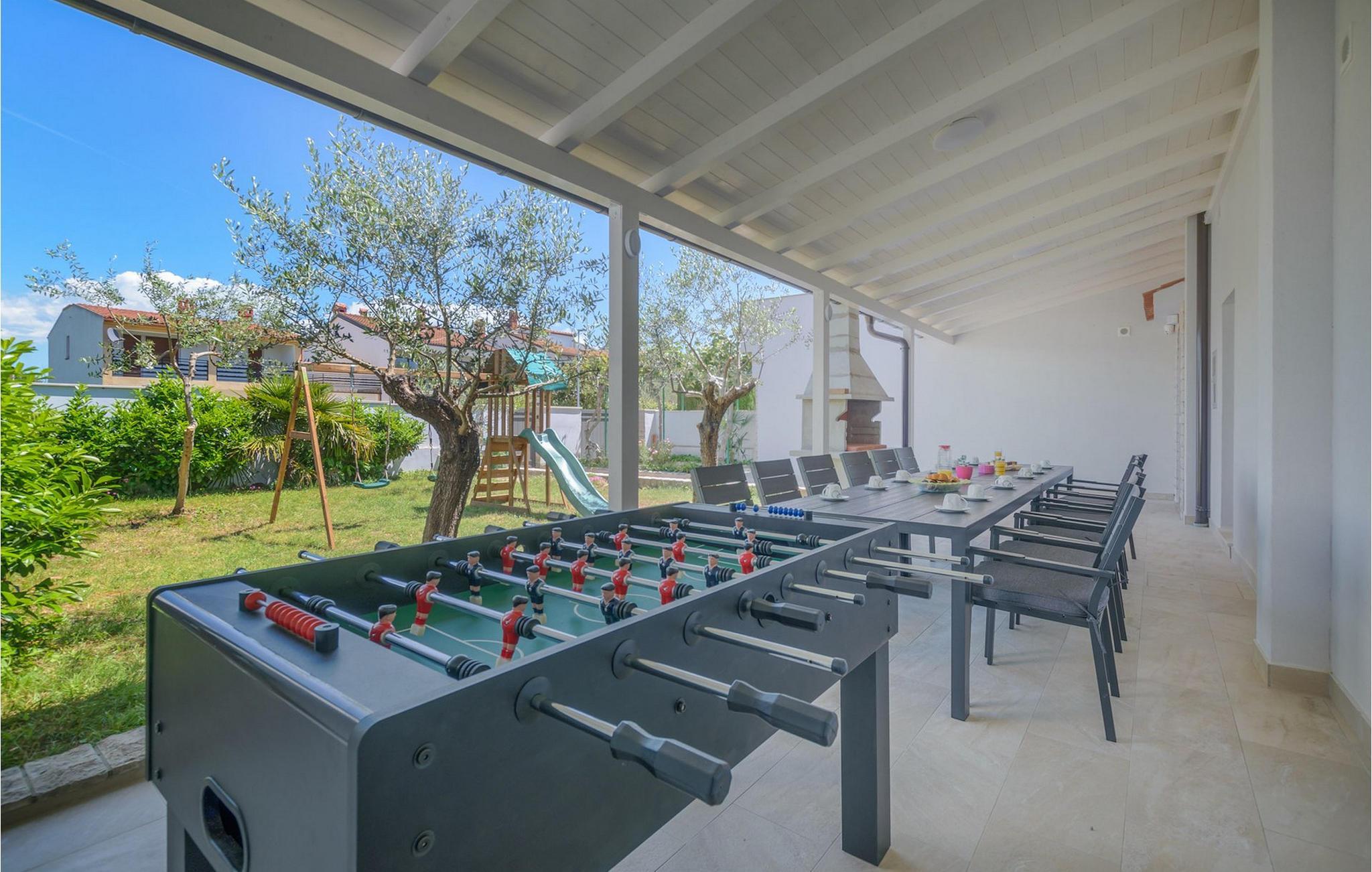 Villa Mala Vala, på Istriens vestkyst, inviterer dig til at tilbringe en afslappende ferie nær havet. Indkvarteringen for op til 12 gæster har et åbent-rum-koncept i stueetagen, der kombinerer opholds-, spise- og køkkenområderne i ét. Det rummelige, lyse værelse med varme farveaccenter skaber en hyggelig atmosfære. Ved siden af sofaen giver vinduerne i stueplan dig en smuk udsigt over og adgang til haven med den private pool. I køkkenet kan du lave dig en fremragende tekstureret espresso og nyde den på terrassen med udsigt til haven. I stueetagen finder du også to af de seks soveværelser, hvoraf det ene er forbundet med terrassen. Ovenpå venter de andre soveværelser på dig, et af dem med privat balkon. Alle soveværelser i denne villa har ensuite badeværelser med walk-in brusere. Derudover tager denne bolig din ferie til et ekstra afslappende niveau - et wellness-område findes på øverste etage. Der kan du bruge saunaen såvel som jacuzzien. Udenfor kan du bare forfriske dig selv på varme sommerdage i den private pool, lægge dig på en af liggestolene for at slikke sol eller tage plads i de komfortable havemøbler. På terrassen giver grillpladsen med spisebord og grill mulighed for at tilberede lækre måltider i den friske luft. Hvis du leder efter lidt sjov, er bordfodbolden på denne terrasse et godt valg, og de små kan glæde sig yderligere på legepladsen. Gør din næste ferie hyggelig og mindeværdig - book villa Mala Vala nu.Villa Mala Vala ligger i bygden Valbandon ved siden af den maleriske fiskerby Fažana. Kystlinjen fra Valbandon til Fažana er kendt for de lange stenstrande, der motiverer dig til at tilbringe en afslappende, smuk dag der. Du kan bruge promenaden ved havet til afslappede, omfattende gåture samt sportsaktiviteter. I det omkringliggende område finder du adskillige restauranter, især traditionelle taverner - prøv bestemt de istriske specialiteter. Du har måske muligheden for at være en del af "Valbandon ispod cripnje"- fiestaen, hvor du vil blive tilbudt autoktone, lokale måltider "ristet under klokken" - forkæl dig selv med et velsmagende måltid! Glem ikke at besøge Fažana, hvorfra du kan tage en båd til Brijuni National Park - en perfekt idé til en dagstur. Sørg også for at slentre gennem den største by i Istrien, Pula, fuld af historiske seværdigheder såsom det berømte amfiteater kaldet "Arena", og nyd den autentiske stemning.