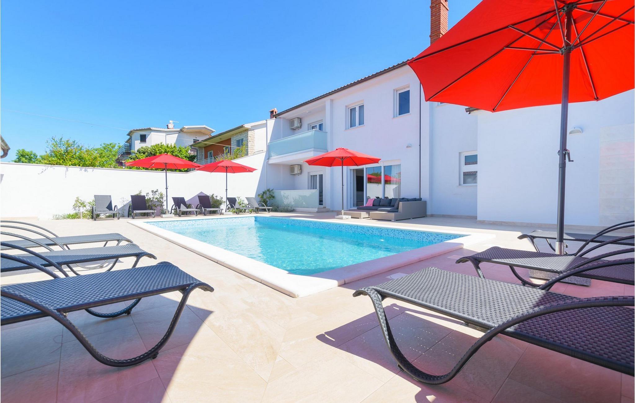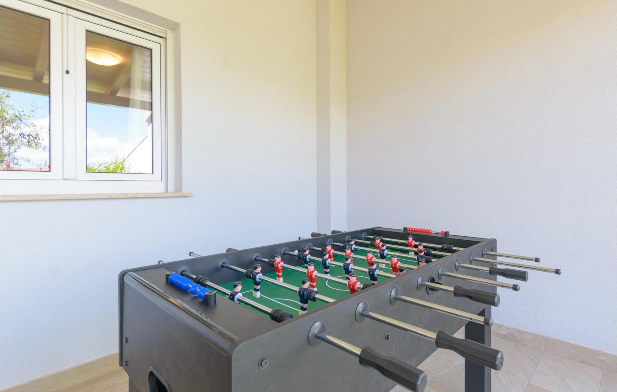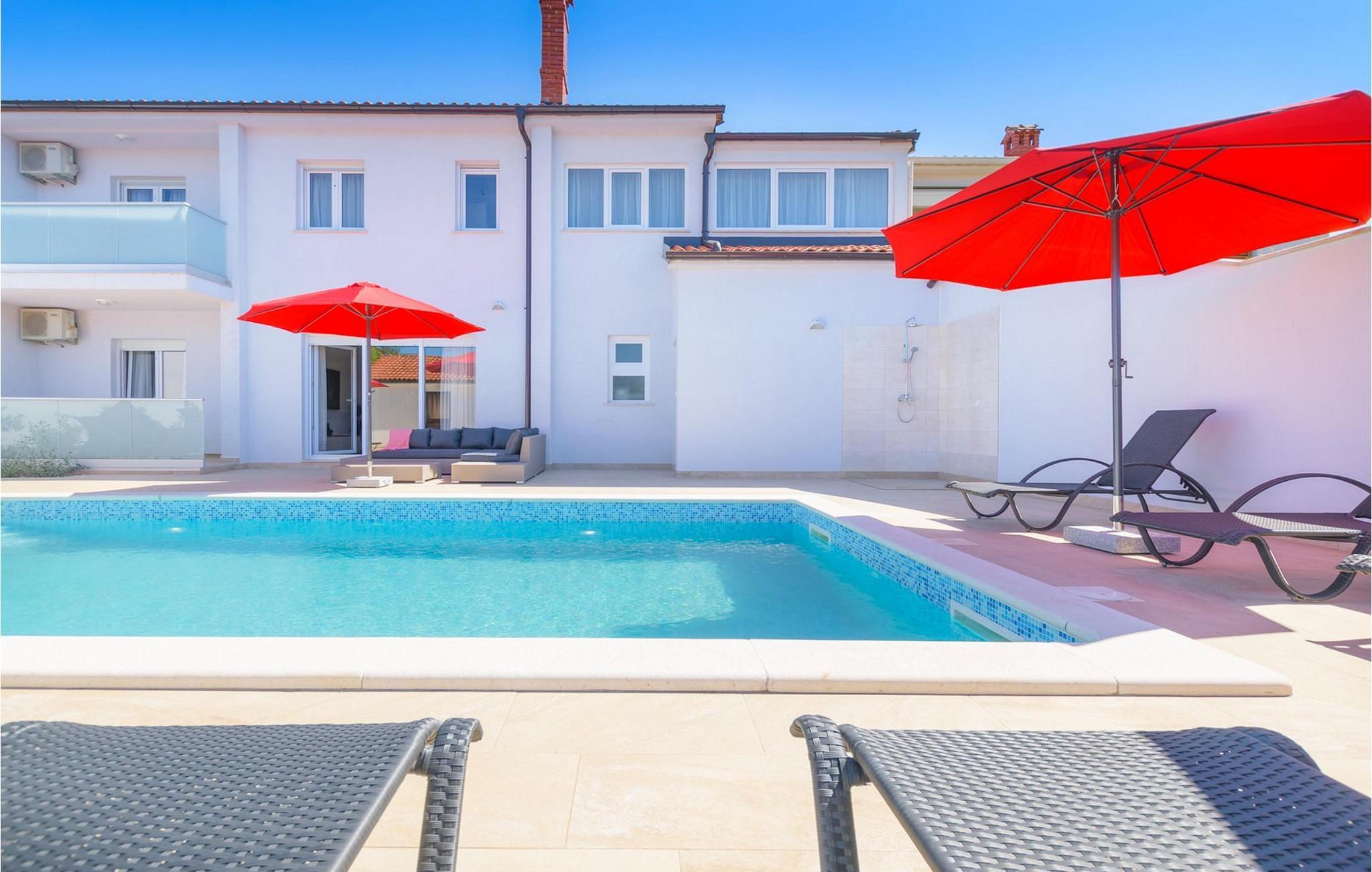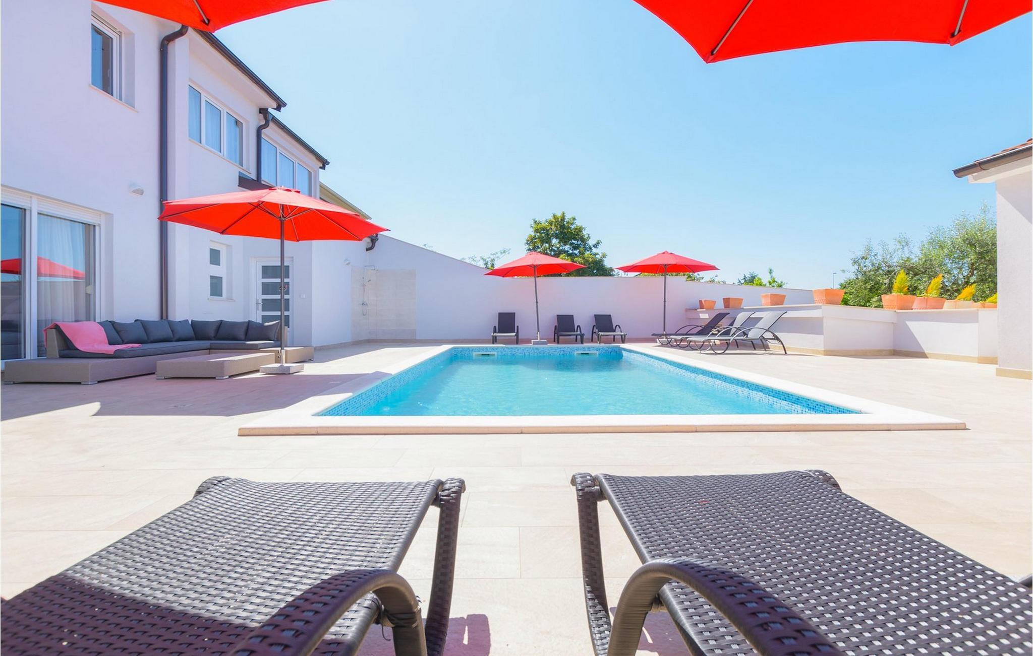 Villa Mala Vala, på Istriens vestkyst, inviterer dig til at tilbringe en afslappende ferie nær havet. Indkvarteringen for op til 12 gæster har et åbent-rum-koncept i stueetagen, der kombinerer opholds-, spise- og køkkenområderne i ét. Det rummelige, lyse værelse med varme farveaccenter skaber en hyggelig atmosfære. Ved siden af sofaen giver vinduerne i stueplan dig en smuk udsigt over og adgang til haven med den private pool. I køkkenet kan du lave dig en fremragende tekstureret espresso og nyde den på terrassen med udsigt til haven. I stueetagen finder du også to af de seks soveværelser, hvoraf det ene er forbundet med terrassen. Ovenpå venter de andre soveværelser på dig, et af dem med privat balkon. Alle soveværelser i denne villa har ensuite badeværelser med walk-in brusere. Derudover tager denne bolig din ferie til et ekstra afslappende niveau - et wellness-område findes på øverste etage. Der kan du bruge saunaen såvel som jacuzzien. Udenfor kan du bare forfriske dig selv på varme sommerdage i den private pool, lægge dig på en af liggestolene for at slikke sol eller tage plads i de komfortable havemøbler. På terrassen giver grillpladsen med spisebord og grill mulighed for at tilberede lækre måltider i den friske luft. Hvis du leder efter lidt sjov, er bordfodbolden på denne terrasse et godt valg, og de små kan glæde sig yderligere på legepladsen. Gør din næste ferie hyggelig og mindeværdig - book villa Mala Vala nu.Villa Mala Vala ligger i bygden Valbandon ved siden af den maleriske fiskerby Fažana. Kystlinjen fra Valbandon til Fažana er kendt for de lange stenstrande, der motiverer dig til at tilbringe en afslappende, smuk dag der. Du kan bruge promenaden ved havet til afslappede, omfattende gåture samt sportsaktiviteter. I det omkringliggende område finder du adskillige restauranter, især traditionelle taverner - prøv bestemt de istriske specialiteter. Du har måske muligheden for at være en del af "Valbandon ispod cripnje"- fiestaen, hvor du vil blive tilbudt autoktone, lokale måltider "ristet under klokken" - forkæl dig selv med et velsmagende måltid! Glem ikke at besøge Fažana, hvorfra du kan tage en båd til Brijuni National Park - en perfekt idé til en dagstur. Sørg også for at slentre gennem den største by i Istrien, Pula, fuld af historiske seværdigheder såsom det berømte amfiteater kaldet "Arena", og nyd den autentiske stemning.