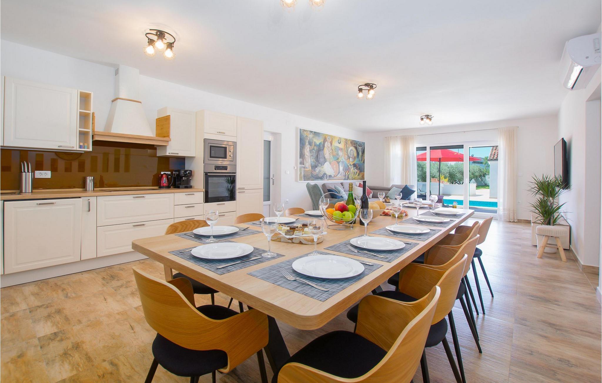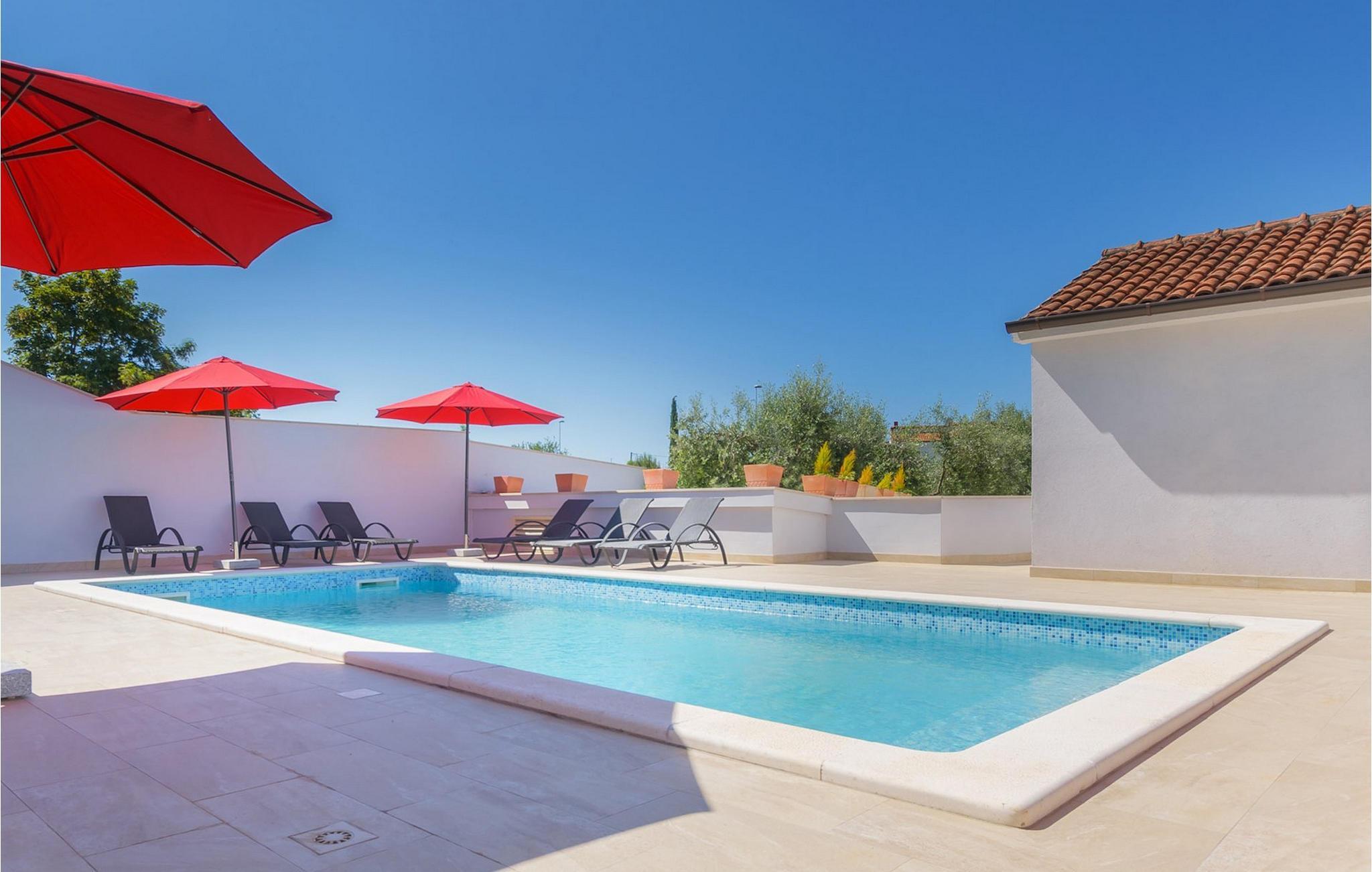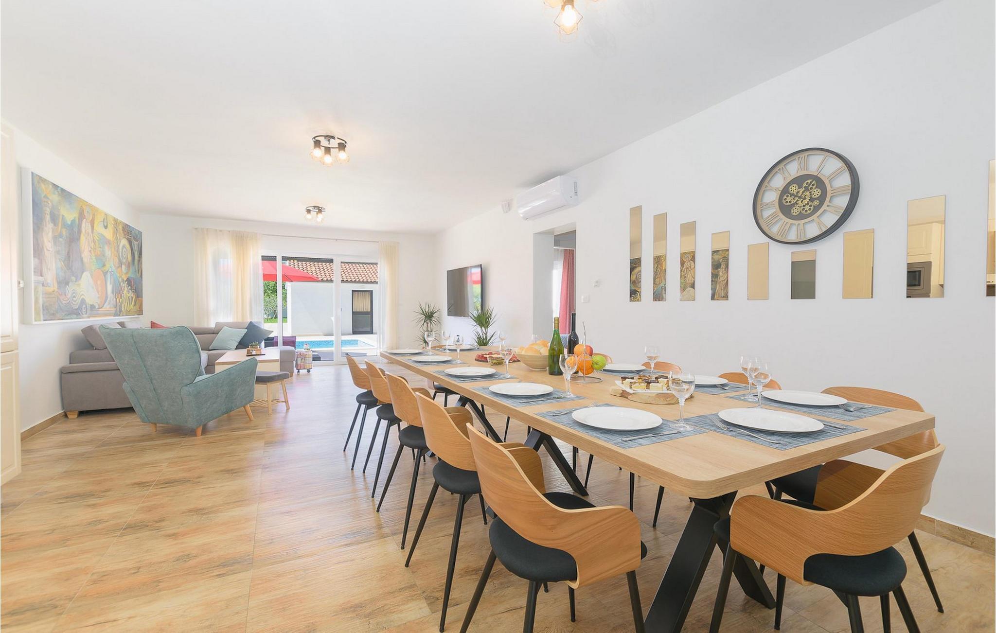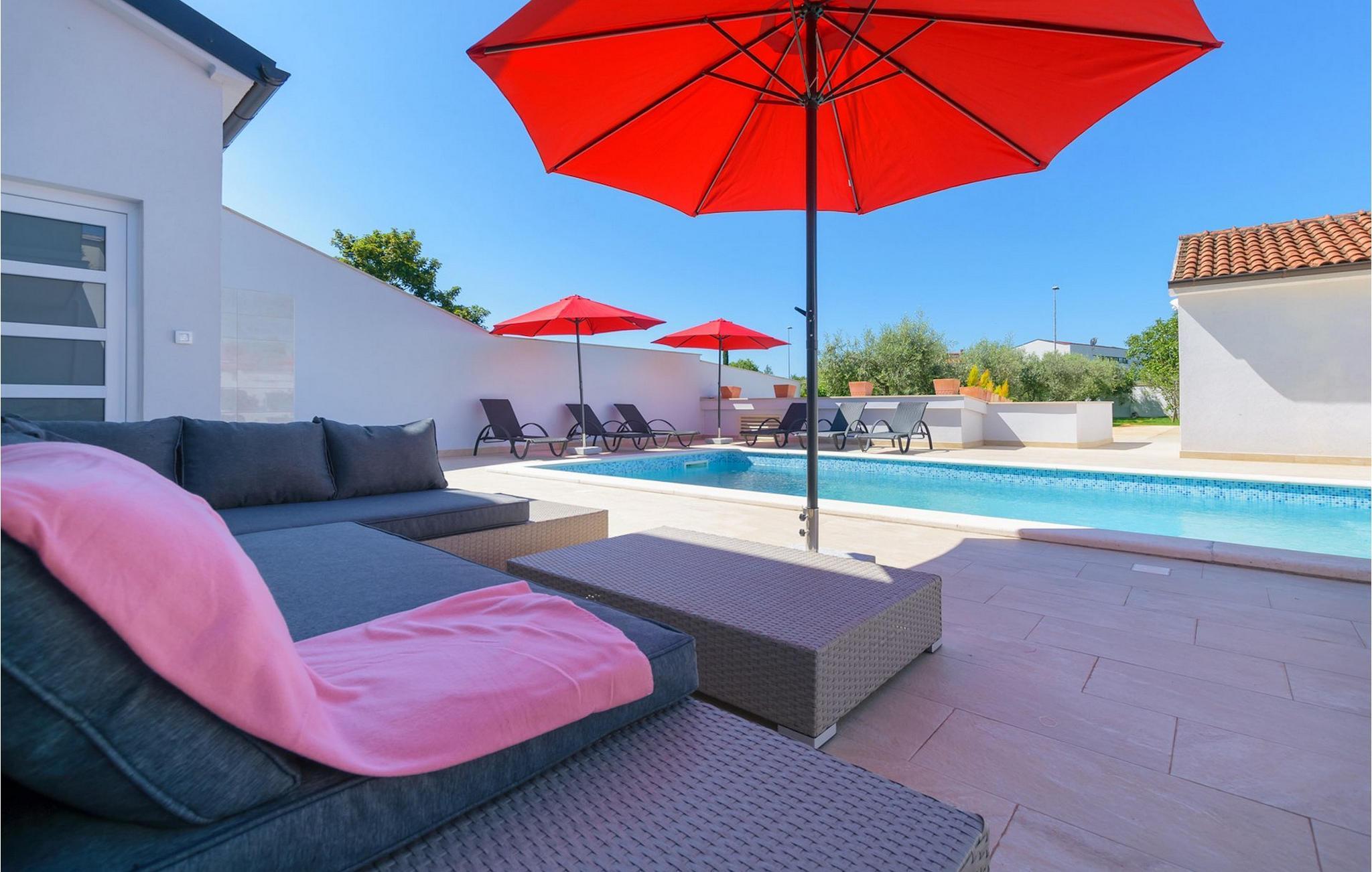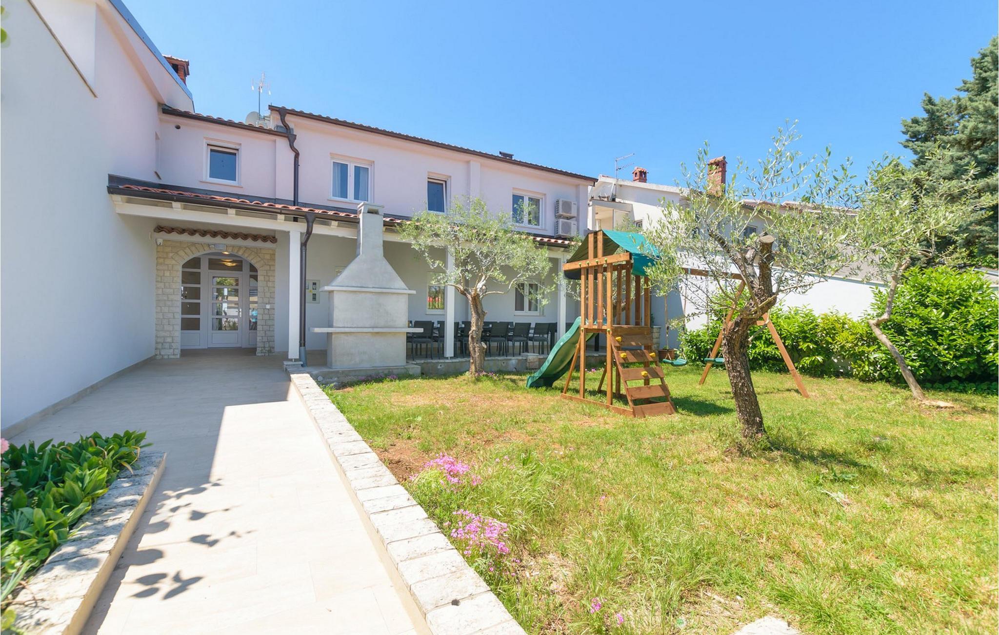 Villa Mala Vala, på Istriens vestkyst, inviterer dig til at tilbringe en afslappende ferie nær havet. Indkvarteringen for op til 12 gæster har et åbent-rum-koncept i stueetagen, der kombinerer opholds-, spise- og køkkenområderne i ét. Det rummelige, lyse værelse med varme farveaccenter skaber en hyggelig atmosfære. Ved siden af sofaen giver vinduerne i stueplan dig en smuk udsigt over og adgang til haven med den private pool. I køkkenet kan du lave dig en fremragende tekstureret espresso og nyde den på terrassen med udsigt til haven. I stueetagen finder du også to af de seks soveværelser, hvoraf det ene er forbundet med terrassen. Ovenpå venter de andre soveværelser på dig, et af dem med privat balkon. Alle soveværelser i denne villa har ensuite badeværelser med walk-in brusere. Derudover tager denne bolig din ferie til et ekstra afslappende niveau - et wellness-område findes på øverste etage. Der kan du bruge saunaen såvel som jacuzzien. Udenfor kan du bare forfriske dig selv på varme sommerdage i den private pool, lægge dig på en af liggestolene for at slikke sol eller tage plads i de komfortable havemøbler. På terrassen giver grillpladsen med spisebord og grill mulighed for at tilberede lækre måltider i den friske luft. Hvis du leder efter lidt sjov, er bordfodbolden på denne terrasse et godt valg, og de små kan glæde sig yderligere på legepladsen. Gør din næste ferie hyggelig og mindeværdig - book villa Mala Vala nu.Villa Mala Vala ligger i bygden Valbandon ved siden af den maleriske fiskerby Fažana. Kystlinjen fra Valbandon til Fažana er kendt for de lange stenstrande, der motiverer dig til at tilbringe en afslappende, smuk dag der. Du kan bruge promenaden ved havet til afslappede, omfattende gåture samt sportsaktiviteter. I det omkringliggende område finder du adskillige restauranter, især traditionelle taverner - prøv bestemt de istriske specialiteter. Du har måske muligheden for at være en del af "Valbandon ispod cripnje"- fiestaen, hvor du vil blive tilbudt autoktone, lokale måltider "ristet under klokken" - forkæl dig selv med et velsmagende måltid! Glem ikke at besøge Fažana, hvorfra du kan tage en båd til Brijuni National Park - en perfekt idé til en dagstur. Sørg også for at slentre gennem den største by i Istrien, Pula, fuld af historiske seværdigheder såsom det berømte amfiteater kaldet "Arena", og nyd den autentiske stemning.