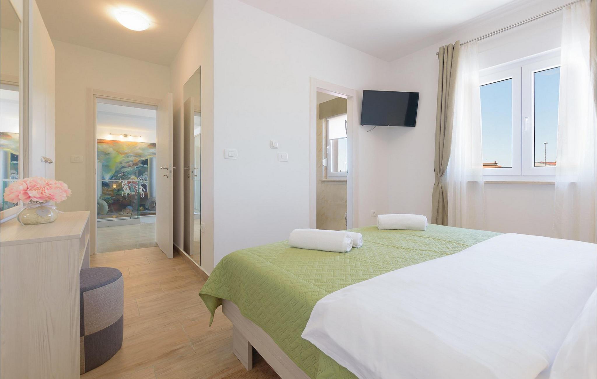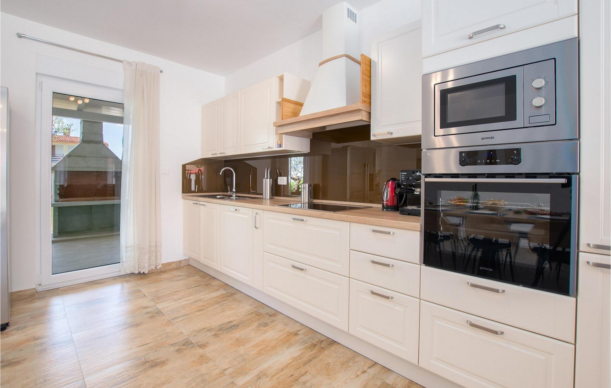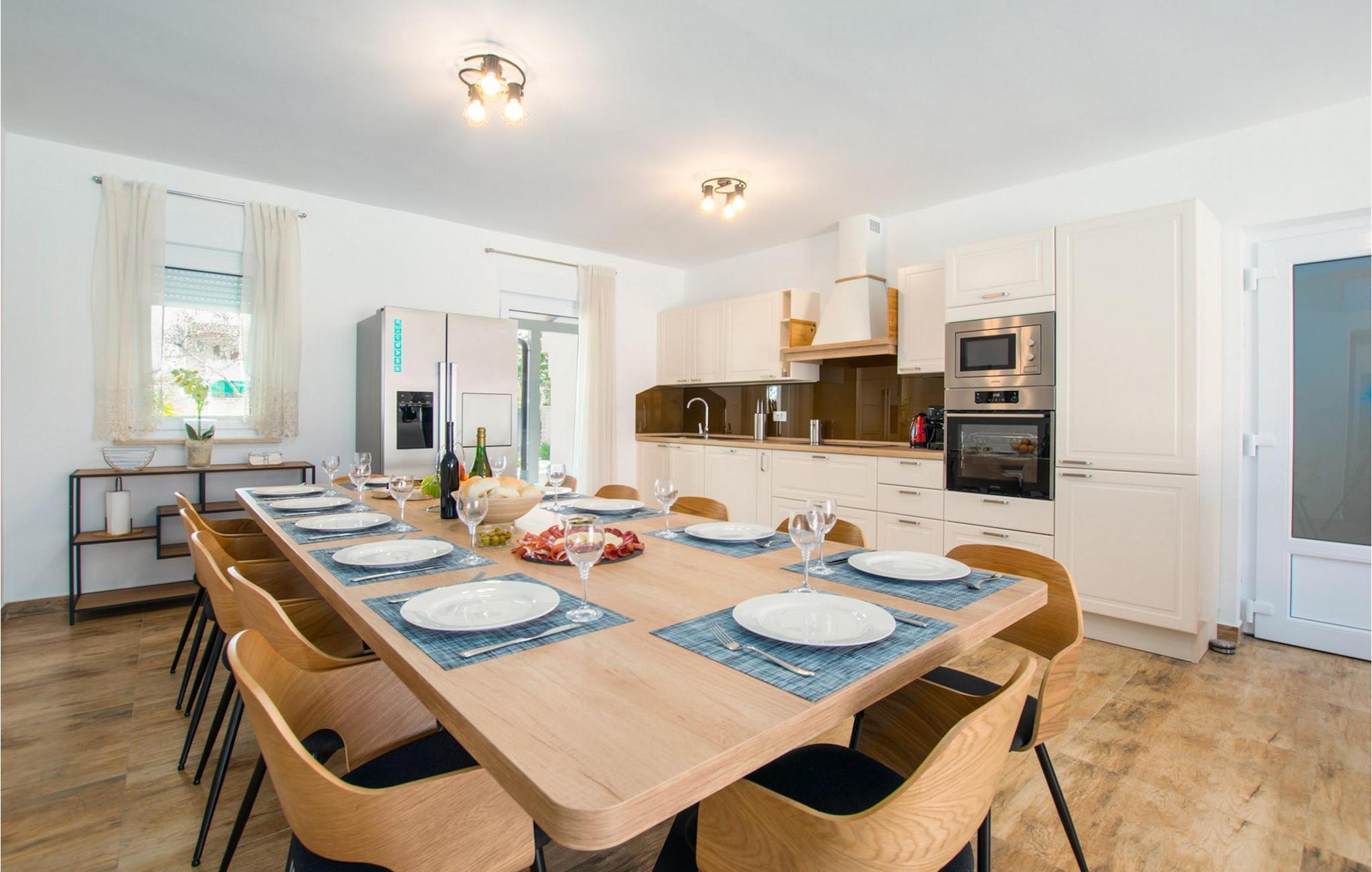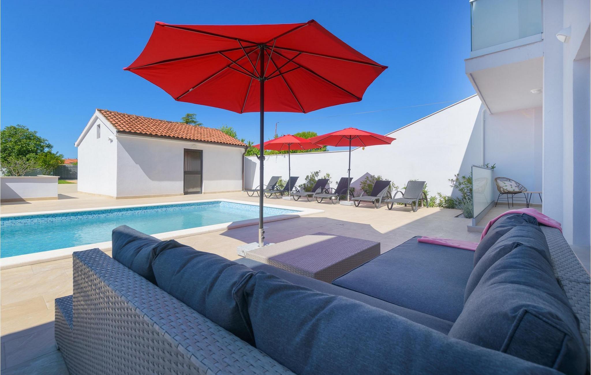 Villa Mala Vala, på Istriens vestkyst, inviterer dig til at tilbringe en afslappende ferie nær havet. Indkvarteringen for op til 12 gæster har et åbent-rum-koncept i stueetagen, der kombinerer opholds-, spise- og køkkenområderne i ét. Det rummelige, lyse værelse med varme farveaccenter skaber en hyggelig atmosfære. Ved siden af sofaen giver vinduerne i stueplan dig en smuk udsigt over og adgang til haven med den private pool. I køkkenet kan du lave dig en fremragende tekstureret espresso og nyde den på terrassen med udsigt til haven. I stueetagen finder du også to af de seks soveværelser, hvoraf det ene er forbundet med terrassen. Ovenpå venter de andre soveværelser på dig, et af dem med privat balkon. Alle soveværelser i denne villa har ensuite badeværelser med walk-in brusere. Derudover tager denne bolig din ferie til et ekstra afslappende niveau - et wellness-område findes på øverste etage. Der kan du bruge saunaen såvel som jacuzzien. Udenfor kan du bare forfriske dig selv på varme sommerdage i den private pool, lægge dig på en af liggestolene for at slikke sol eller tage plads i de komfortable havemøbler. På terrassen giver grillpladsen med spisebord og grill mulighed for at tilberede lækre måltider i den friske luft. Hvis du leder efter lidt sjov, er bordfodbolden på denne terrasse et godt valg, og de små kan glæde sig yderligere på legepladsen. Gør din næste ferie hyggelig og mindeværdig - book villa Mala Vala nu.Villa Mala Vala ligger i bygden Valbandon ved siden af den maleriske fiskerby Fažana. Kystlinjen fra Valbandon til Fažana er kendt for de lange stenstrande, der motiverer dig til at tilbringe en afslappende, smuk dag der. Du kan bruge promenaden ved havet til afslappede, omfattende gåture samt sportsaktiviteter. I det omkringliggende område finder du adskillige restauranter, især traditionelle taverner - prøv bestemt de istriske specialiteter. Du har måske muligheden for at være en del af "Valbandon ispod cripnje"- fiestaen, hvor du vil blive tilbudt autoktone, lokale måltider "ristet under klokken" - forkæl dig selv med et velsmagende måltid! Glem ikke at besøge Fažana, hvorfra du kan tage en båd til Brijuni National Park - en perfekt idé til en dagstur. Sørg også for at slentre gennem den største by i Istrien, Pula, fuld af historiske seværdigheder såsom det berømte amfiteater kaldet "Arena", og nyd den autentiske stemning.
