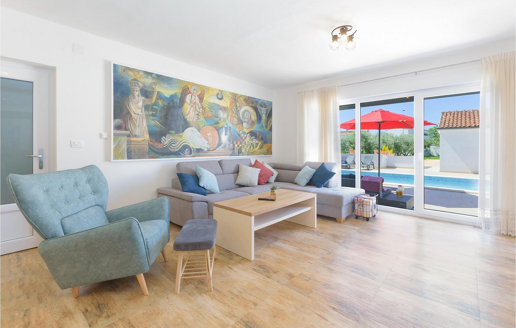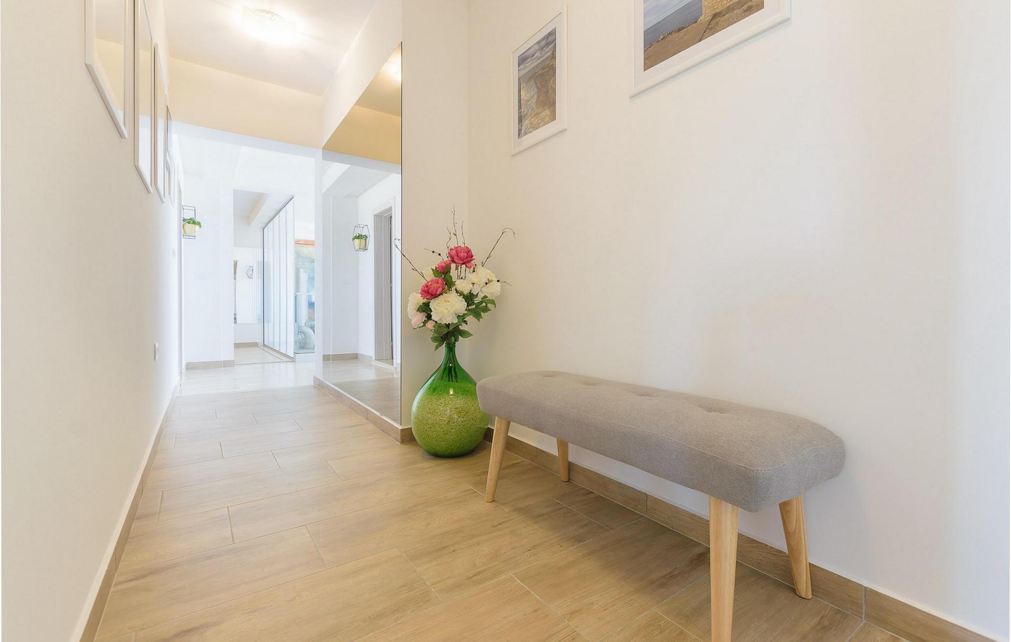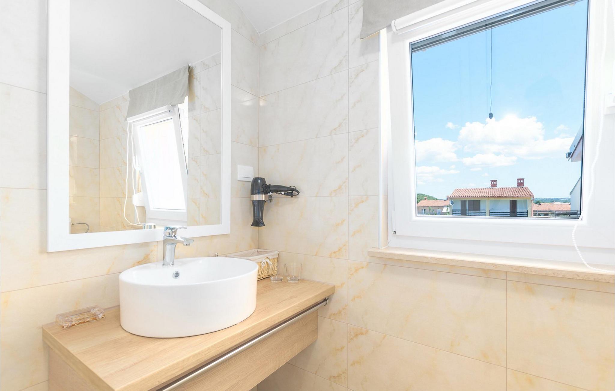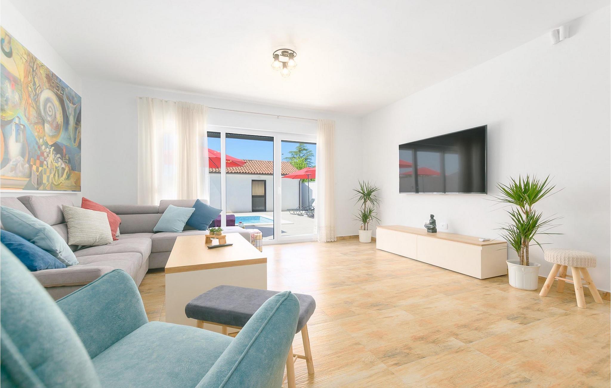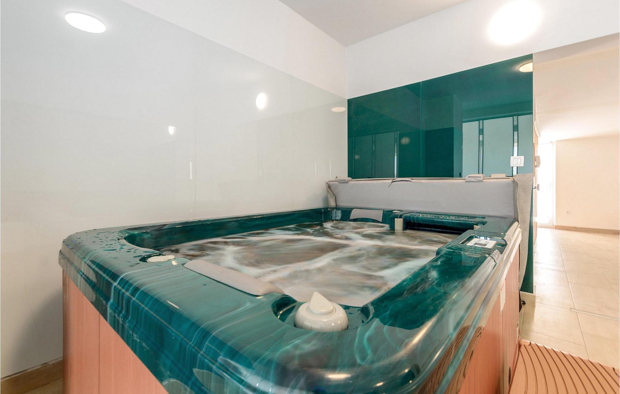 Villa Mala Vala, på Istriens vestkyst, inviterer dig til at tilbringe en afslappende ferie nær havet. Indkvarteringen for op til 12 gæster har et åbent-rum-koncept i stueetagen, der kombinerer opholds-, spise- og køkkenområderne i ét. Det rummelige, lyse værelse med varme farveaccenter skaber en hyggelig atmosfære. Ved siden af sofaen giver vinduerne i stueplan dig en smuk udsigt over og adgang til haven med den private pool. I køkkenet kan du lave dig en fremragende tekstureret espresso og nyde den på terrassen med udsigt til haven. I stueetagen finder du også to af de seks soveværelser, hvoraf det ene er forbundet med terrassen. Ovenpå venter de andre soveværelser på dig, et af dem med privat balkon. Alle soveværelser i denne villa har ensuite badeværelser med walk-in brusere. Derudover tager denne bolig din ferie til et ekstra afslappende niveau - et wellness-område findes på øverste etage. Der kan du bruge saunaen såvel som jacuzzien. Udenfor kan du bare forfriske dig selv på varme sommerdage i den private pool, lægge dig på en af liggestolene for at slikke sol eller tage plads i de komfortable havemøbler. På terrassen giver grillpladsen med spisebord og grill mulighed for at tilberede lækre måltider i den friske luft. Hvis du leder efter lidt sjov, er bordfodbolden på denne terrasse et godt valg, og de små kan glæde sig yderligere på legepladsen. Gør din næste ferie hyggelig og mindeværdig - book villa Mala Vala nu.Villa Mala Vala ligger i bygden Valbandon ved siden af den maleriske fiskerby Fažana. Kystlinjen fra Valbandon til Fažana er kendt for de lange stenstrande, der motiverer dig til at tilbringe en afslappende, smuk dag der. Du kan bruge promenaden ved havet til afslappede, omfattende gåture samt sportsaktiviteter. I det omkringliggende område finder du adskillige restauranter, især traditionelle taverner - prøv bestemt de istriske specialiteter. Du har måske muligheden for at være en del af "Valbandon ispod cripnje"- fiestaen, hvor du vil blive tilbudt autoktone, lokale måltider "ristet under klokken" - forkæl dig selv med et velsmagende måltid! Glem ikke at besøge Fažana, hvorfra du kan tage en båd til Brijuni National Park - en perfekt idé til en dagstur. Sørg også for at slentre gennem den største by i Istrien, Pula, fuld af historiske seværdigheder såsom det berømte amfiteater kaldet "Arena", og nyd den autentiske stemning.