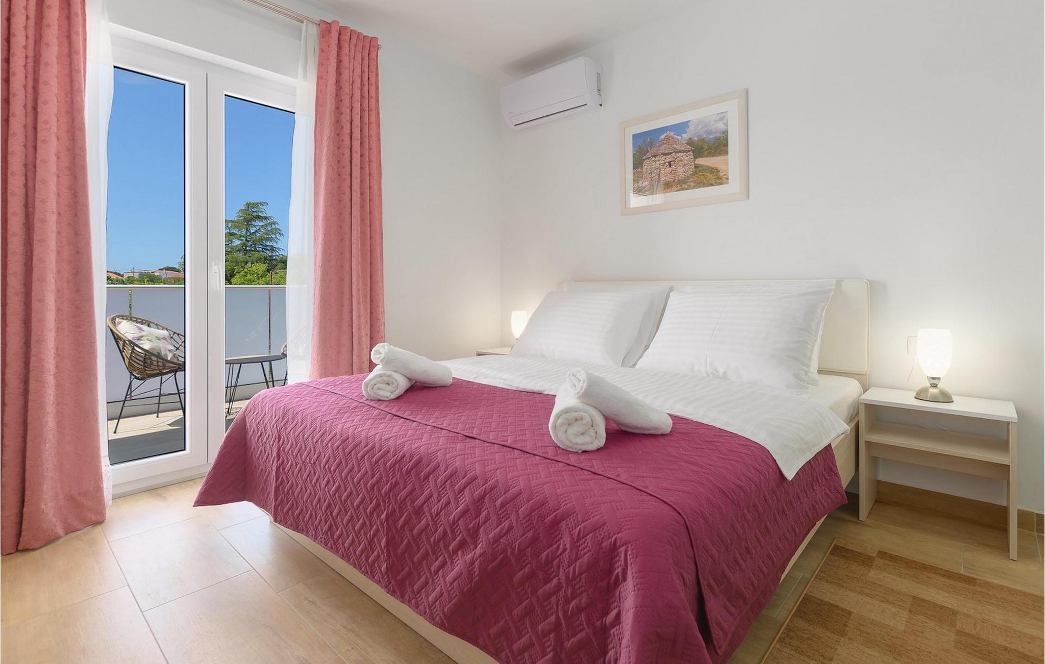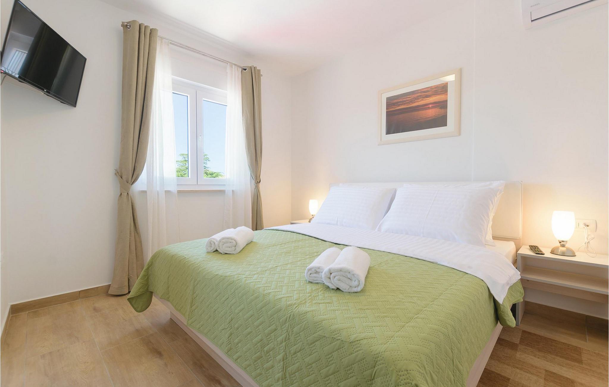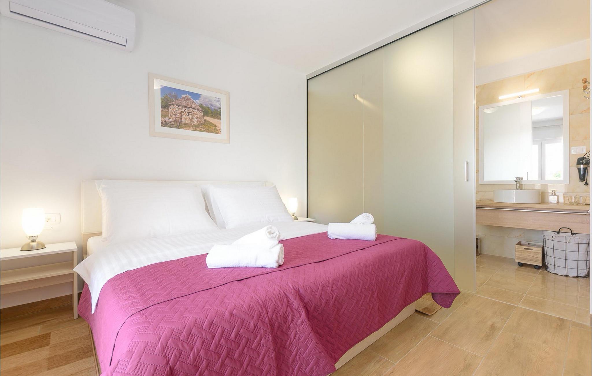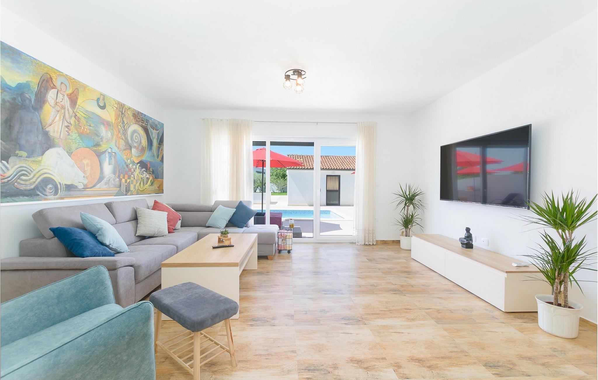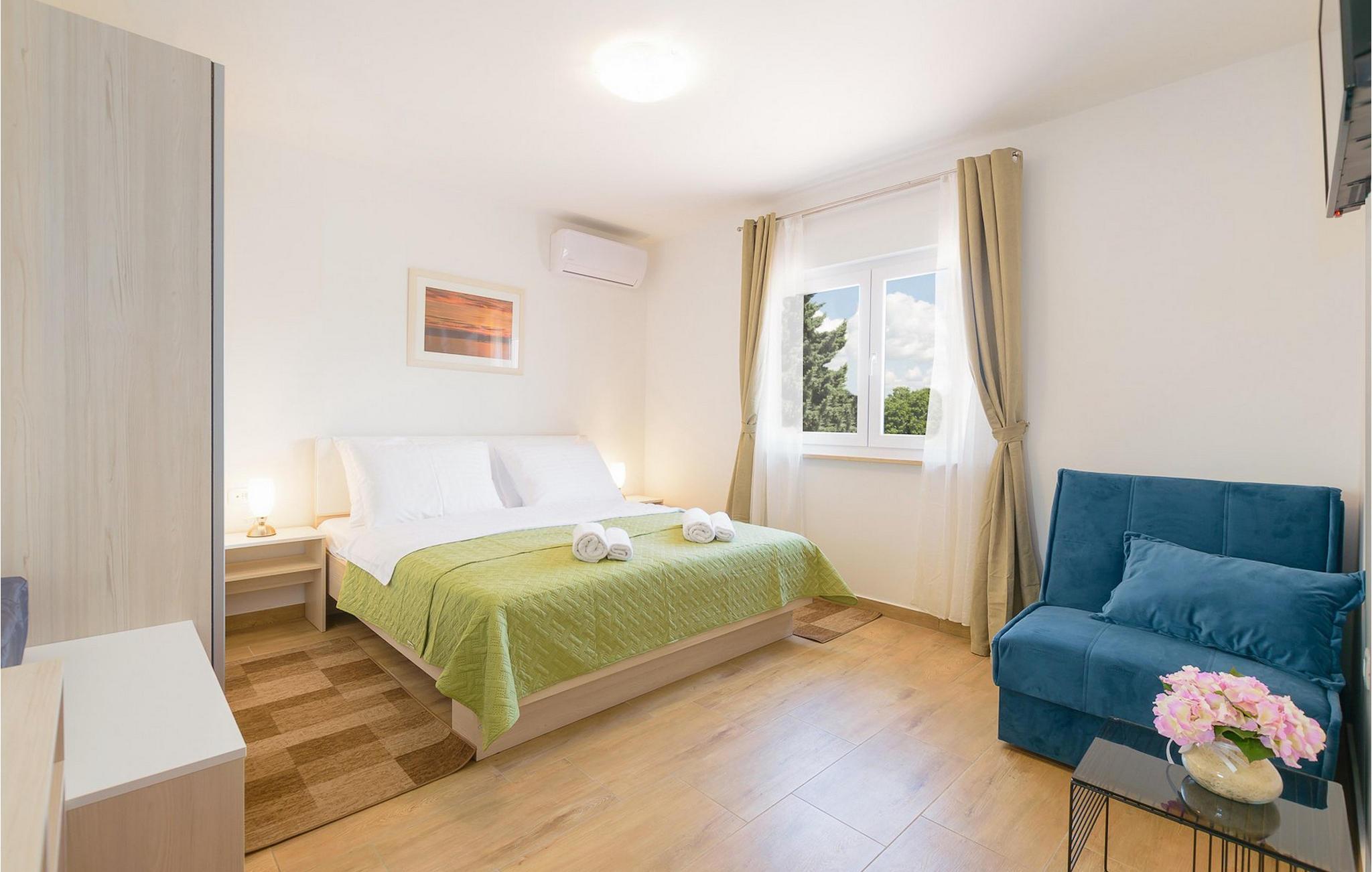 Villa Mala Vala, på Istriens vestkyst, inviterer dig til at tilbringe en afslappende ferie nær havet. Indkvarteringen for op til 12 gæster har et åbent-rum-koncept i stueetagen, der kombinerer opholds-, spise- og køkkenområderne i ét. Det rummelige, lyse værelse med varme farveaccenter skaber en hyggelig atmosfære. Ved siden af sofaen giver vinduerne i stueplan dig en smuk udsigt over og adgang til haven med den private pool. I køkkenet kan du lave dig en fremragende tekstureret espresso og nyde den på terrassen med udsigt til haven. I stueetagen finder du også to af de seks soveværelser, hvoraf det ene er forbundet med terrassen. Ovenpå venter de andre soveværelser på dig, et af dem med privat balkon. Alle soveværelser i denne villa har ensuite badeværelser med walk-in brusere. Derudover tager denne bolig din ferie til et ekstra afslappende niveau - et wellness-område findes på øverste etage. Der kan du bruge saunaen såvel som jacuzzien. Udenfor kan du bare forfriske dig selv på varme sommerdage i den private pool, lægge dig på en af liggestolene for at slikke sol eller tage plads i de komfortable havemøbler. På terrassen giver grillpladsen med spisebord og grill mulighed for at tilberede lækre måltider i den friske luft. Hvis du leder efter lidt sjov, er bordfodbolden på denne terrasse et godt valg, og de små kan glæde sig yderligere på legepladsen. Gør din næste ferie hyggelig og mindeværdig - book villa Mala Vala nu.Villa Mala Vala ligger i bygden Valbandon ved siden af den maleriske fiskerby Fažana. Kystlinjen fra Valbandon til Fažana er kendt for de lange stenstrande, der motiverer dig til at tilbringe en afslappende, smuk dag der. Du kan bruge promenaden ved havet til afslappede, omfattende gåture samt sportsaktiviteter. I det omkringliggende område finder du adskillige restauranter, især traditionelle taverner - prøv bestemt de istriske specialiteter. Du har måske muligheden for at være en del af "Valbandon ispod cripnje"- fiestaen, hvor du vil blive tilbudt autoktone, lokale måltider "ristet under klokken" - forkæl dig selv med et velsmagende måltid! Glem ikke at besøge Fažana, hvorfra du kan tage en båd til Brijuni National Park - en perfekt idé til en dagstur. Sørg også for at slentre gennem den største by i Istrien, Pula, fuld af historiske seværdigheder såsom det berømte amfiteater kaldet "Arena", og nyd den autentiske stemning.