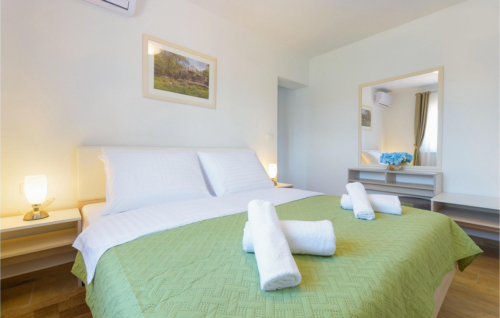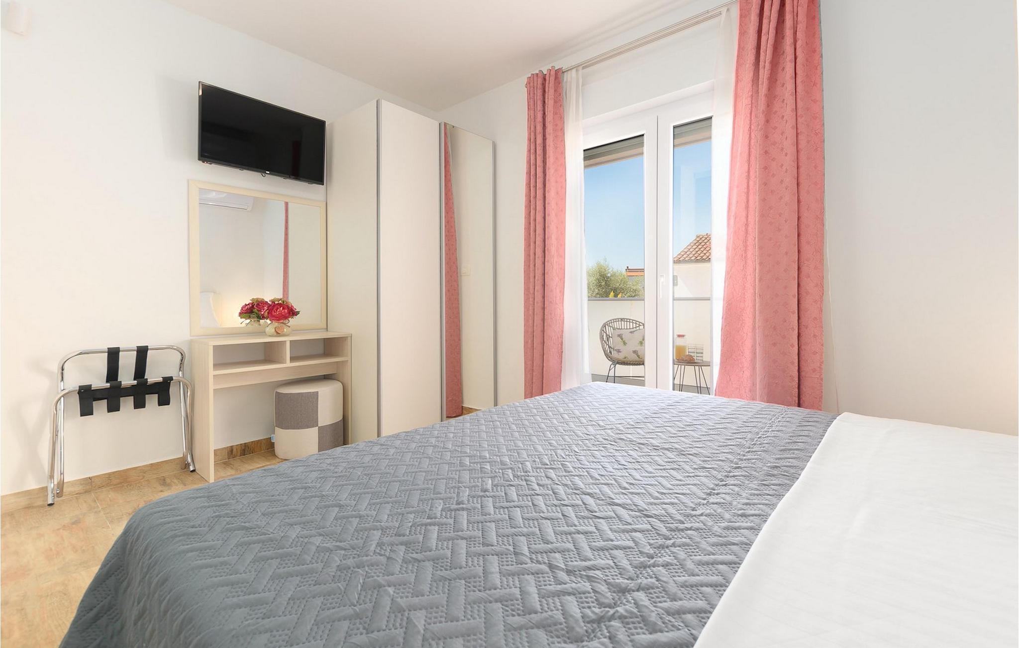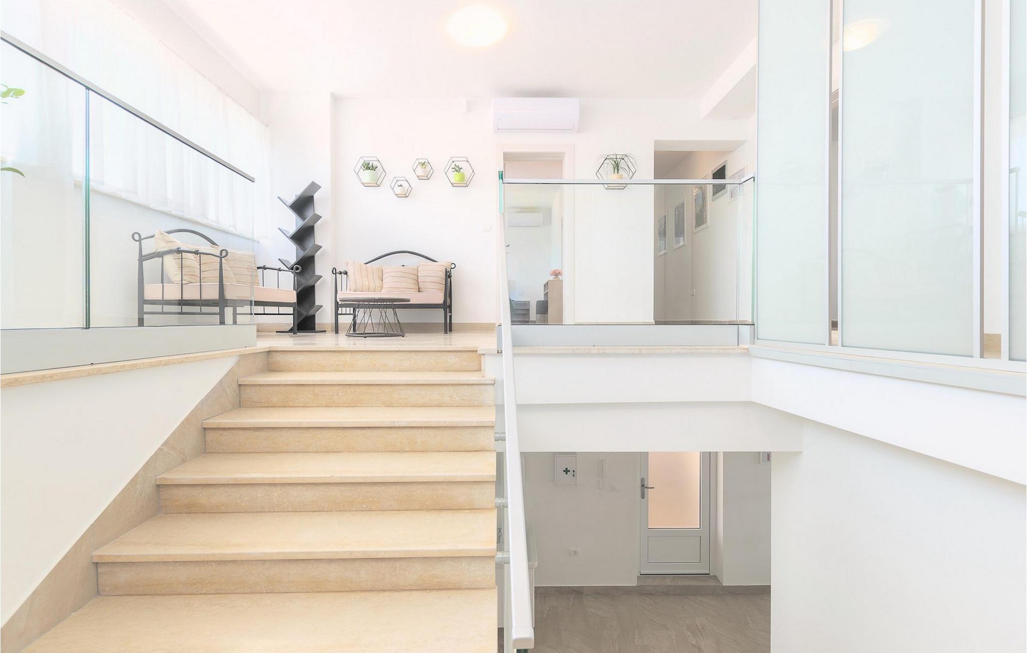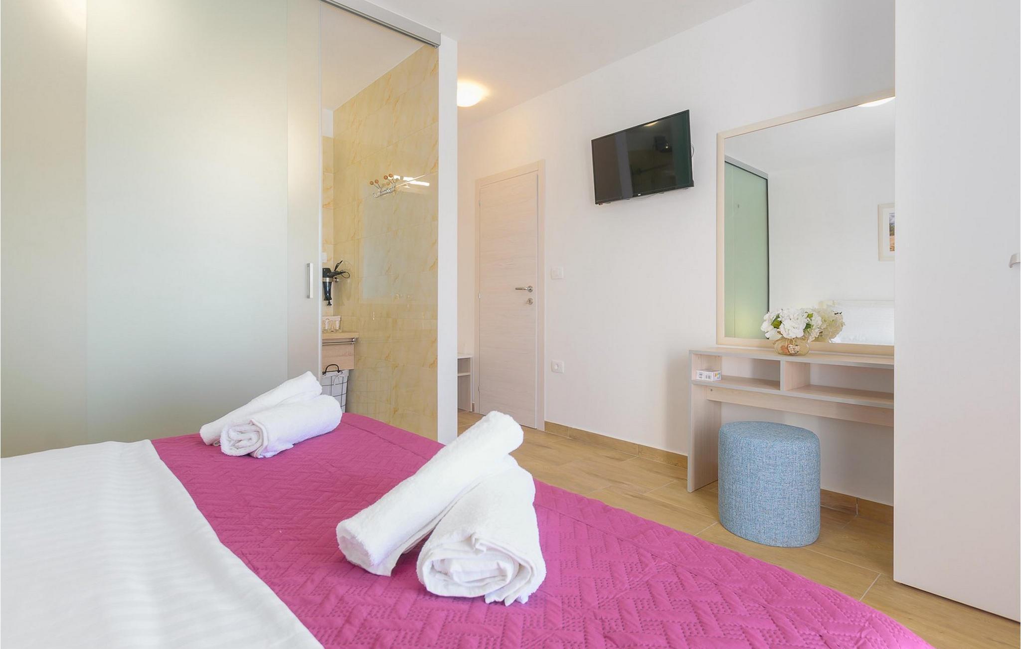 Villa Mala Vala, på Istriens vestkyst, inviterer dig til at tilbringe en afslappende ferie nær havet. Indkvarteringen for op til 12 gæster har et åbent-rum-koncept i stueetagen, der kombinerer opholds-, spise- og køkkenområderne i ét. Det rummelige, lyse værelse med varme farveaccenter skaber en hyggelig atmosfære. Ved siden af sofaen giver vinduerne i stueplan dig en smuk udsigt over og adgang til haven med den private pool. I køkkenet kan du lave dig en fremragende tekstureret espresso og nyde den på terrassen med udsigt til haven. I stueetagen finder du også to af de seks soveværelser, hvoraf det ene er forbundet med terrassen. Ovenpå venter de andre soveværelser på dig, et af dem med privat balkon. Alle soveværelser i denne villa har ensuite badeværelser med walk-in brusere. Derudover tager denne bolig din ferie til et ekstra afslappende niveau - et wellness-område findes på øverste etage. Der kan du bruge saunaen såvel som jacuzzien. Udenfor kan du bare forfriske dig selv på varme sommerdage i den private pool, lægge dig på en af liggestolene for at slikke sol eller tage plads i de komfortable havemøbler. På terrassen giver grillpladsen med spisebord og grill mulighed for at tilberede lækre måltider i den friske luft. Hvis du leder efter lidt sjov, er bordfodbolden på denne terrasse et godt valg, og de små kan glæde sig yderligere på legepladsen. Gør din næste ferie hyggelig og mindeværdig - book villa Mala Vala nu.Villa Mala Vala ligger i bygden Valbandon ved siden af den maleriske fiskerby Fažana. Kystlinjen fra Valbandon til Fažana er kendt for de lange stenstrande, der motiverer dig til at tilbringe en afslappende, smuk dag der. Du kan bruge promenaden ved havet til afslappede, omfattende gåture samt sportsaktiviteter. I det omkringliggende område finder du adskillige restauranter, især traditionelle taverner - prøv bestemt de istriske specialiteter. Du har måske muligheden for at være en del af "Valbandon ispod cripnje"- fiestaen, hvor du vil blive tilbudt autoktone, lokale måltider "ristet under klokken" - forkæl dig selv med et velsmagende måltid! Glem ikke at besøge Fažana, hvorfra du kan tage en båd til Brijuni National Park - en perfekt idé til en dagstur. Sørg også for at slentre gennem den største by i Istrien, Pula, fuld af historiske seværdigheder såsom det berømte amfiteater kaldet "Arena", og nyd den autentiske stemning.