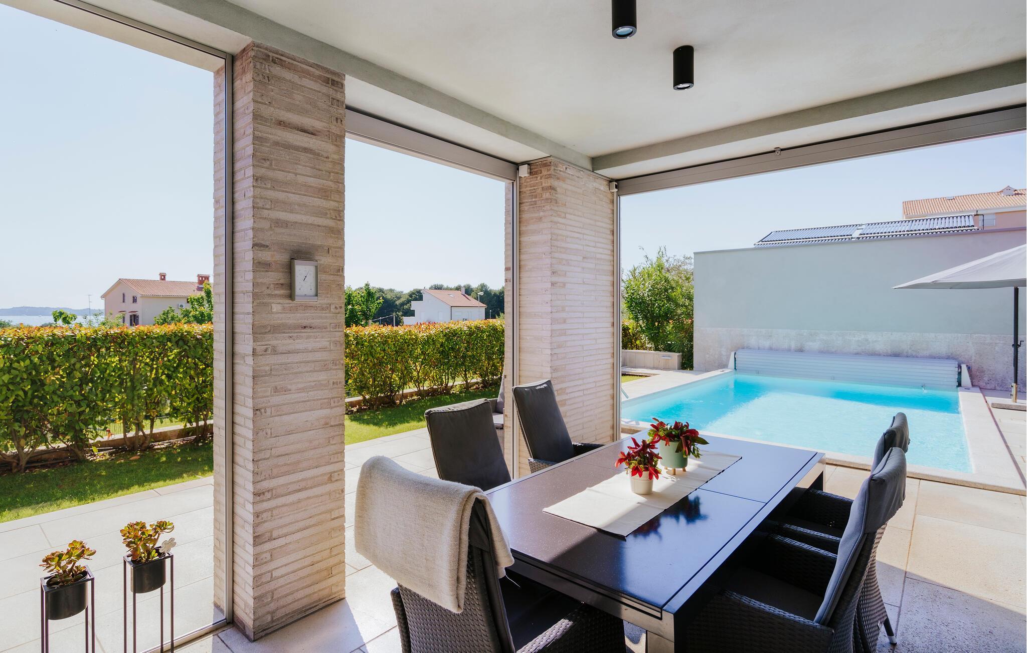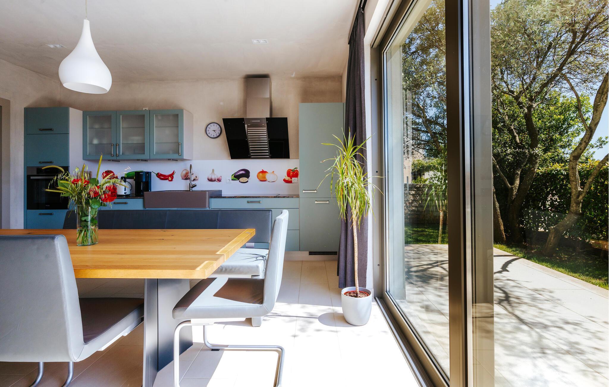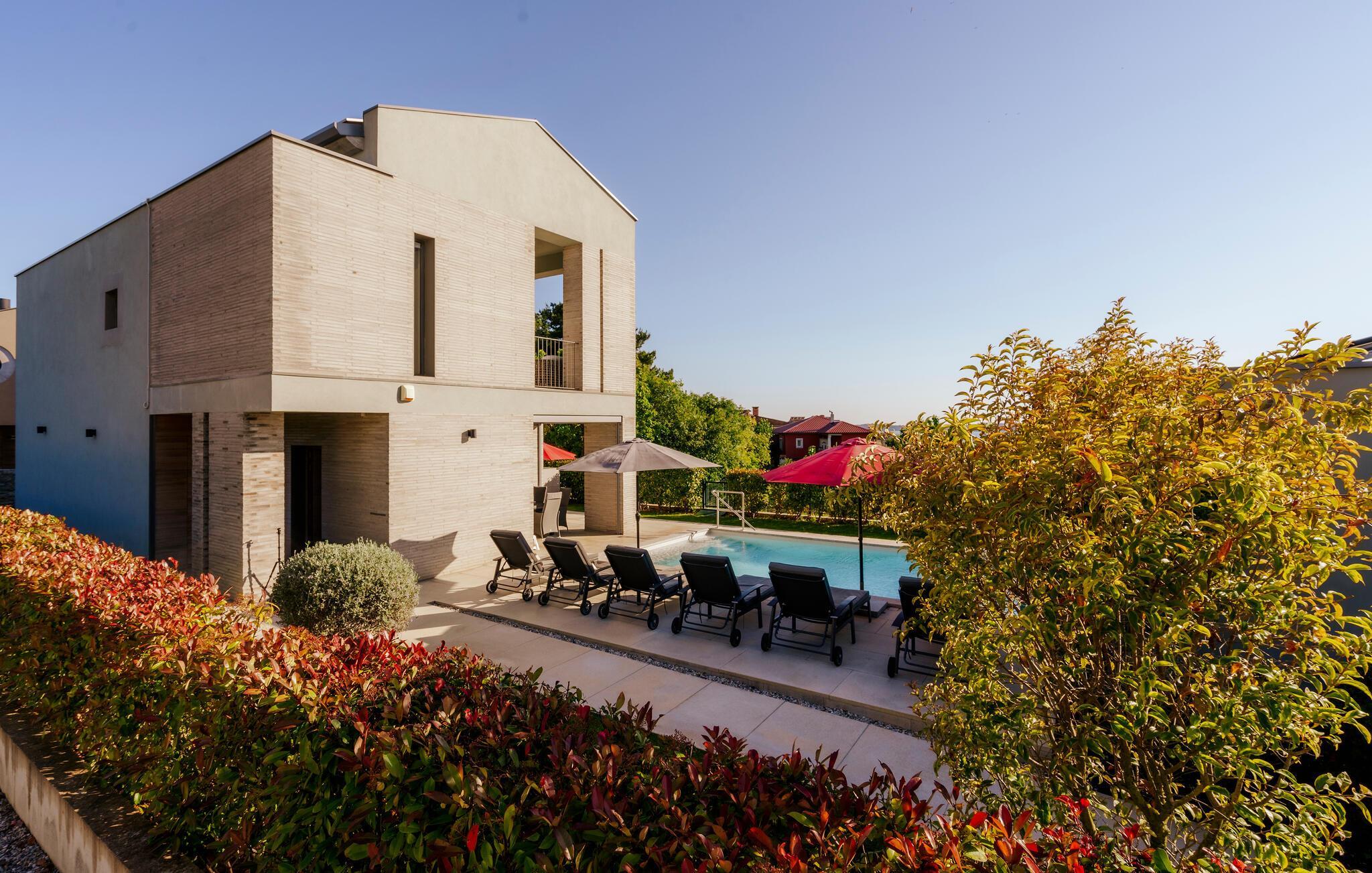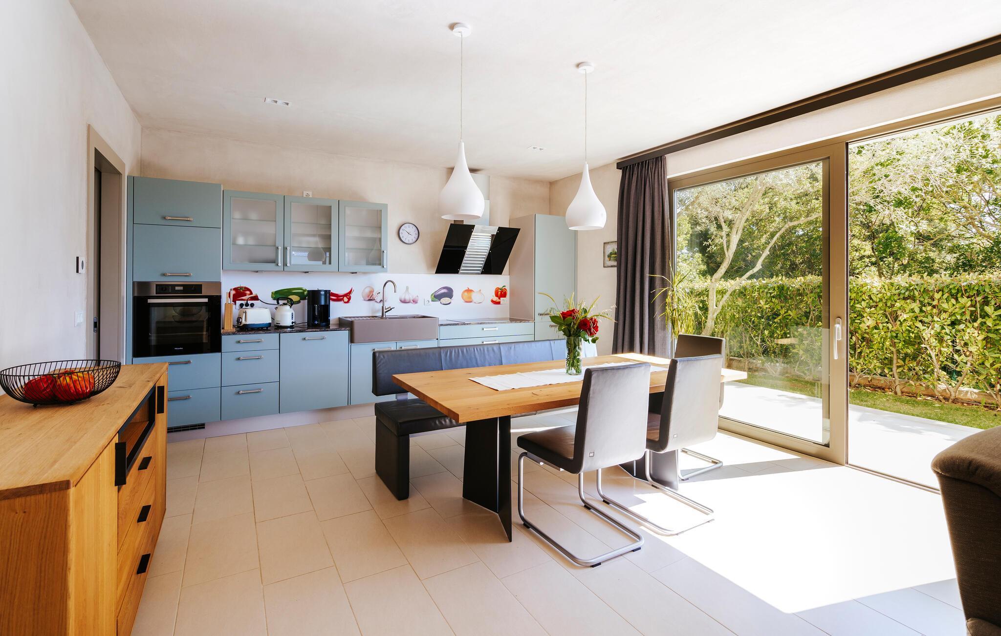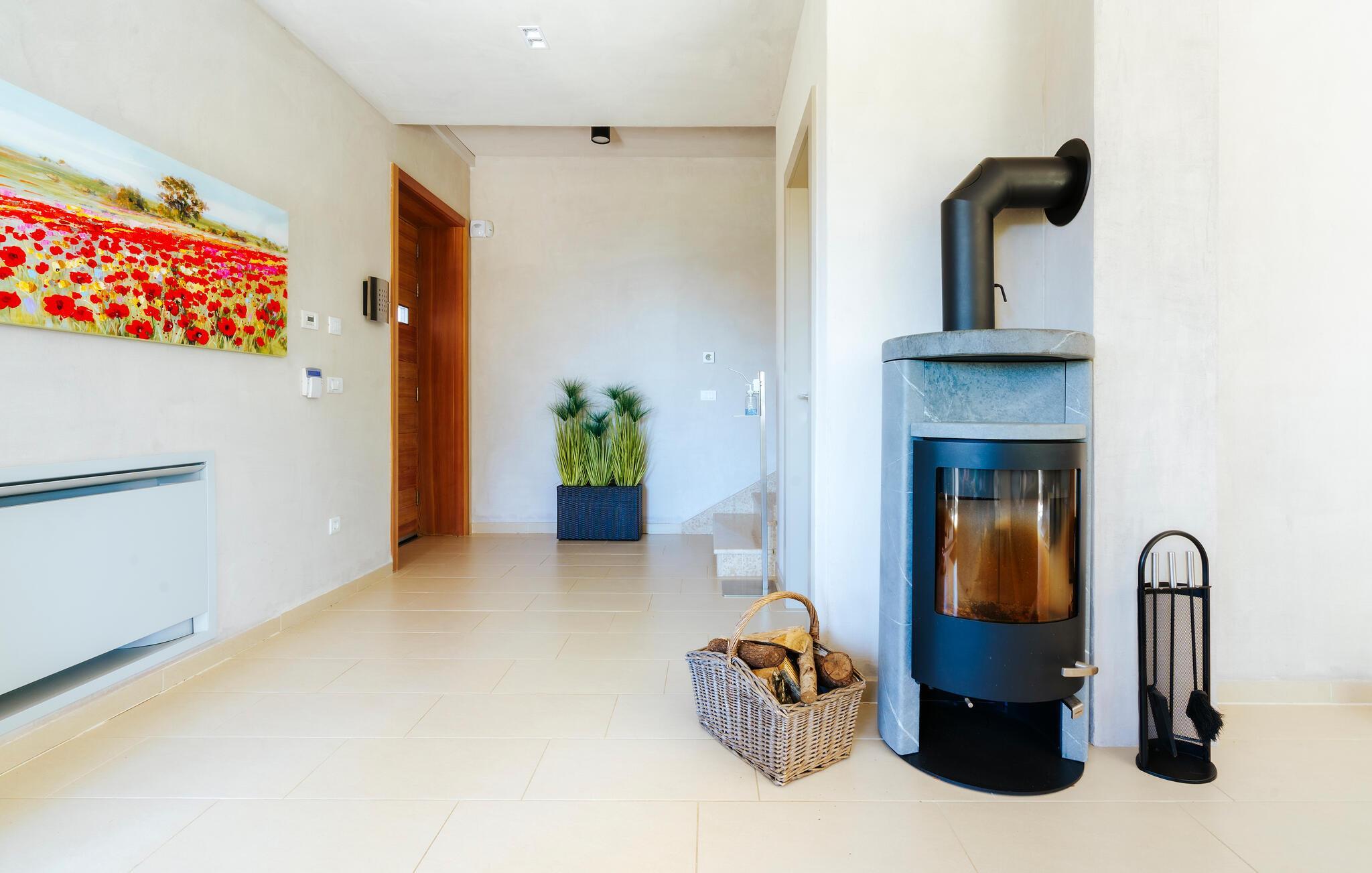 Villa Mima ist eine wunderschöne Villa in Fažana, perfekt geeignet für eine Familie oder Freundesgruppe von 6 Gästen. Die Villa bietet Gästen einen großen Garten und einen privaten Pool für die dringend benötigte Erfrischung an heißen Sommertagen. Erwachsene können es genießen, auf den Liegestühlen zu entspannen und die warme Mittelmeersonne zu genießen, während die Kinder im Pool spielen. Sie können traditionelle Kroatische Speisen auf dem Grill zubereiten und diese Köstlichkeiten im überdachten Essbereich draußen genießen. Für zusätzlichen Spaß stehen den Gästen Citybikes und E-Bikes sowie gegen Aufpreis E-Motorräder zur Erkundung der Umgebung zur Verfügung. Das Innere der Villa Mima ist stilvoll eingerichtet und sehr gut ausgestattet. Dabei finden die Gäste im Erdgeschoss ein geräumiges Wohnzimmer mit TV und Kamin, eine gut ausgestattete Küche und einen gemütlichen Essbereich sowie ein separates WC. Auf der ersten Etage befinden sich 3 Schlafzimmer und ihre 3 en-suite Badezimmer. 2 Schlafzimmer verfügen über Doppelbetten, während das 3. Schlafzimmer über 2 Einzelbetten verfügt, die zusammengeschoben werden können. Jedes Badezimmer verfügt über eine Dusche, während alle Schlafzimmer über einen Fernseher verfügen und voll klimatisiert sind. Die Gäste können ihren ersten Morgenkaffee von den Balkonen im Obergeschoss mit schönem Meerblick genießen. Die Villa Mima liegt außerdem nur 400 m vom Strand entfernt, was zusätzlichen Spaß für die ganze Reisegruppe bedeutet. Wenn Sie während Ihres Urlaubs in Istrien hervorrageFažana ist ein ausgezeichnetes Urlaubsziel für alle, die schöne Strände, klares Meer, ein warmes mediterranes Klima und freundliche und hilfsbereite Einheimische suchen. Dieses Urlaubsziel hat eine interessante Geschichte und Tradition, seine Straßen sind gefüllt mit dem, was viele als "wahren istrischen Charme" bezeichnen, und die Stadt hat ein ausgezeichnetes Angebot für alle Gastronomieliebhaber. Fažana, wie auch Istrien im Allgemeinen, ist bekannt für sein Olivenöl, Fischgerichte, Trüffelgerichte und eine Vielzahl anderer traditioneller Spezialitäten. Sie können in exquisiten Restaurants direkt an der Küste der Stadt speisen und die warmen Sommerabende mit Ihrer Liebsten bei einem romantischen Spaziergang genießen. Die natürliche Schönheit dieser Stadt und der umliegenden Strände sollte nicht übersehen werden. Viele Strände sind für Kinder geeignet, sodass dem Familienurlaub Ihrer Träume nichts im Wege stehen sollte. Diese Lage ist auch ideal für Tagesausflüge in andere großartige Städte wie Pula und Rovinj sowie den atemberaubenden Nationalpark Brijuni. Sie werden es nicht bereuen, wenn Sie Ihren Urlaub in Istrien und Fažana verbringen. Istrien wartet auf Sie!