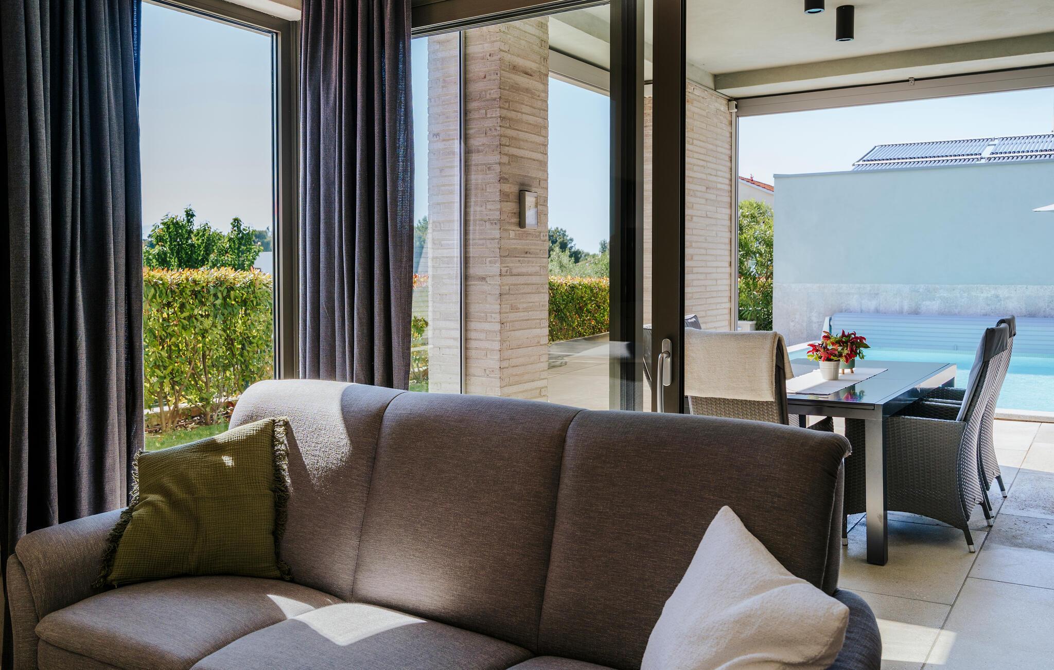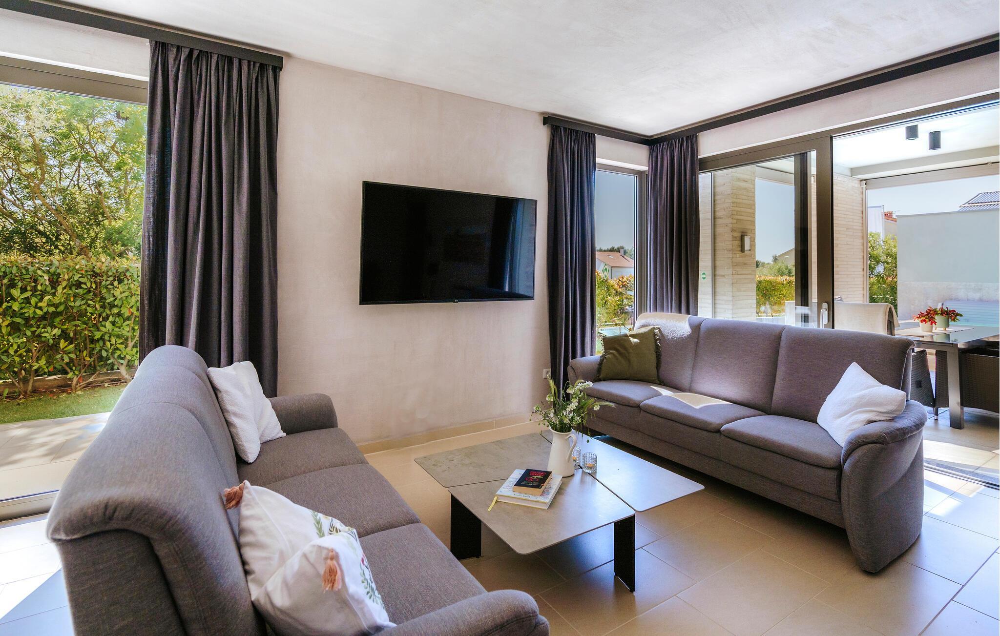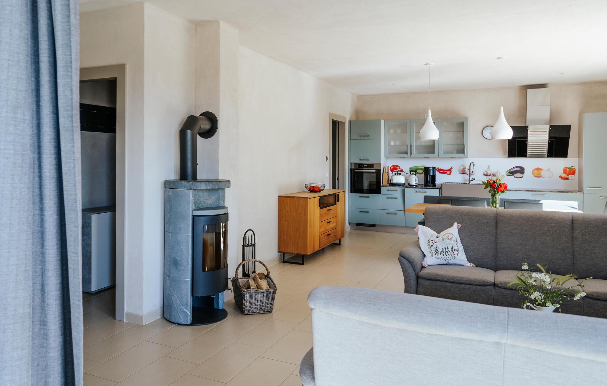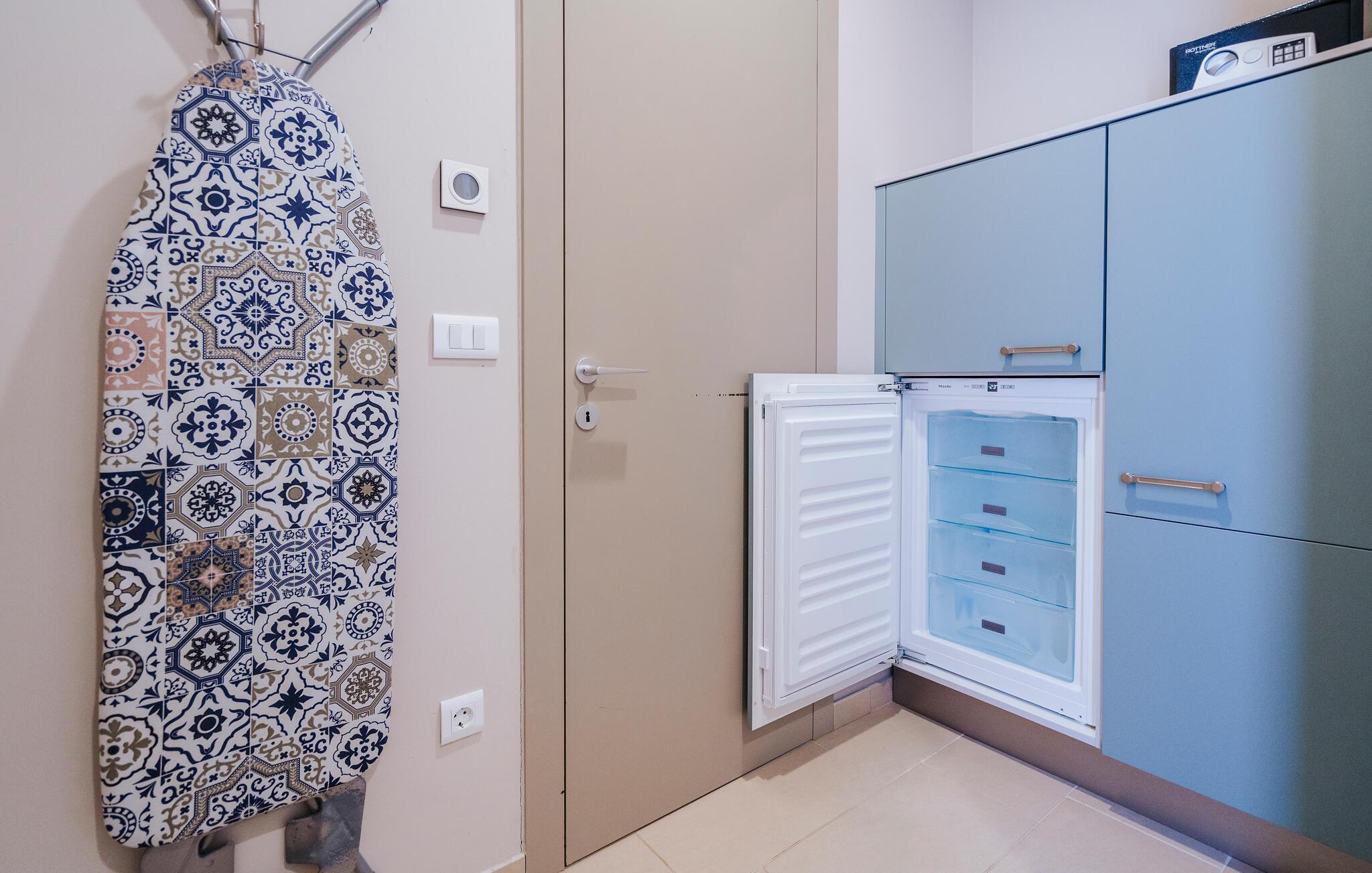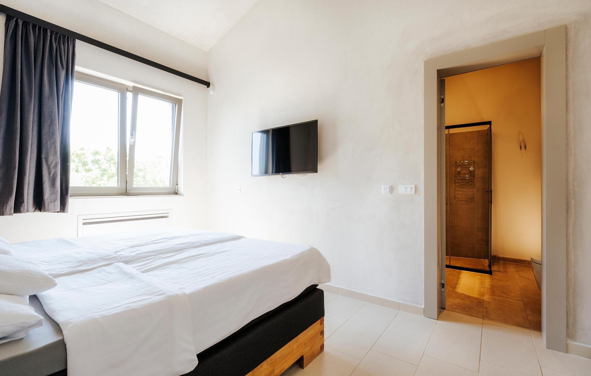 Villa Mima ist eine wunderschöne Villa in Fažana, perfekt geeignet für eine Familie oder Freundesgruppe von 6 Gästen. Die Villa bietet Gästen einen großen Garten und einen privaten Pool für die dringend benötigte Erfrischung an heißen Sommertagen. Erwachsene können es genießen, auf den Liegestühlen zu entspannen und die warme Mittelmeersonne zu genießen, während die Kinder im Pool spielen. Sie können traditionelle Kroatische Speisen auf dem Grill zubereiten und diese Köstlichkeiten im überdachten Essbereich draußen genießen. Für zusätzlichen Spaß stehen den Gästen Citybikes und E-Bikes sowie gegen Aufpreis E-Motorräder zur Erkundung der Umgebung zur Verfügung. Das Innere der Villa Mima ist stilvoll eingerichtet und sehr gut ausgestattet. Dabei finden die Gäste im Erdgeschoss ein geräumiges Wohnzimmer mit TV und Kamin, eine gut ausgestattete Küche und einen gemütlichen Essbereich sowie ein separates WC. Auf der ersten Etage befinden sich 3 Schlafzimmer und ihre 3 en-suite Badezimmer. 2 Schlafzimmer verfügen über Doppelbetten, während das 3. Schlafzimmer über 2 Einzelbetten verfügt, die zusammengeschoben werden können. Jedes Badezimmer verfügt über eine Dusche, während alle Schlafzimmer über einen Fernseher verfügen und voll klimatisiert sind. Die Gäste können ihren ersten Morgenkaffee von den Balkonen im Obergeschoss mit schönem Meerblick genießen. Die Villa Mima liegt außerdem nur 400 m vom Strand entfernt, was zusätzlichen Spaß für die ganze Reisegruppe bedeutet. Wenn Sie während Ihres Urlaubs in Istrien hervorrageFažana ist ein ausgezeichnetes Urlaubsziel für alle, die schöne Strände, klares Meer, ein warmes mediterranes Klima und freundliche und hilfsbereite Einheimische suchen. Dieses Urlaubsziel hat eine interessante Geschichte und Tradition, seine Straßen sind gefüllt mit dem, was viele als "wahren istrischen Charme" bezeichnen, und die Stadt hat ein ausgezeichnetes Angebot für alle Gastronomieliebhaber. Fažana, wie auch Istrien im Allgemeinen, ist bekannt für sein Olivenöl, Fischgerichte, Trüffelgerichte und eine Vielzahl anderer traditioneller Spezialitäten. Sie können in exquisiten Restaurants direkt an der Küste der Stadt speisen und die warmen Sommerabende mit Ihrer Liebsten bei einem romantischen Spaziergang genießen. Die natürliche Schönheit dieser Stadt und der umliegenden Strände sollte nicht übersehen werden. Viele Strände sind für Kinder geeignet, sodass dem Familienurlaub Ihrer Träume nichts im Wege stehen sollte. Diese Lage ist auch ideal für Tagesausflüge in andere großartige Städte wie Pula und Rovinj sowie den atemberaubenden Nationalpark Brijuni. Sie werden es nicht bereuen, wenn Sie Ihren Urlaub in Istrien und Fažana verbringen. Istrien wartet auf Sie!