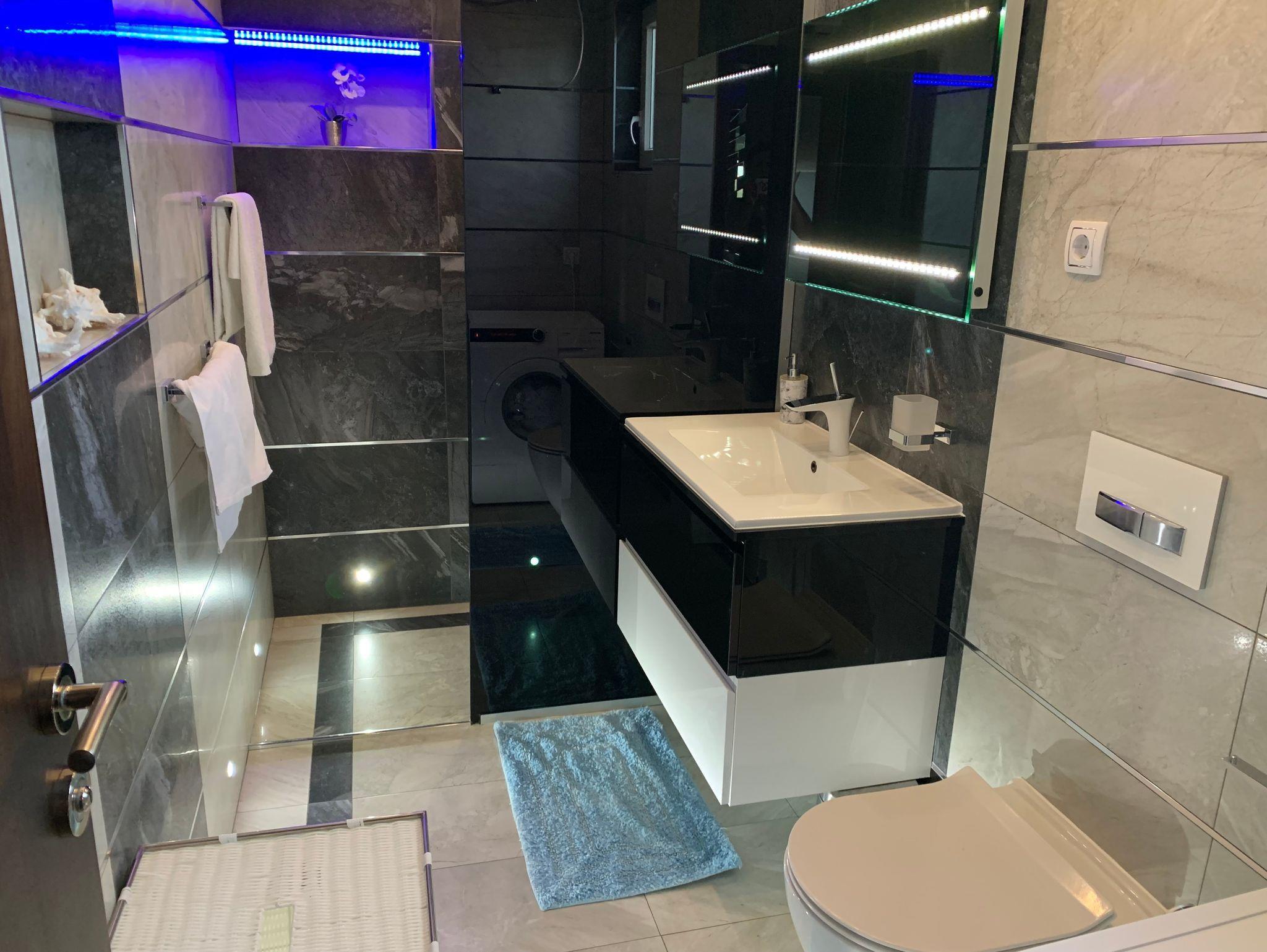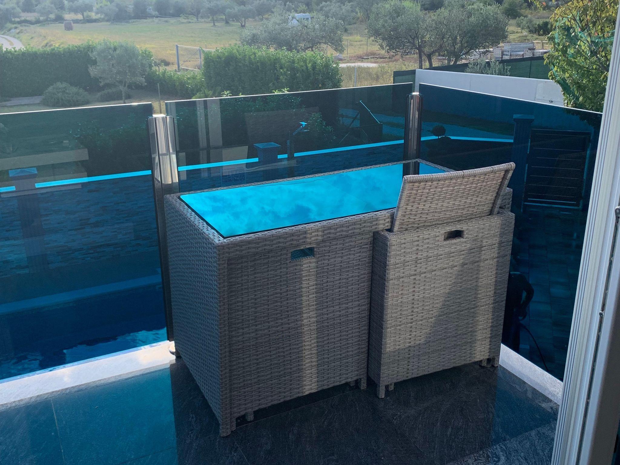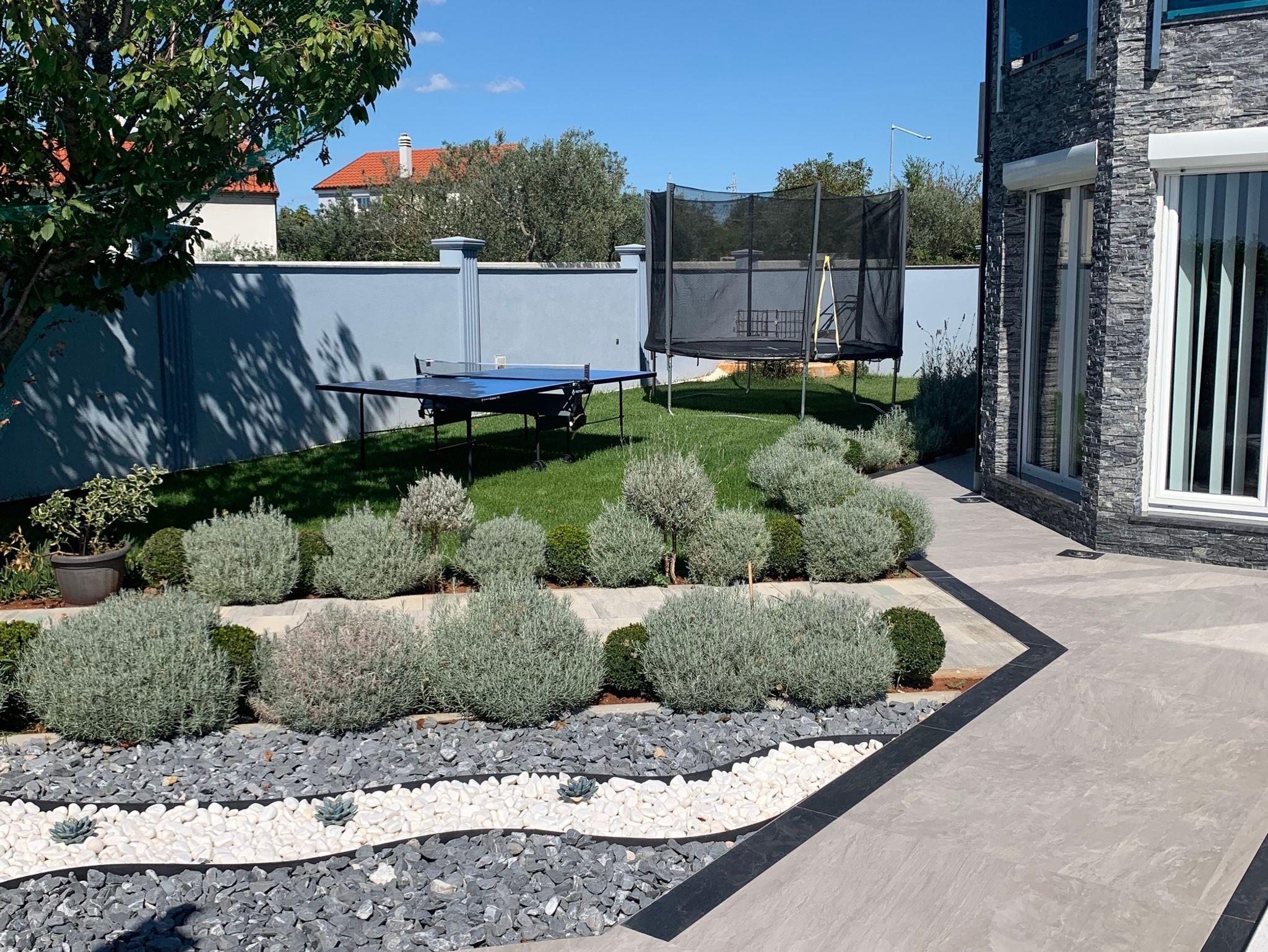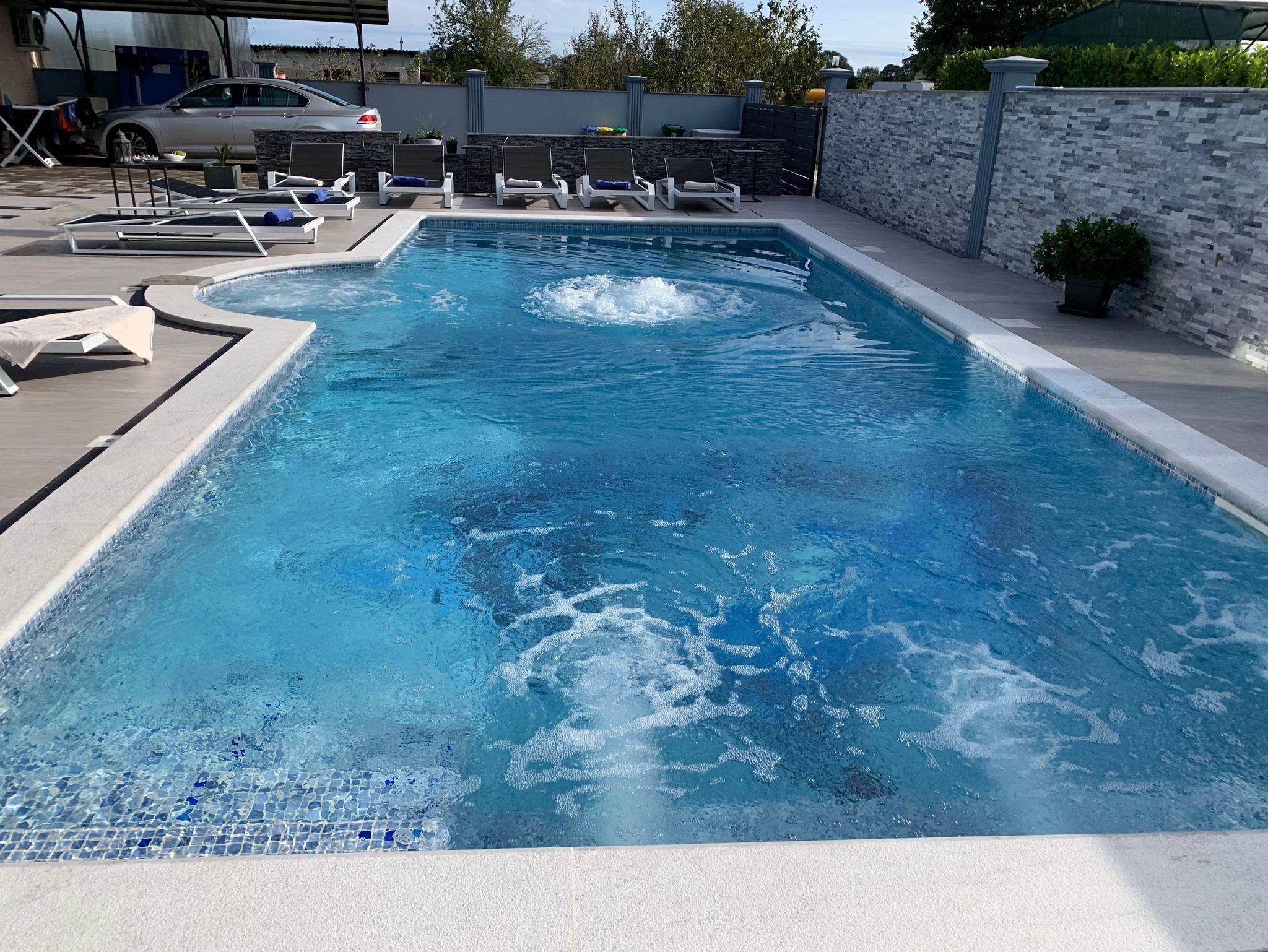 Umgebung des Objekts (Eingerichtet), Hof (500m2, Kinderbereich, Sitzbereich), Parkplatz (Anzahl der Parkplätze: 4, Entfernung vom Objekt: im Hof), Pool: privat, Dimensionen: 9m x 4m x 1.35m, Wassertyp: Salzwasser, Heizung: Ja, WiFi Internet, Fahrrad (Anzahl: 2), Föhn, Bügeleisen, Bügelbrett, Sonnenschirm, Liegestühle, Kinderbett