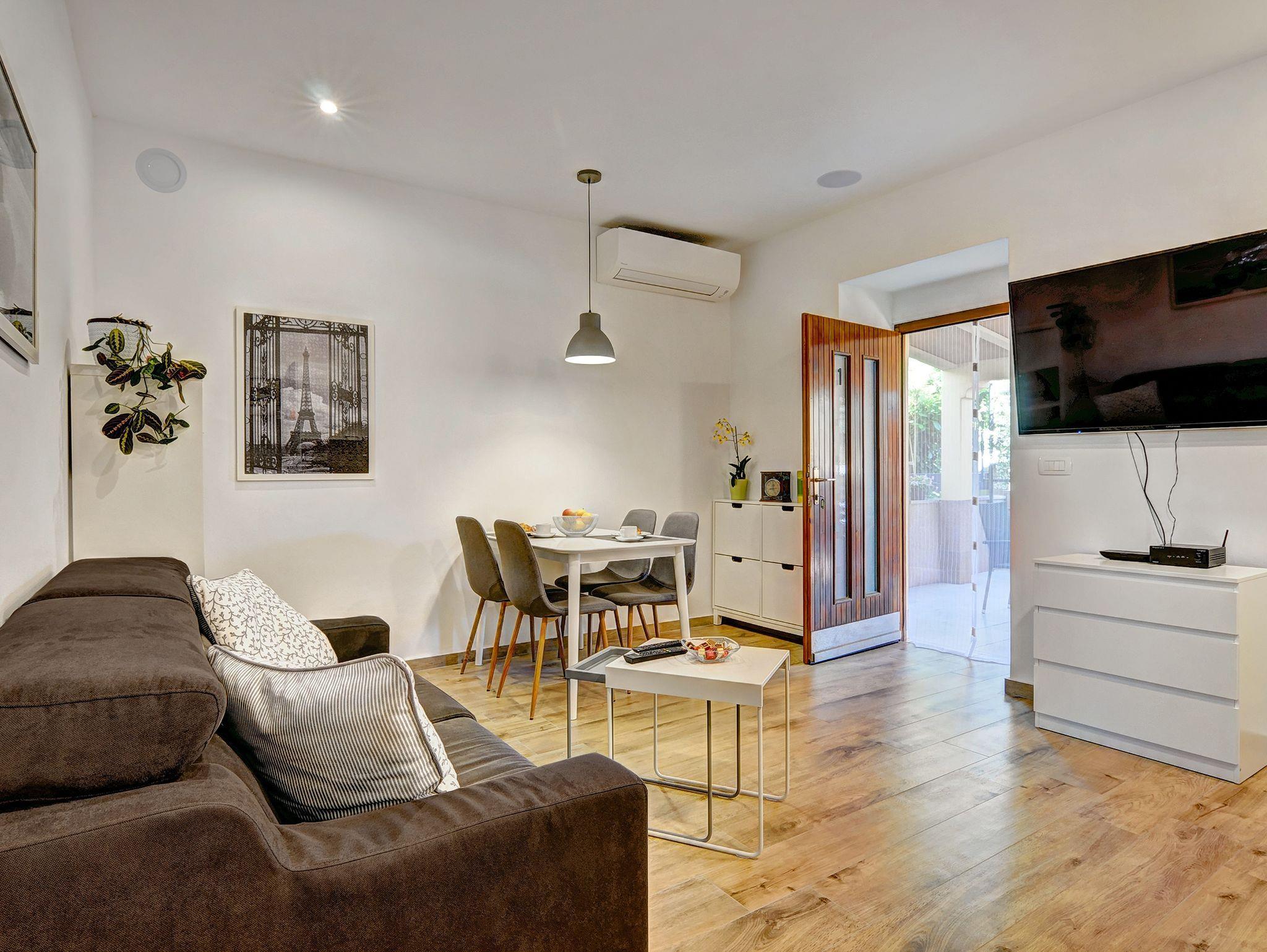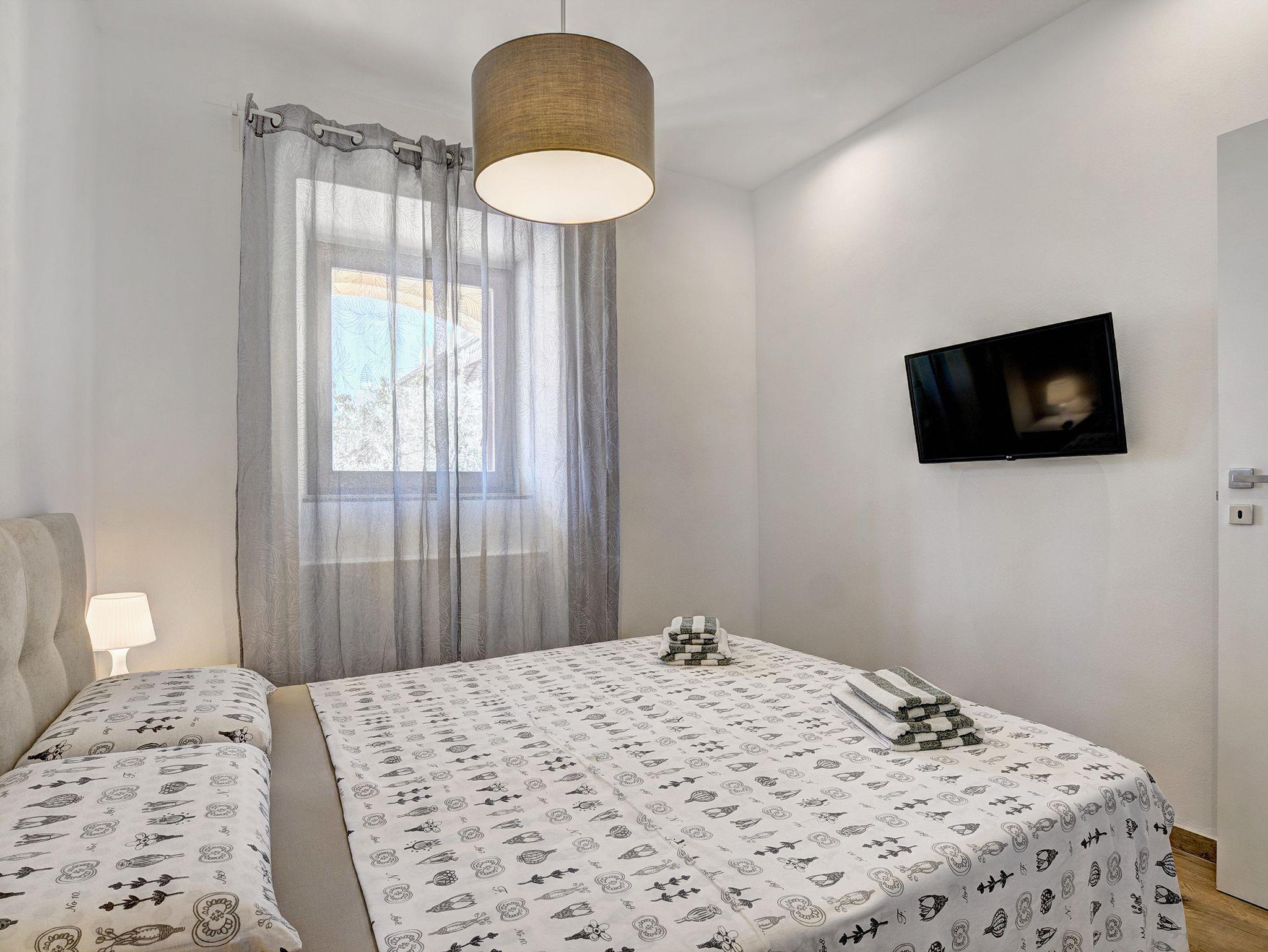 Ferienwohnung bietet Platz für 5 Gäste. Die Betten sind in Schlafzimmern, die es 2 gibt, und in Wohnzimmer, innerhalb einer Gesamtfläche von 45m2, angeordnet. Die Gäste haben eine eigene Terrasse zur Verfügung, auf der sie in warmen Sommernächten genießen können. Es ist erlaubt, Speisen auf dem Gemeinschafts-Grill vorzubereiten. IM PREIS INBEGRIFFEN: Kurtaxe, Endreinigung, Klimatisierung, Parkplatz, Internet, Bügeleisen, Föhn. Die Verfügbarkeit zusätzlicher Dienstleistungen in Ihrem reservierten Termin und die Preise derselben (falls nicht aufgeführt) müssen im Voraus überprüft werden. Zusätzliche Dienstleistungen die in der Zahlungsaufforderung nicht aufgeführt sind werden direkt beim Vermieter bezahlt, angenommen der Gast nutzt auch diese.