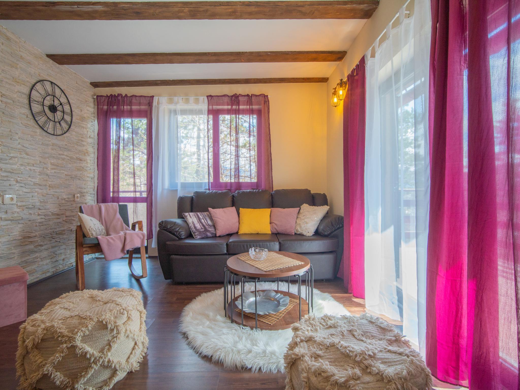 2-room chalet 85 m2 on 3 levels. Living room with 1 double sofabed (140 cm, length 190 cm), open-hearth fireplace (only for decoration), TV. Exit to the balcony, to the terrace. Shower/WC. On the lower ground floor: open kitchen (2 hot plates, oven, dishwasher, kettle, microwave, electric coffee machine) with dining table. Exit to the terrace. Sep. WC. Top floor: (steep stair), 1 open room with sloping ceilings, ceiling height 45 - 220 cm with 2 beds (90 cm, length 190 cm), 1 french bed (140 cm, length 190 cm). Exit to the balcony. Heating available only from 01.09. to 31.05. 2 small balconies 4 m2, balcony 6 m2, terrace 12 m2, terrace 18 m2. Terrace furniture, deck chairs, box-room. View of the forest. Facilities: baby cot, hair dryer. Internet (WiFi, free). Maximum 1 pet/ dog allowed.