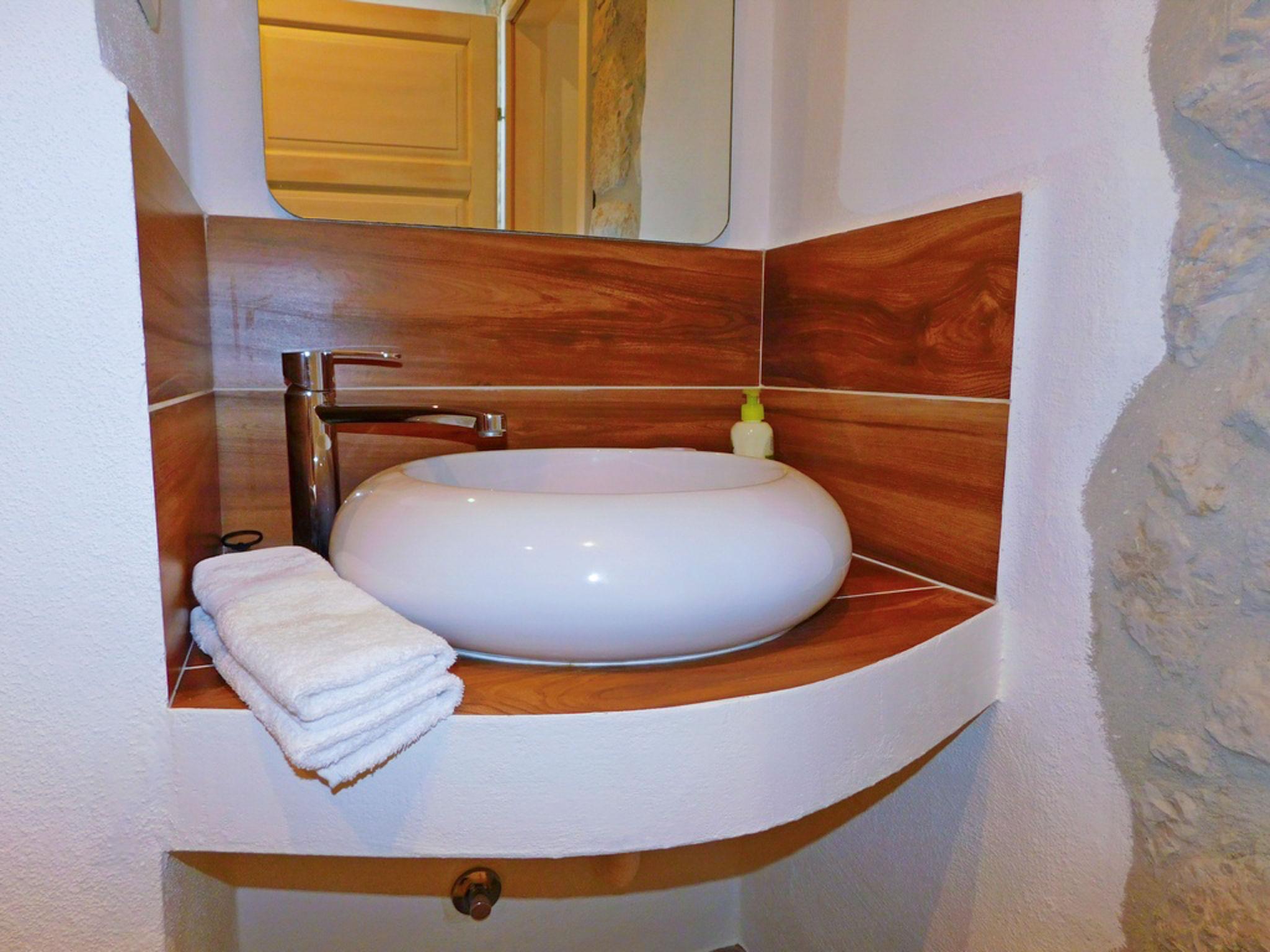 4-room house on 2 levels. Living/dining room with dining table, TV, cable TV and air conditioning. 1 double bedroom with 1 french bed (1 x 160 cm, length 200 cm), shower/WC. Exit to the garden. Kitchen (oven, dishwasher, 4 ceramic glass hob hotplates, toaster, kettle, freezer, electric coffee machine). Shower/WC. Upper floor: 1 double bedroom with 1 double bed (1 x 180 cm, length 200 cm), air conditioning. 1 double bedroom with 2 beds (90 cm, length 200 cm), air conditioning. Entrance hall with 1 sofabed (120 cm, length 200 cm). Shower/WC. Terrace 16 m2. Terrace furniture, deck chairs (8). View of the swimming pool and the garden. Facilities: washing machine, safe, iron, hair dryer. Internet (WiFi). Please note: non-smoking house.