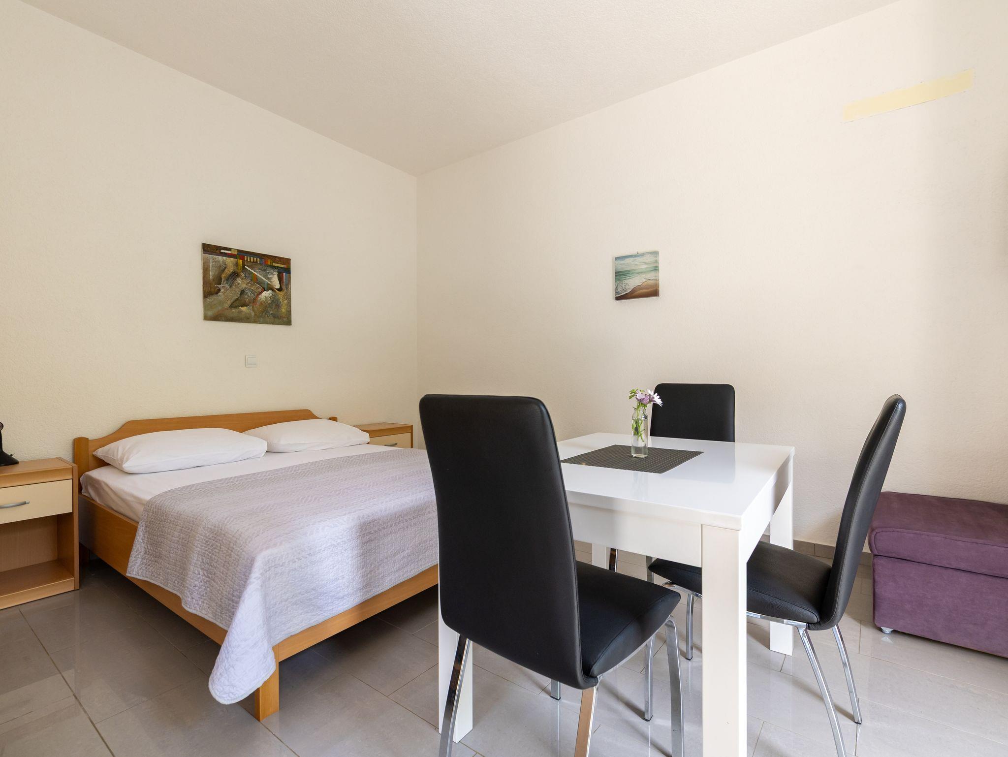 Studio bietet Platz für 2 Gäste. Die Betten sind in Schlafzimmern, die es 1 gibt, innerhalb einer Gesamtfläche von 24m2, angeordnet. Die Gäste haben eine eigene Terrasse zur Verfügung, auf der sie in warmen Sommernächten genießen können. Das Studio-Apartment bietet Meerblick. Es ist erlaubt, Speisen auf dem Gemeinschafts-Grill vorzubereiten. IM PREIS INBEGRIFFEN: Kurtaxe, Endreinigung, Parkplatz, Internet, Kinderbett, tragbarer Grill, 1 Bett für Kinder (im Preis enthalten). Die Verfügbarkeit zusätzlicher Dienstleistungen in Ihrem reservierten Termin und die Preise derselben (falls nicht aufgeführt) müssen im Voraus überprüft werden. Zusätzliche Dienstleistungen die in der Zahlungsaufforderung nicht aufgeführt sind werden direkt beim Vermieter bezahlt, angenommen der Gast nutzt auch diese.