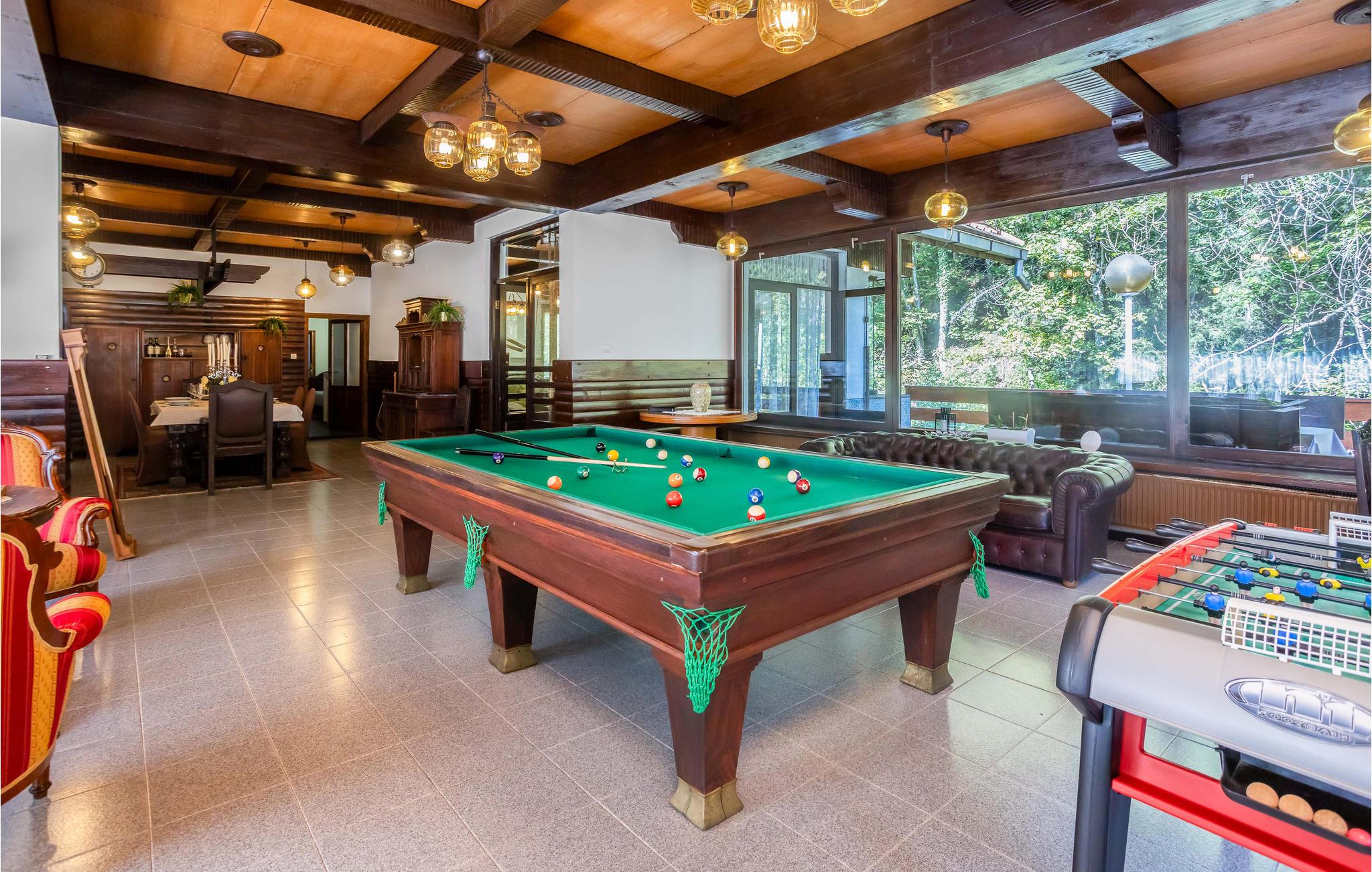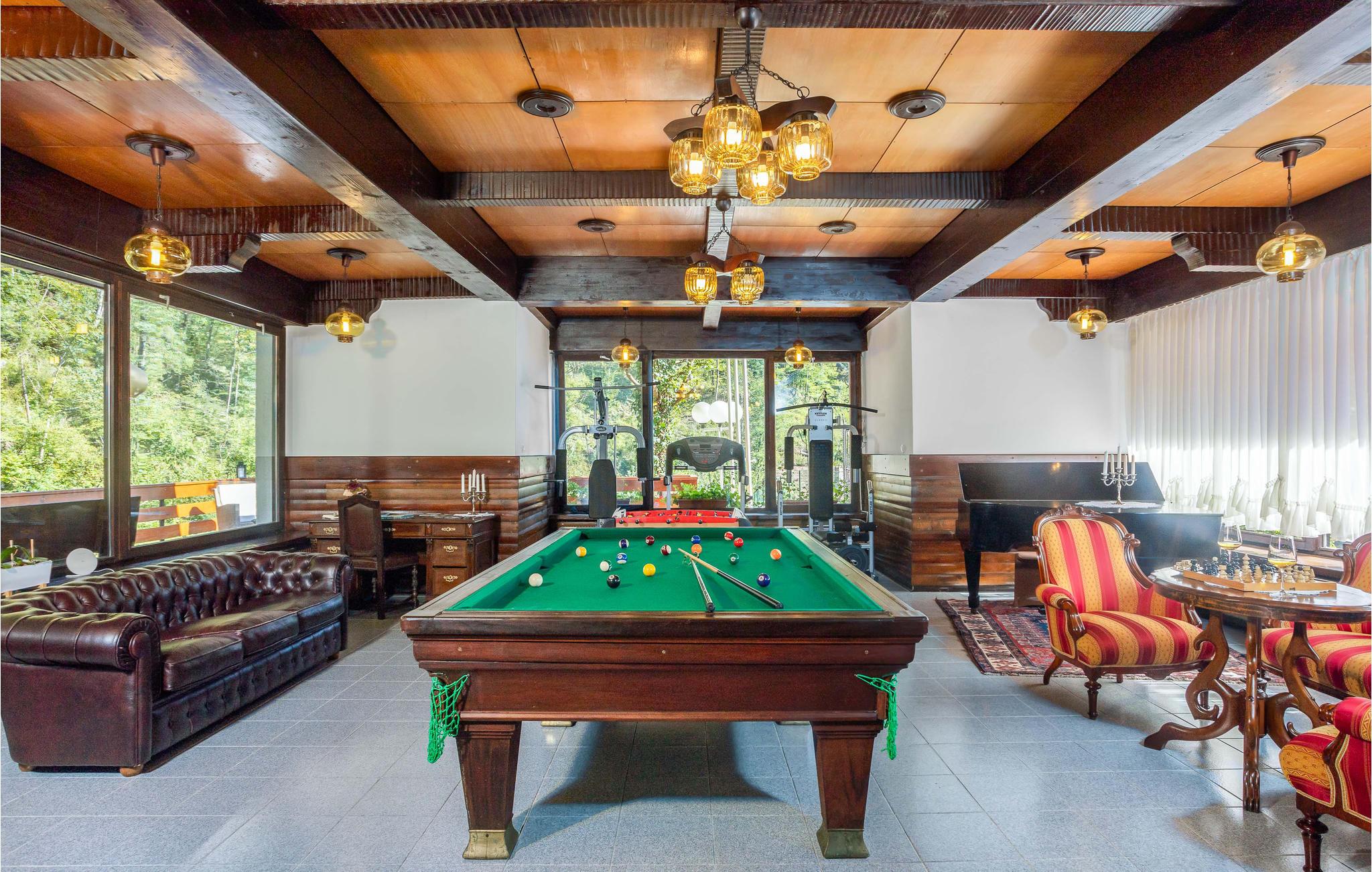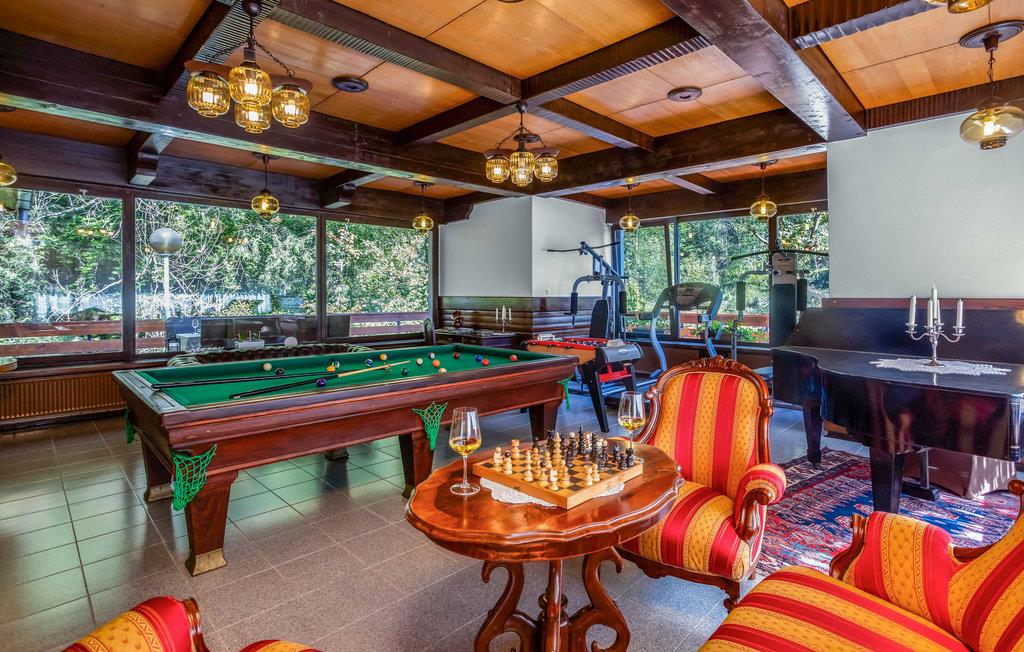 Beliggende på flodbredden i smukke naturomgivelser lover dette særlige feriehus en uforglemmelig ferie, og med sine trælofter, solide træmøbler og mange faciliteter og goder vil alle familiemedlemmer blive begejstrede for dette sted. De store rum er flot badet i naturligt lys gennem de mange store vinduer, som også bringer naturen helt tæt på. Uanset om I vil træne, spille billard eller bare hygge jer i sofaerne, finder I den rette plads til jer og dem, I holder af. I kan også nyde tiden udenfor med solbadning, dejlige familiemåltider, eftermiddagskaffe og aftendrinks, og I kan vælge mellem to terrasser. Lyt til de små, brusende vandfald, som udspringer kun få meter væk.