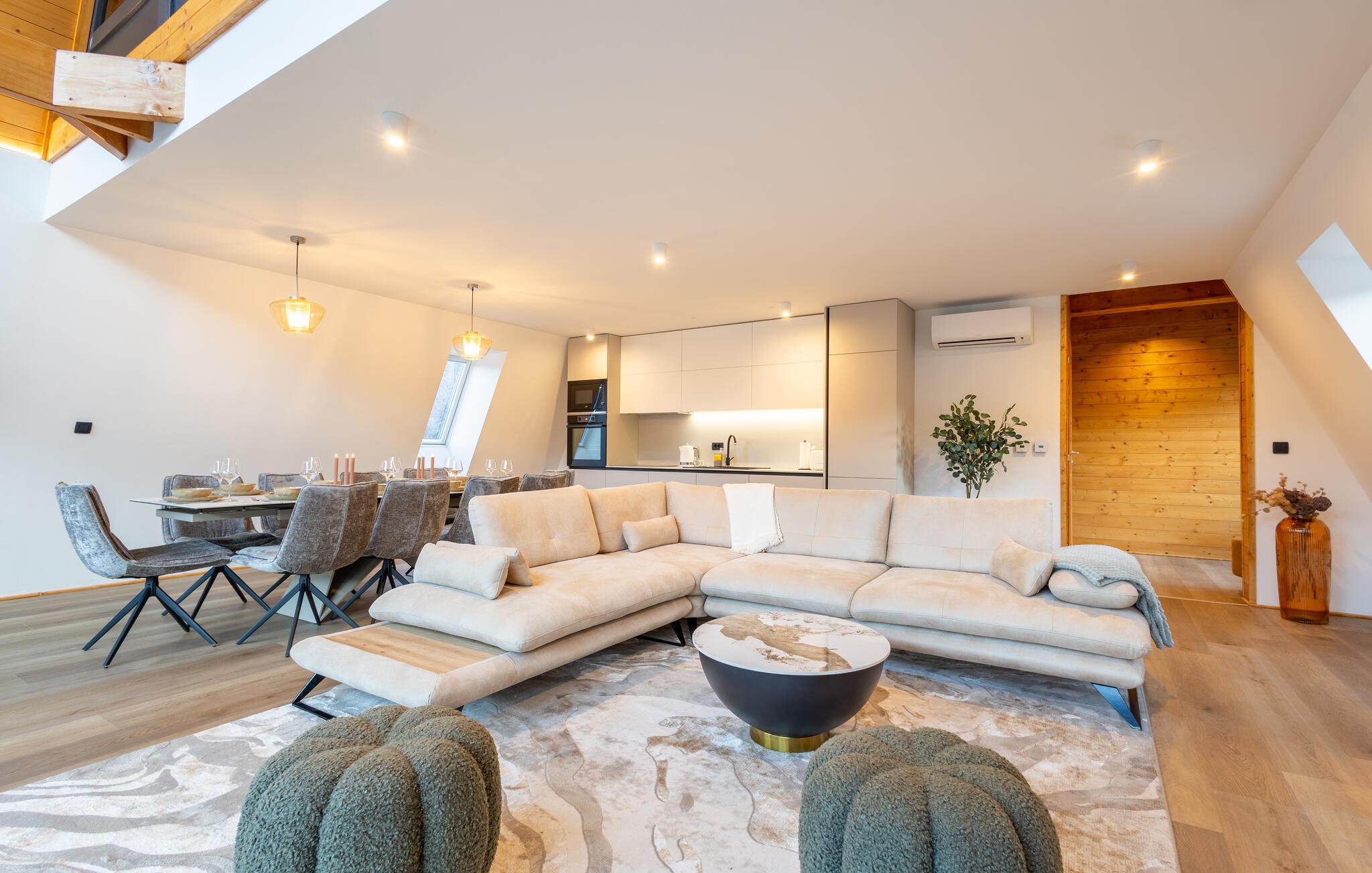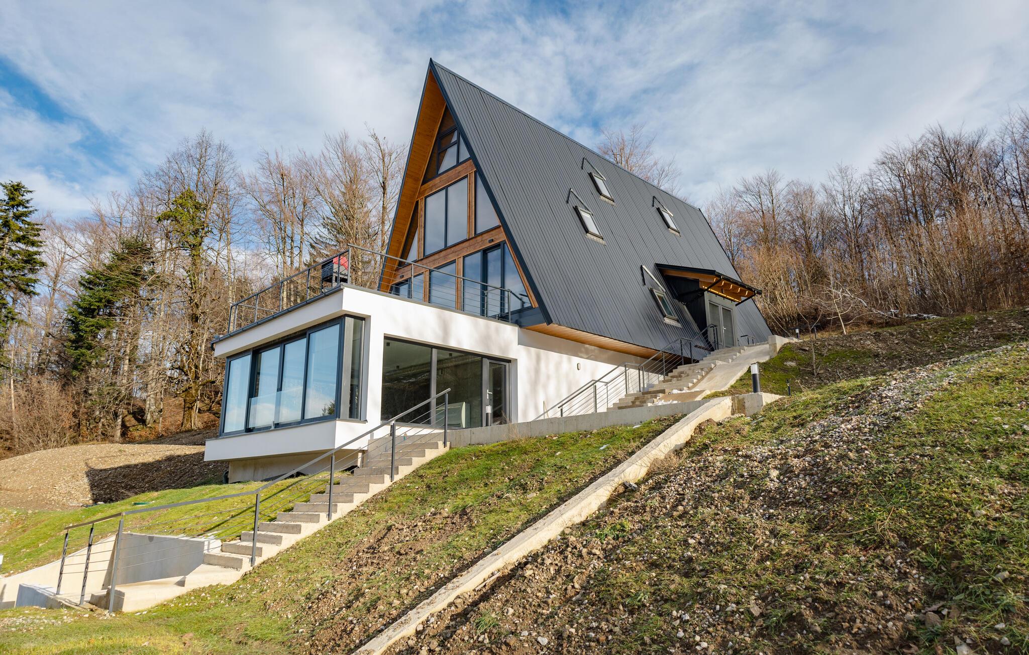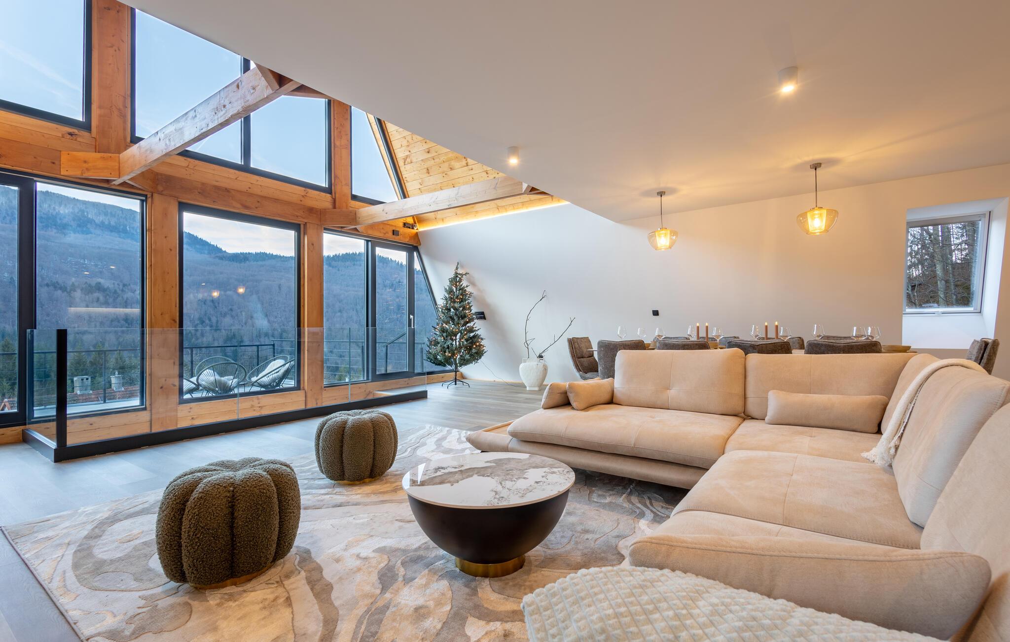 Omgivet af uberørt natur og beliggende på en skråning byder dette komfortable og smagfuldt indrettede feriehus velkommen, hvis rummelige vinduesfronter byder på en betagende udsigt over det omkringliggende landskab. Lav mad sammen i det moderne køkken og spis ved det elegante spisebord. Forkæl jer selv med afslapning i den indendørs pool, inden I synker ned i det komfortable sofaområde om aftenen, streamer en spændende serie eller slutter dagen af ??med et glas vin foran pejsen.