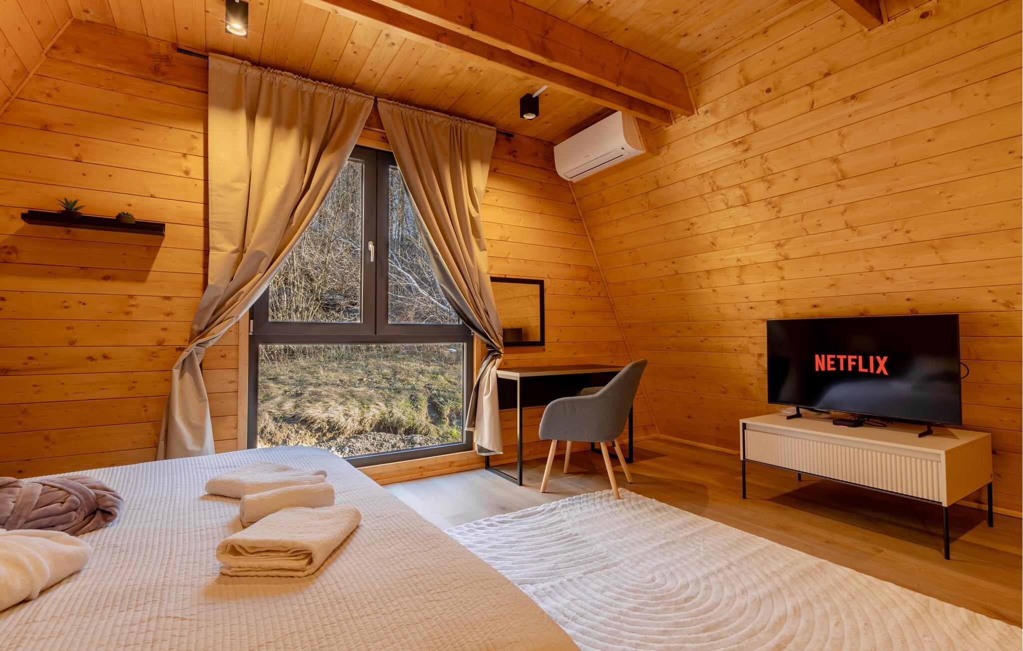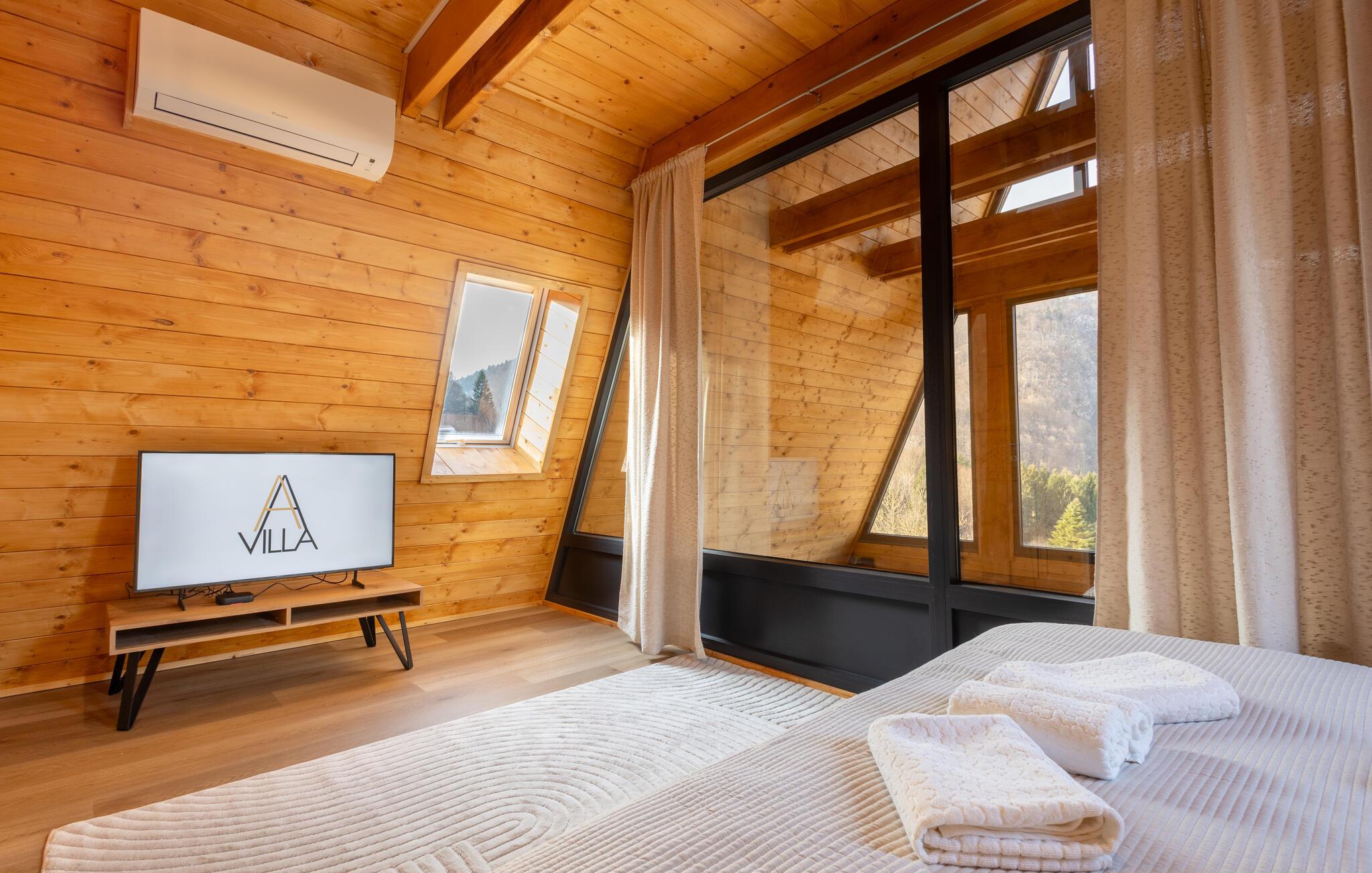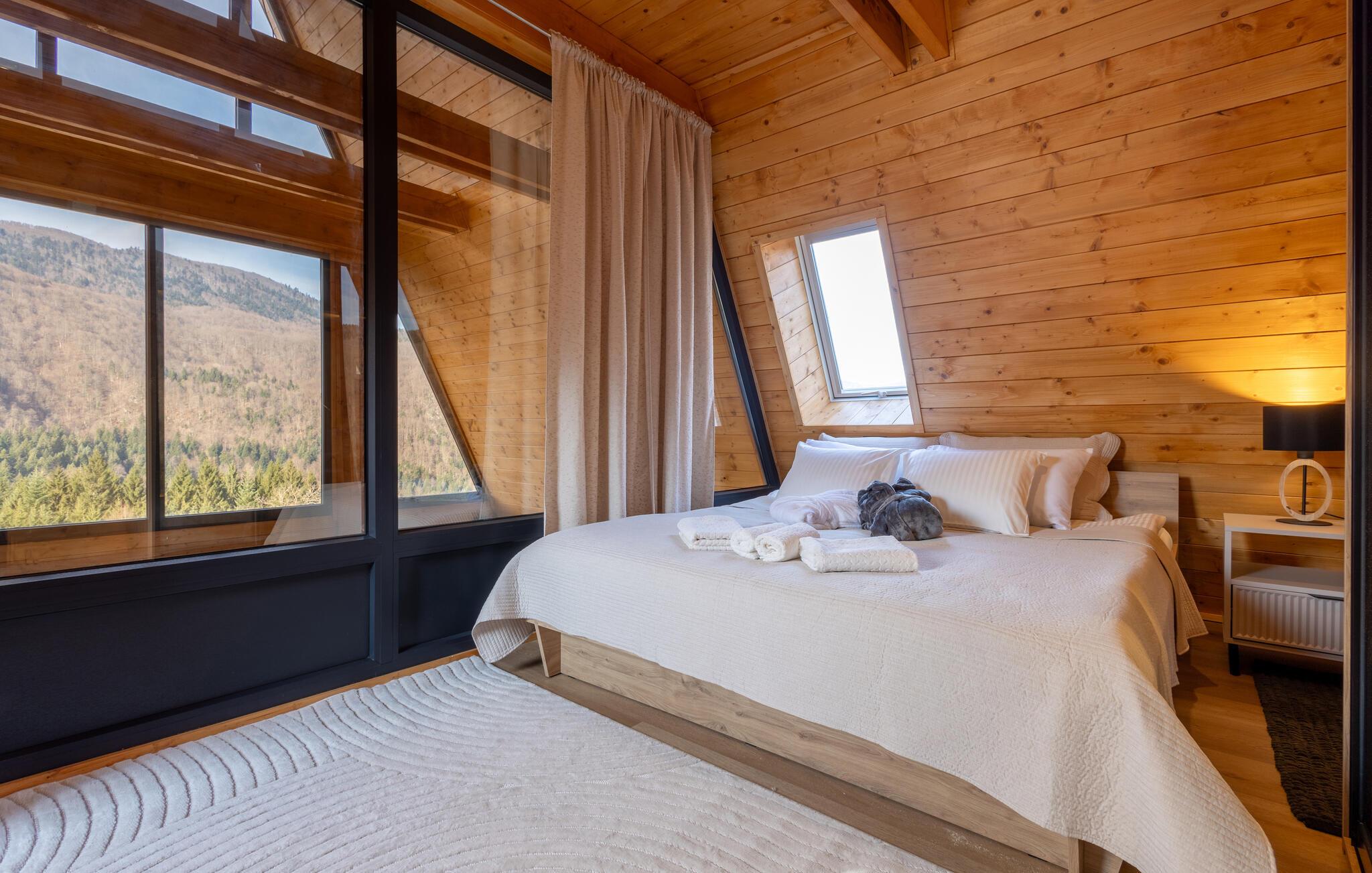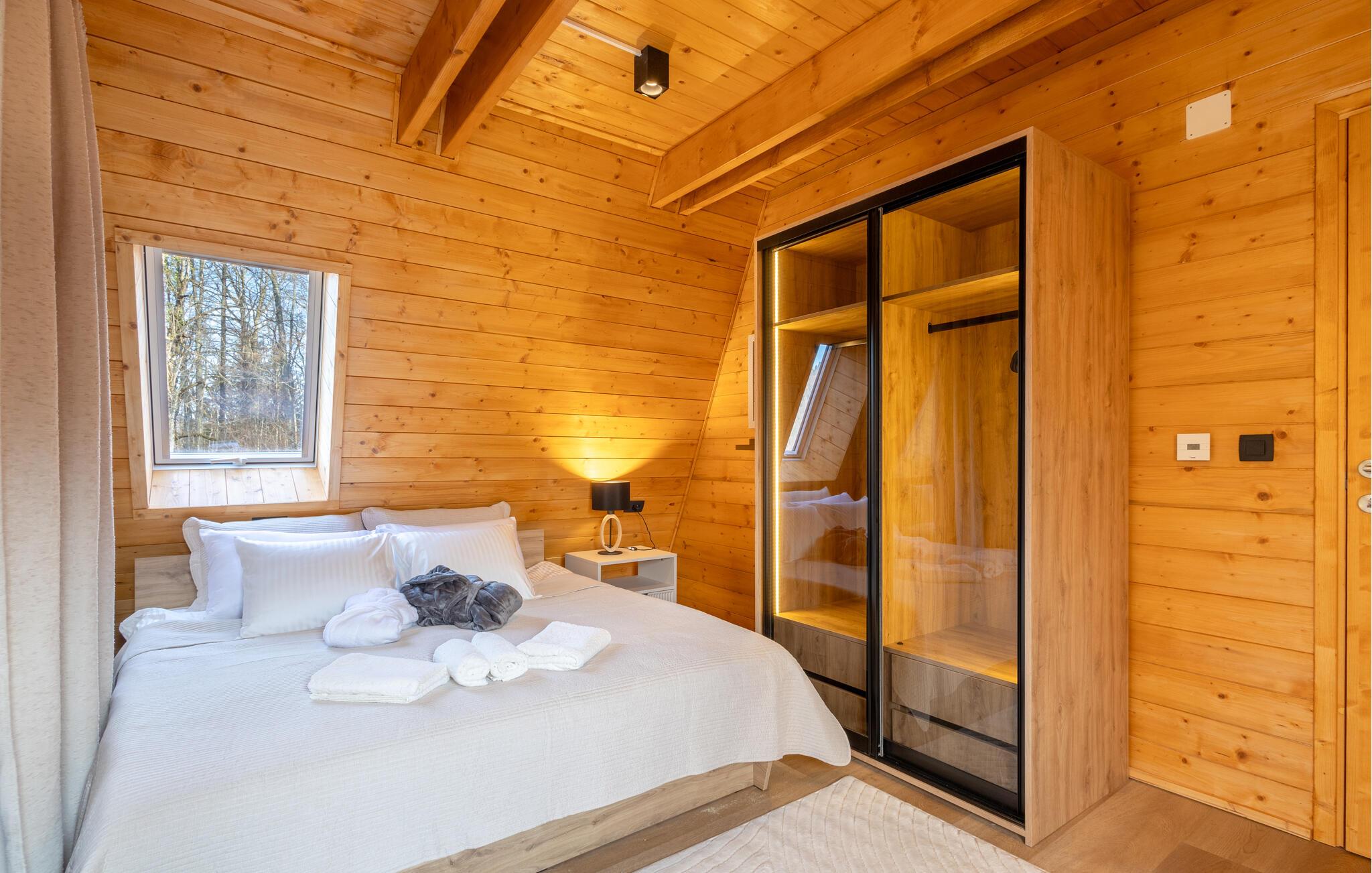 Omgivet af uberørt natur og beliggende på en skråning byder dette komfortable og smagfuldt indrettede feriehus velkommen, hvis rummelige vinduesfronter byder på en betagende udsigt over det omkringliggende landskab. Lav mad sammen i det moderne køkken og spis ved det elegante spisebord. Forkæl jer selv med afslapning i den indendørs pool, inden I synker ned i det komfortable sofaområde om aftenen, streamer en spændende serie eller slutter dagen af ??med et glas vin foran pejsen.