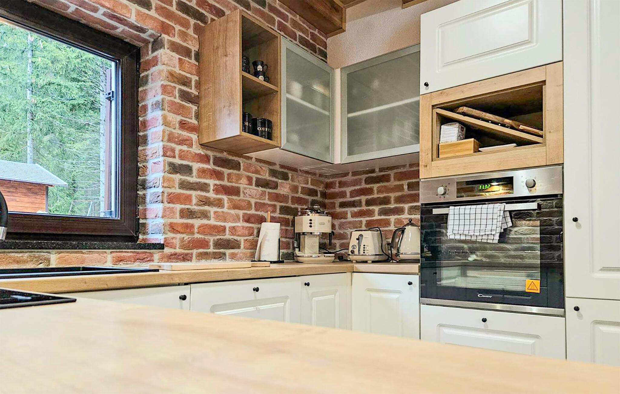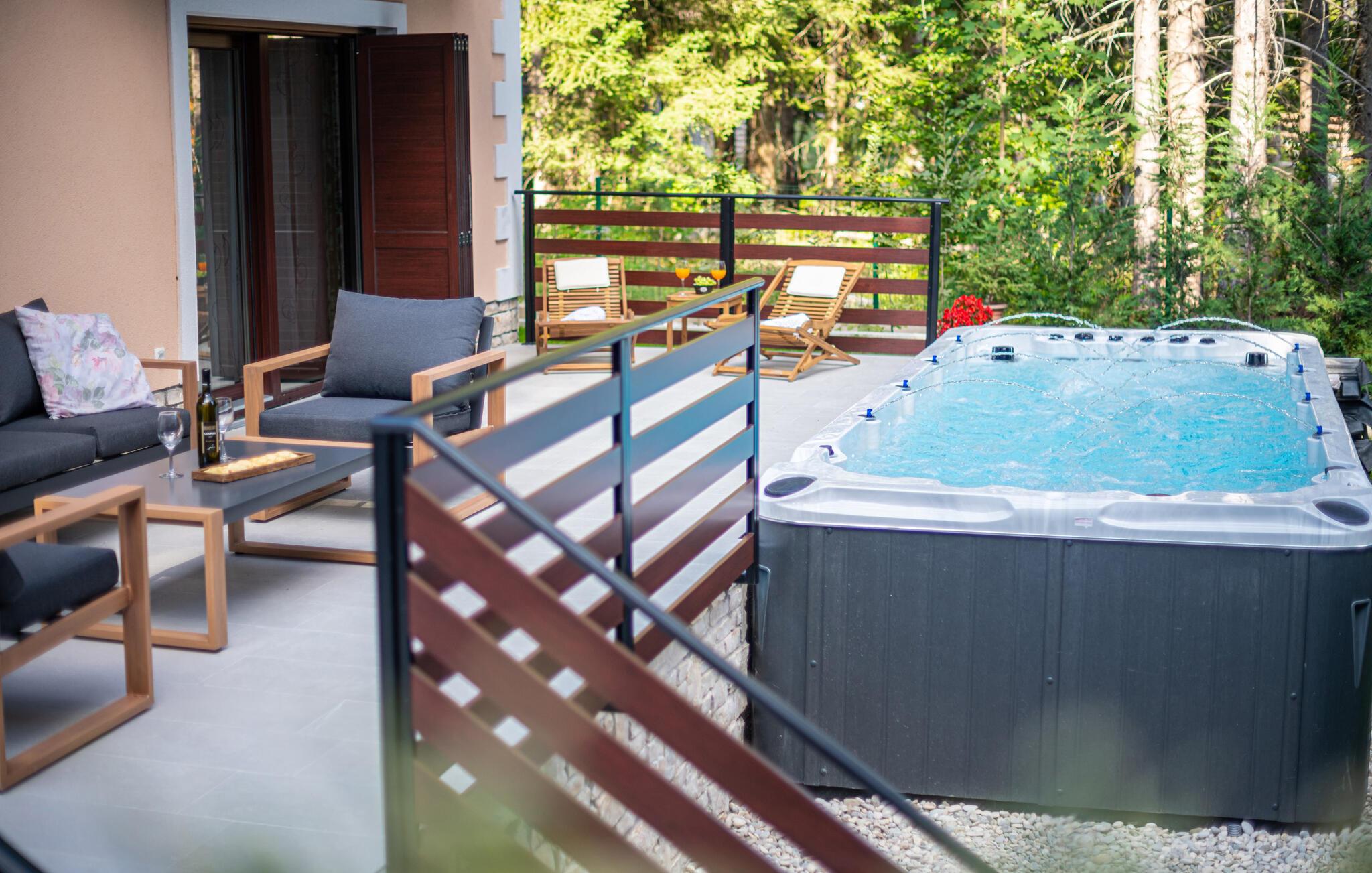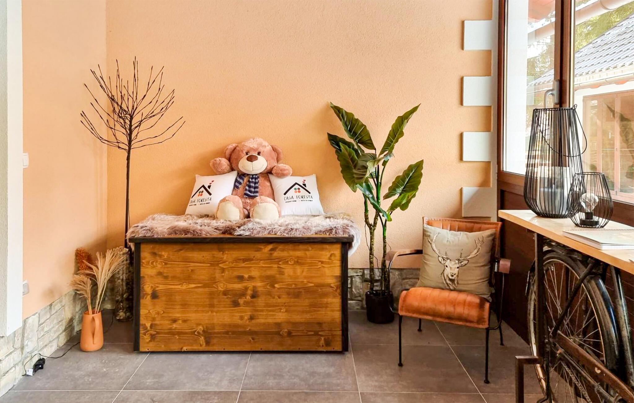 Omgivet af tårnhøje træer kombinerer dette hus på harmonisk vis rustik charme og komfort. Synlige træbjælker, natursten og træmøbler skaber en hyggelig atmosfære, hvor I hurtigt vil føle jer hjemme. Læn jer tilbage i spabadet, tilbring en filmaften på sofaen eller spil et spil dart.