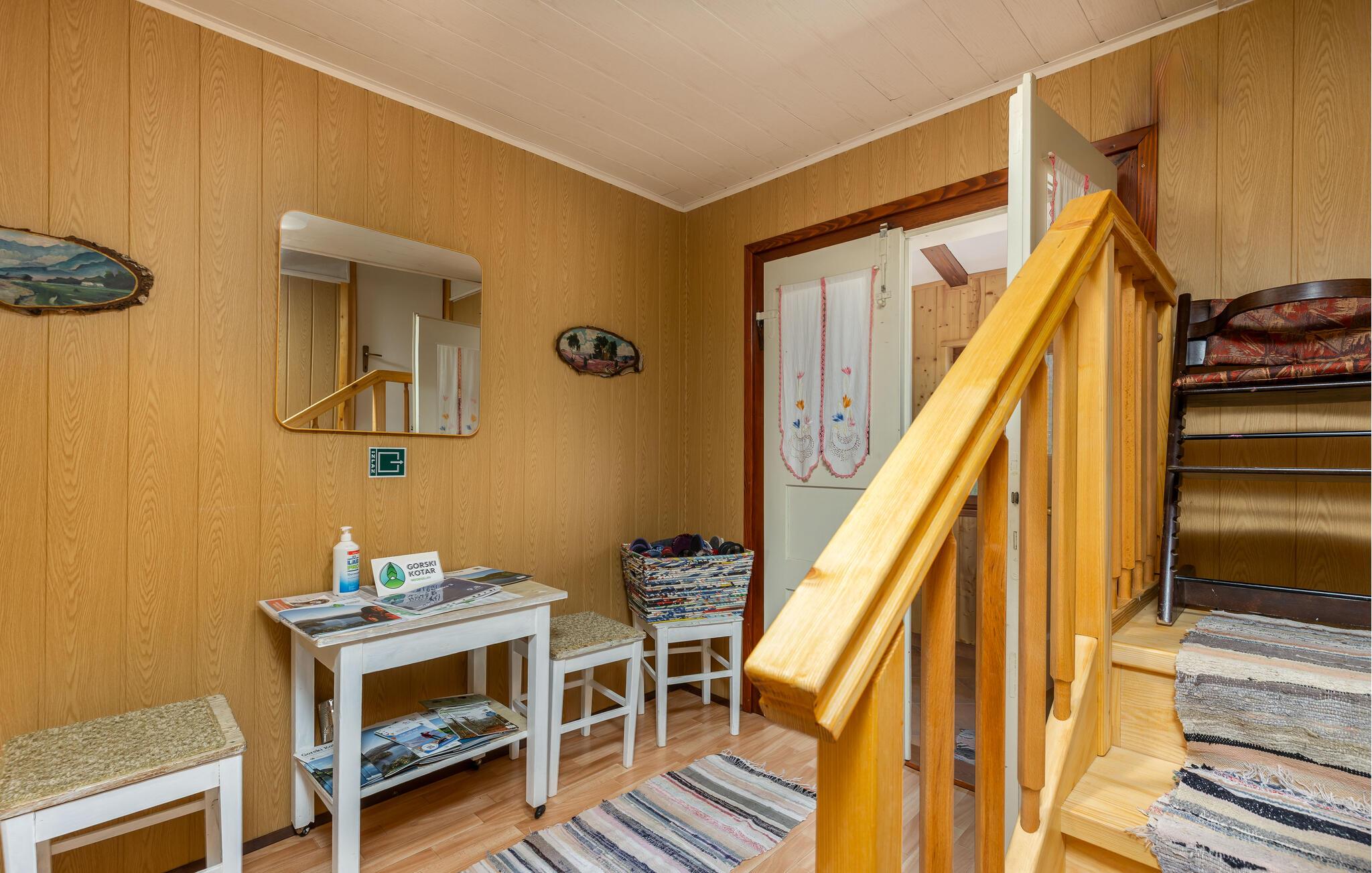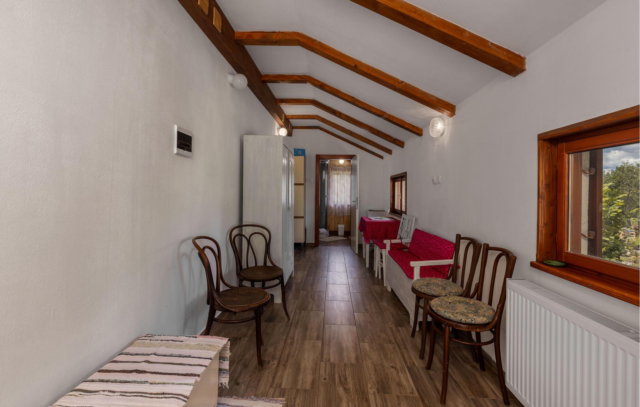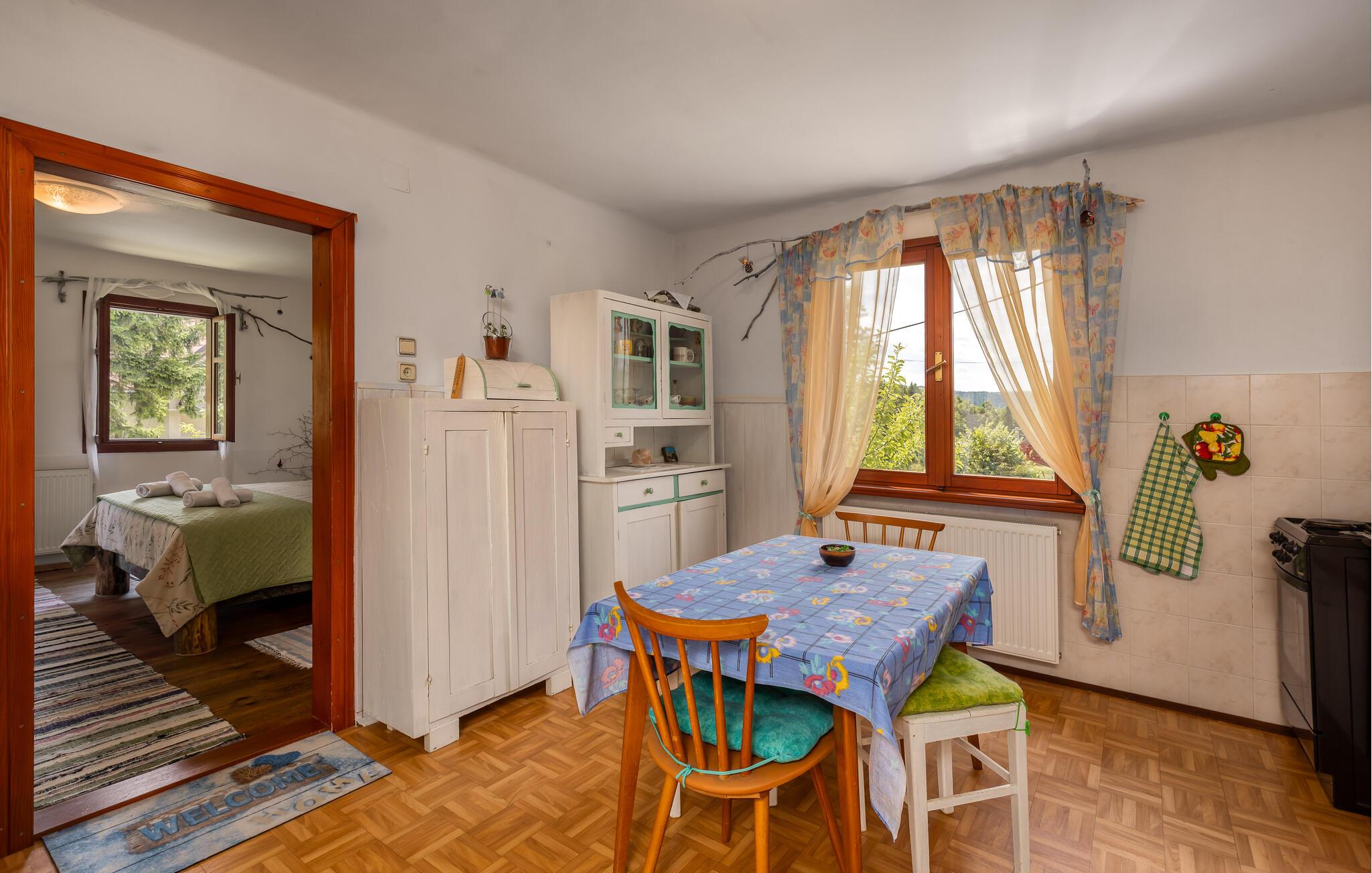 Nyd jeres ferie i dette idyllisk beliggende feriehus. Dette indbydende hus byder jer velkommen med en vellykket blanding af rustik charme og hygge. Træpaneler, synlige træbjælker og en traditionel pejs skaber en atmosfære, der er både hyggelig og nostalgisk. Slap af i sofaen, stream jeres yndlingsserie, eller tilbered et lækkert måltid i det moderne køkken. Den smukke have inviterer jer til at slappe af når som helst på dagen. Gå udenfor om morgenen med en duftende kaffe og nyd naturens ro. Find et roligt sted i træernes skygge og fordyb jer i en god bog. Skænk en kroatisk vin i glasset om aftenen og afslut dagen på en afslappet måde. Udforsk de omkringliggende skove og bjerge på vandreture eller cykelture gennem den uberørte natur i Gorski Kotar. Besøg den nærliggende by Vrbovsko, som vil glæde jer med sine maleriske omgivelser og traditionelle arkitektur. Tag på udflugter til regionens floder og søer, som inviterer jer til at fiske, padle eller blot slappe af. Nyd naturens ro og oplev bjergregionens kulinariske specialiteter i gæstehusene i Ravna Gora og omegn.