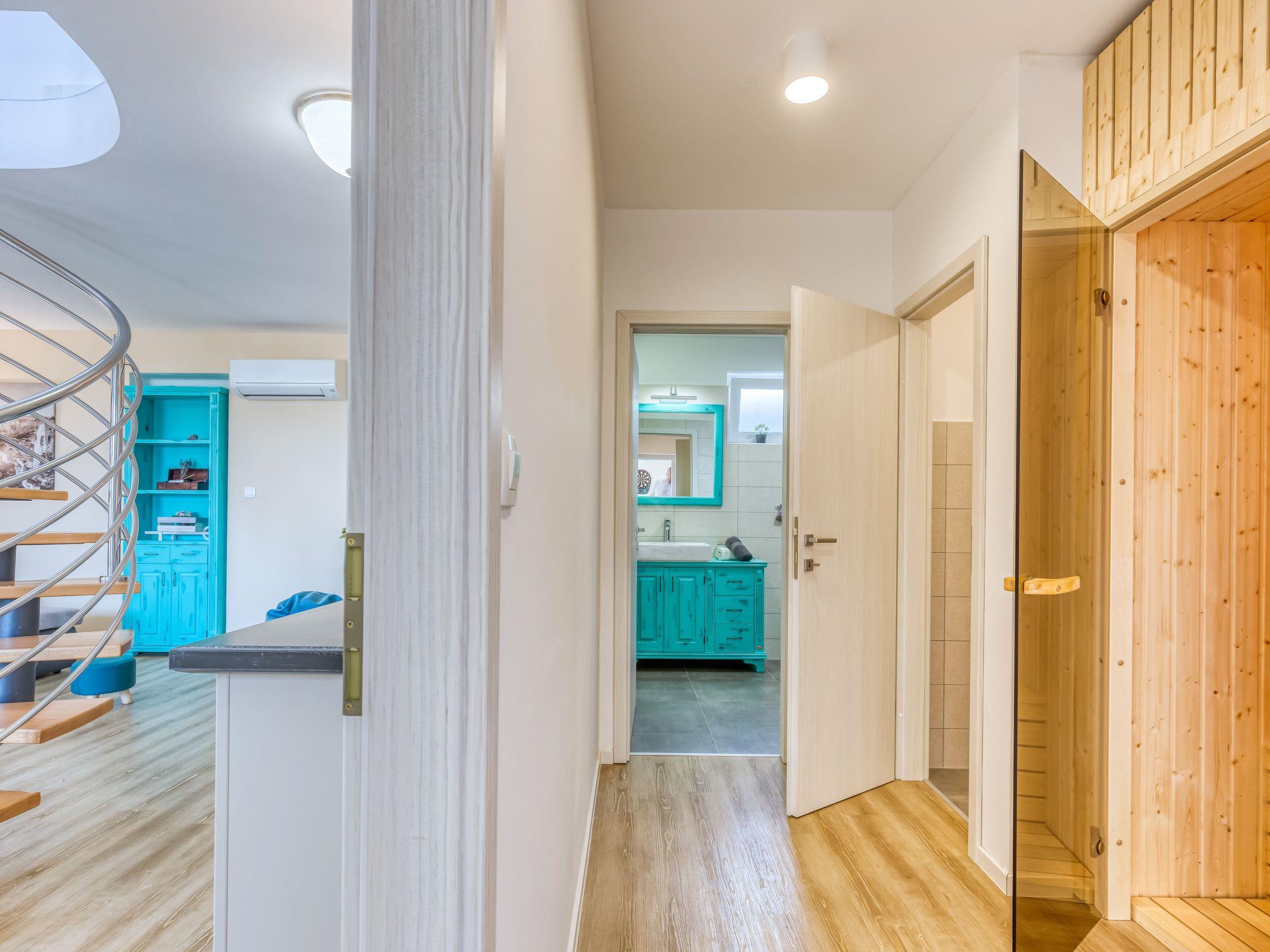 10 minutes by car to the beaches on Adraitic sea and 15 minutes to the mountains of Gorski kotar. The beautiful forests around and three lakes are ideal for walking or cycling. The house consists of 2 floors. The ground floor has a living room, kitchen with dining area, bathroom, toilet, sauna, fitness room, laundry. 1st floor accessible via outside and inside spiral stairs: 2 double bedrooms each with its own bathroom and 1 family room (2 separate bedrooms) with bathroom, balcony and terrace with sea view.