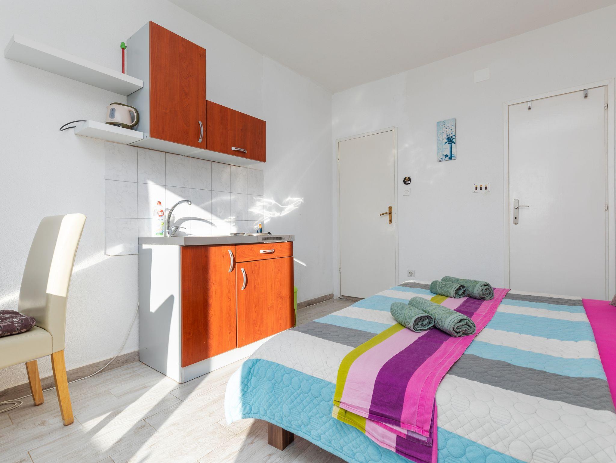 Studio bietet Platz für 2 Gäste. Die Betten sind in Schlafzimmern, die es 1 gibt, innerhalb einer Gesamtfläche von 19m2, angeordnet. Die Gäste haben einen eigenen Balkon zur Verfügung, auf der sie in warmen Sommernächten genießen können. Das Studio-Apartment bietet Meerblick. Es ist erlaubt, Speisen auf dem Gemeinschafts-Grill vorzubereiten. In der Unterkunftseinheit besteht die Möglichkeit des Mitbringens von Haustieren gegen Aufpreis. IM PREIS INBEGRIFFEN: Kurtaxe, Endreinigung, Klimatisierung, Parkplatz, Internet, Kinderbett, tragbarer Grill. VERBINDLICHE ZUSÄTZLICHE KOSTEN: Aufzahlung für Kurzaufenthalte (prozentualer Zuschlag pro Nächtigungsanzahl: 30% - 1, 20% - 2, 10% - 3). UNVERBINDLICHE ZUSÄTZLICHE KOSTEN: Haustiere (5,00 € pro Nacht). Die Verfügbarkeit zusätzlicher Dienstleistungen in Ihrem reservierten Termin und die Preise derselben (falls nicht aufgeführt) müssen im Voraus überprüft werden. Zusätzliche Dienstleistungen die in der Zahlungsaufforderung nicht aufgeführt sind werden direkt beim Vermieter bezahlt, angenommen der Gast nutzt auch diese. Ermäßigung auf den Grundpreis: Gratistag 14=13 (bei einem Aufenthalt von 14 Tagen oder mehr erhalten Sie einen Gratistag für den Aufenthalt bis 31.12.26).