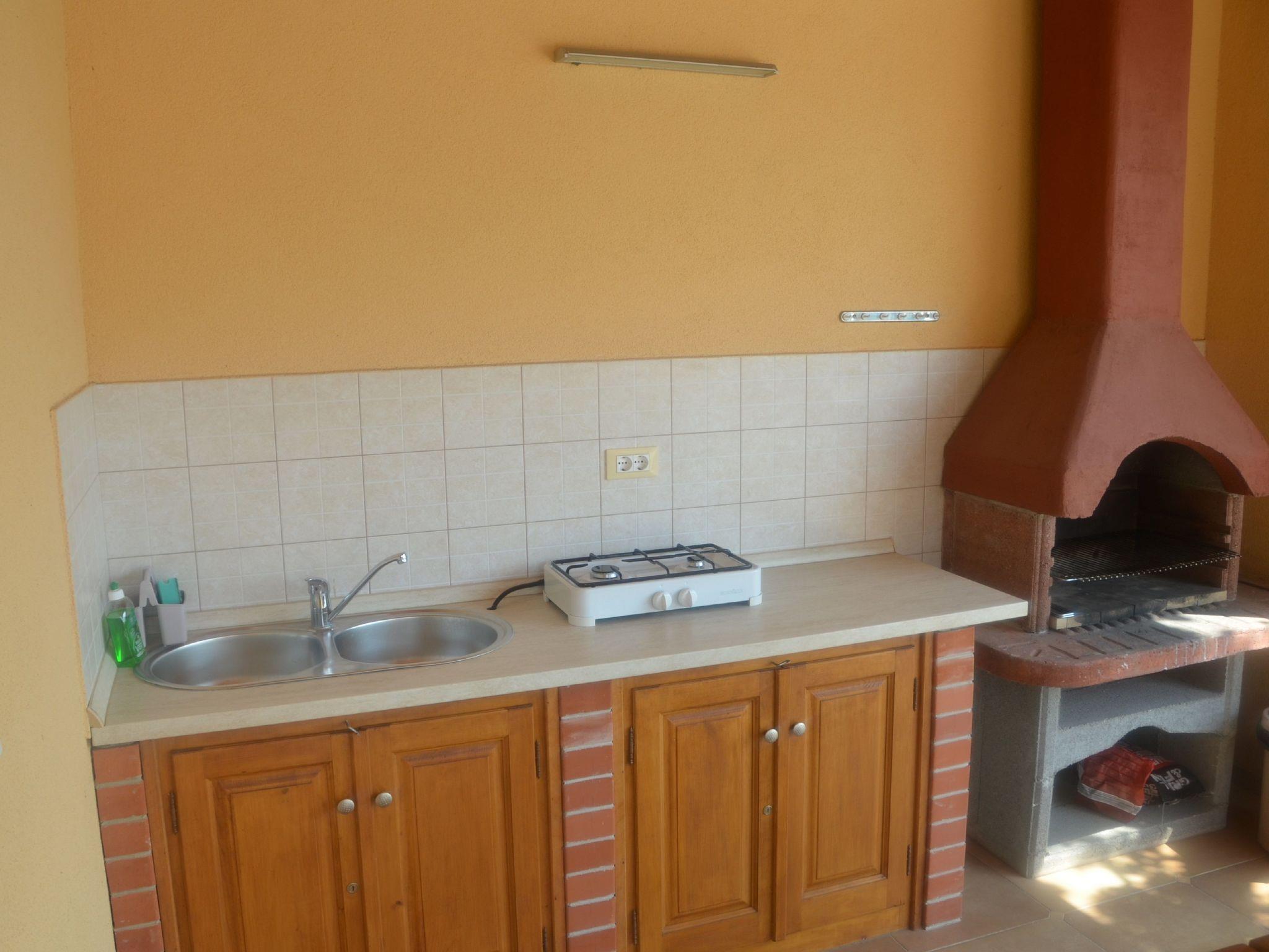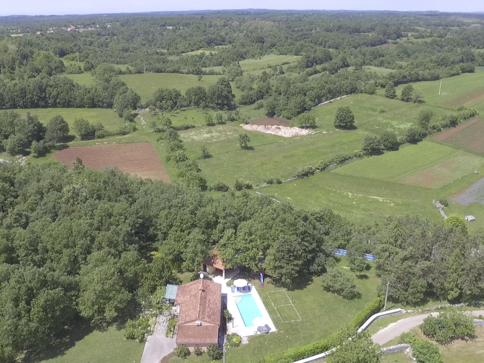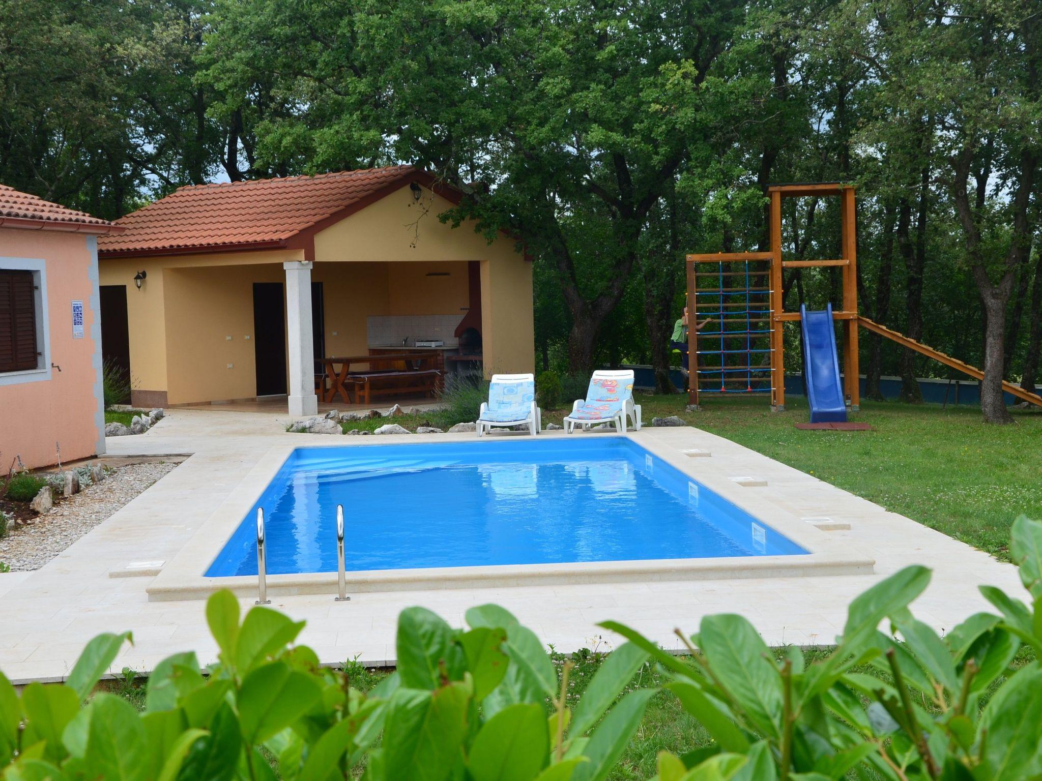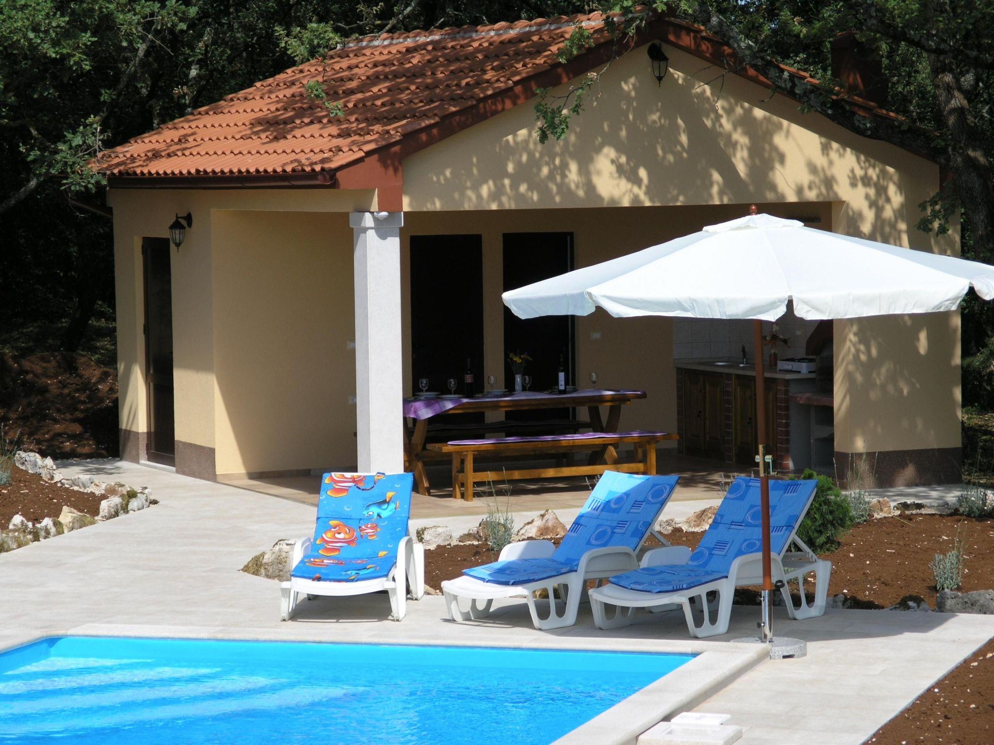 The 5000m² plot of land with plenty of greenery and trees provides ample space for a family with children. There is a 40m² (10 x 4 meter) swimming pool with a depth of up to 1.40 m, featuring underwater lighting and a self-cleaning system. The pool area has sun loungers and a parasol. Use of the pool is for holiday home guests only. There is also a roofed dining area with a grill.