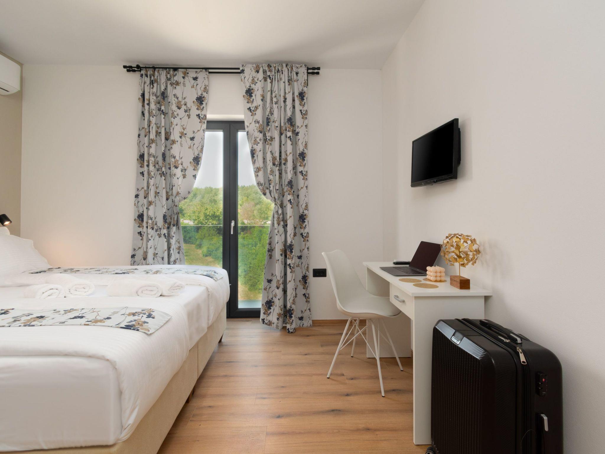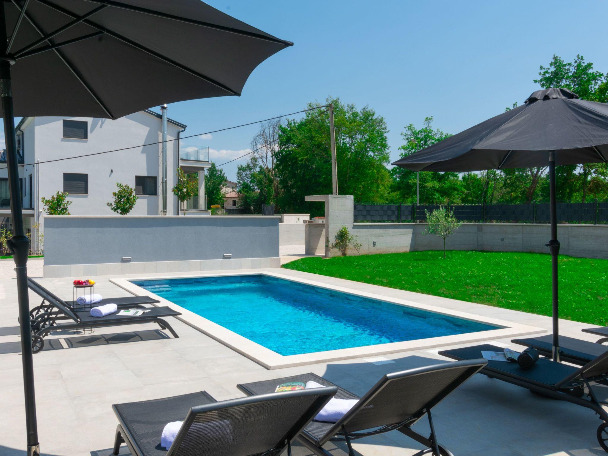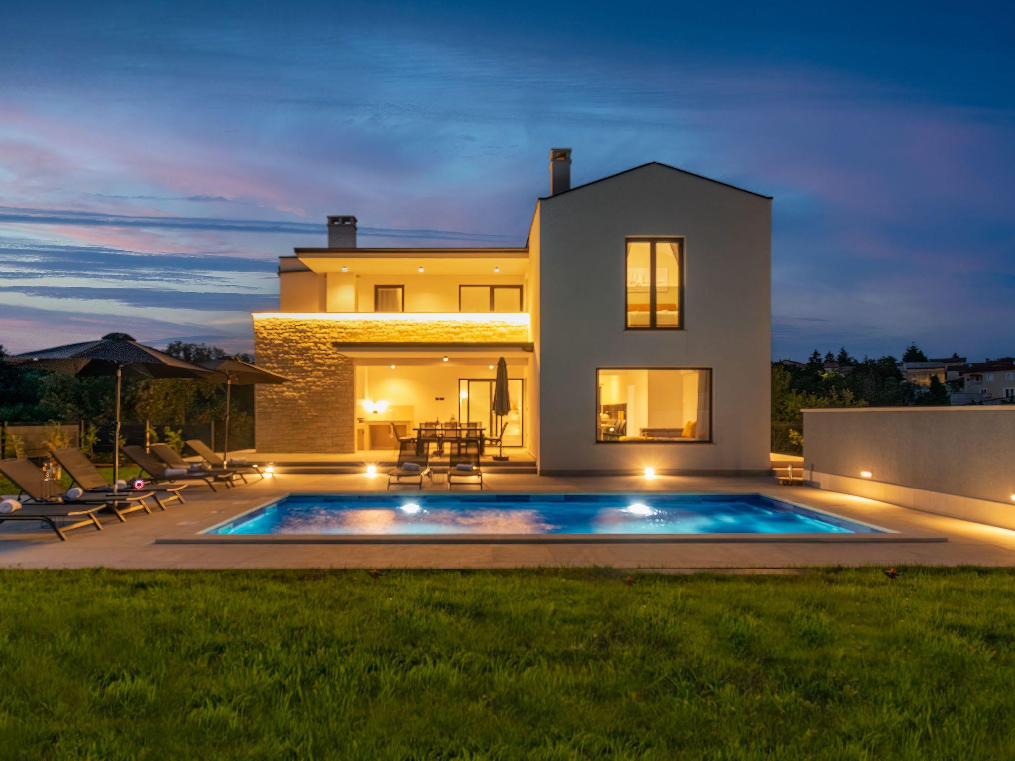 The villa's exterior is an oasis of relaxation and fun, beginning with the inviting option each morning to jump directly into the sparkling swimming pool from the balcony doors. As the sun sets, the property transforms with atmospheric lighting—from balcony lights to pool illumination—creating a serene vibe. This ambiance is further enhanced by an outdoor dining area that overlooks the pool, promising enchanting summer evenings under the stars.