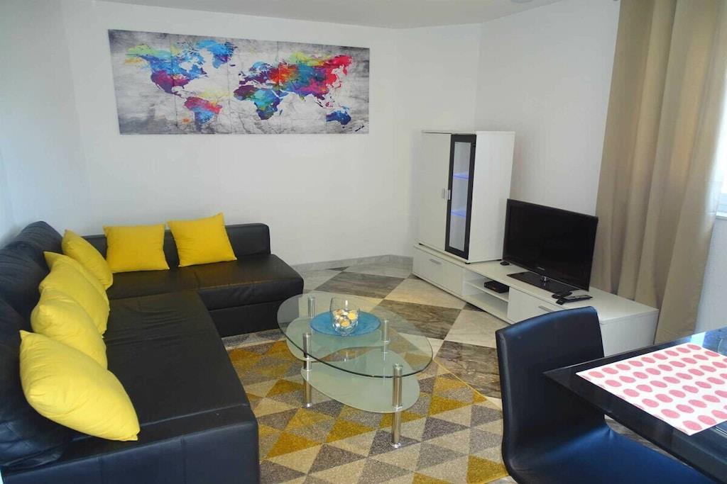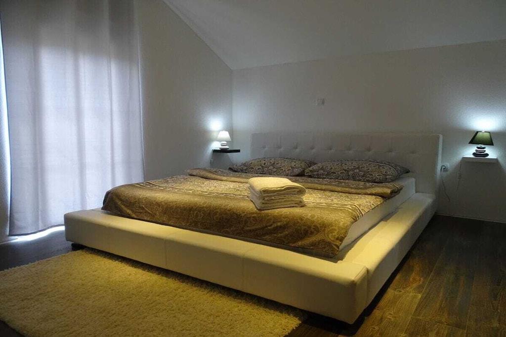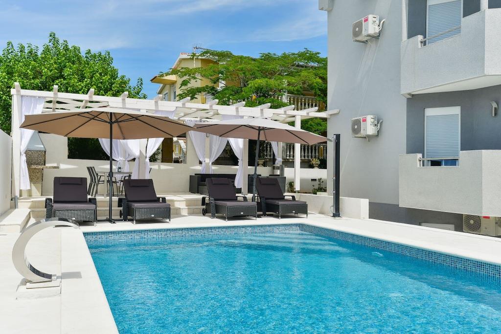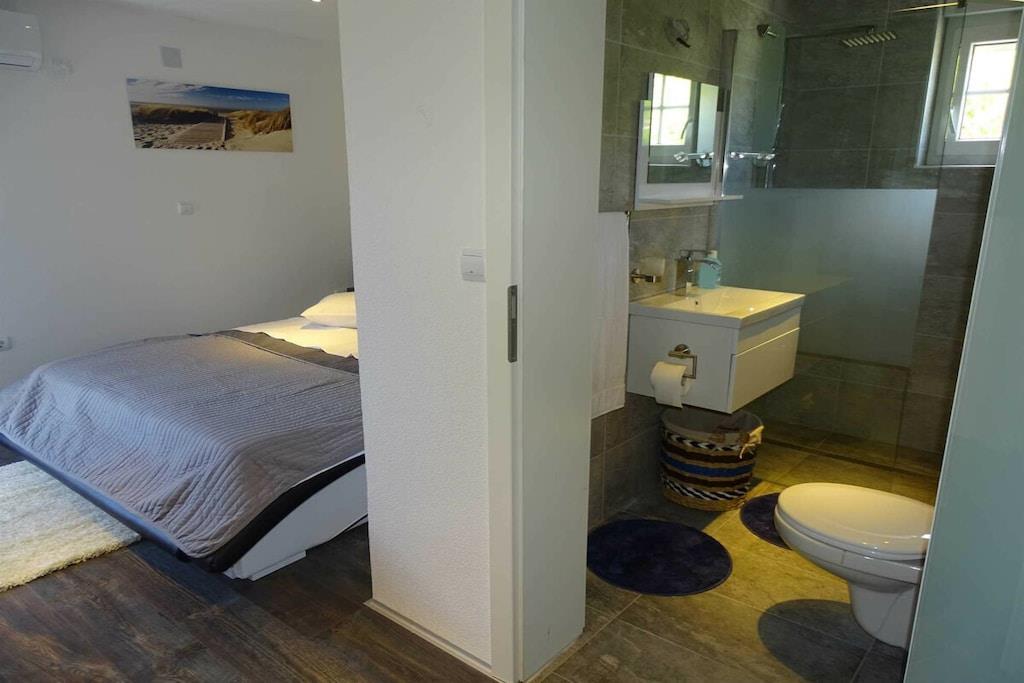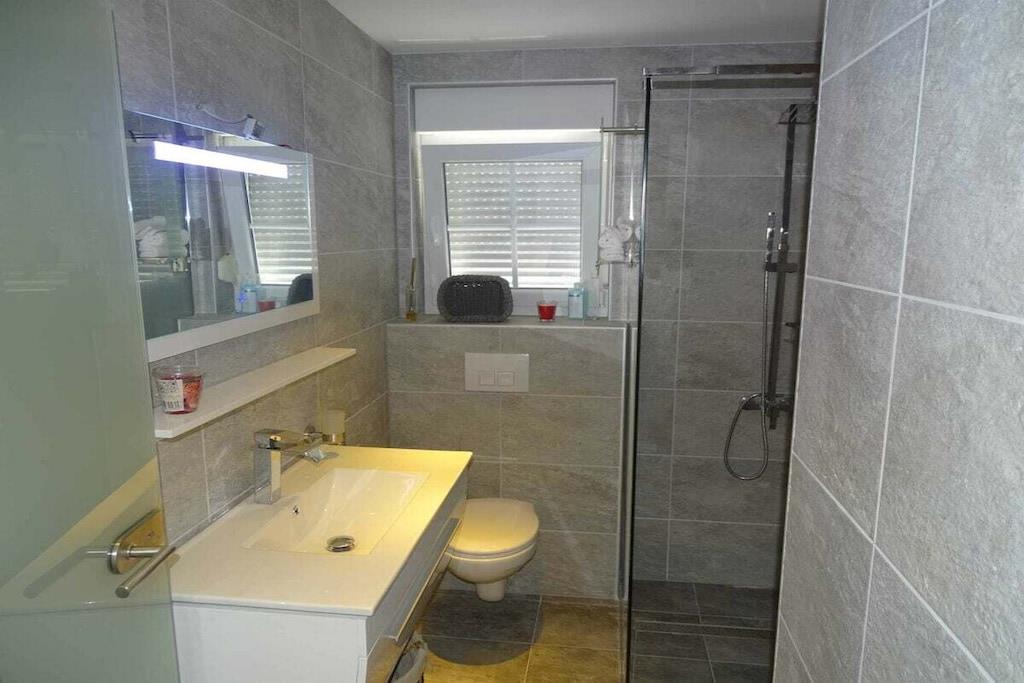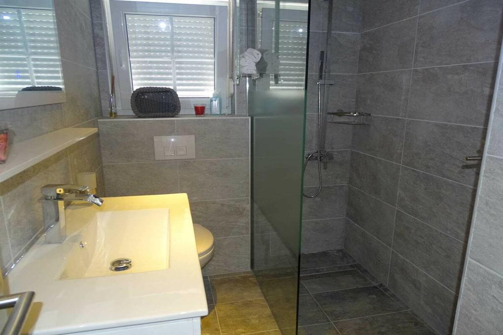 Das geräumige moderne Ferienhaus in perfekter Lage, nur 400 m vom Strand entfernt, mit privatem Pool bietet Privatsphäre und Zugang zu allem, was Sie für einen perfekten Urlaub benötigen. Das Haus besteht aus zwei Wohnungen mit zwei Schlafzimmern und einer Wohnung mit einem Schlafzimmer. Insgesamt gibt es also fünf Schlafzimmer und fünf Bäder. Zwei Wohnungen haben einen Balkon mit herrlichem Meerblick. Die Küchen in den Appartements sind komplett mit neuen Geräten ausgestattet und sofort einsatzbereit. Die Esszimmer, Wohnzimmer und Balkone sind geschmackvoll eingerichtet. Das Ferienhaus bietet 4 kostenlose Privatparkplätze, einen 32 m2 großen Swimmingpool, einen Steingrill, einen Aufenthaltsraum im Freien und einen Essbereich im Freien.