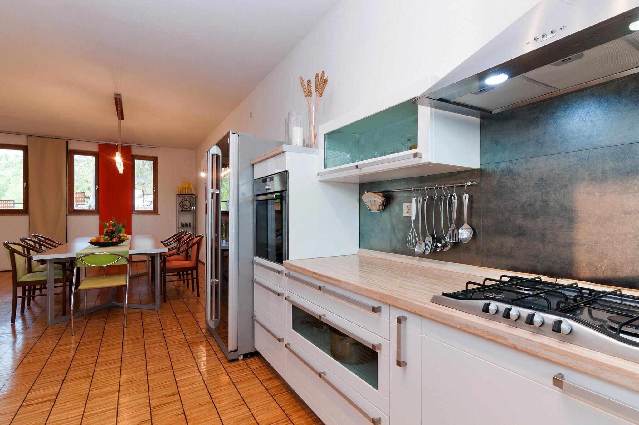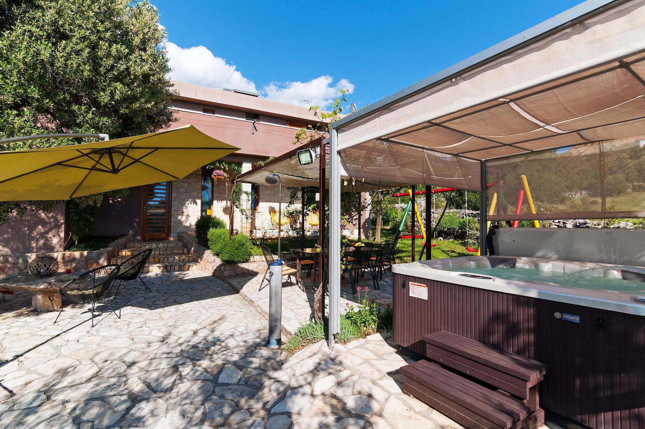 Moderne og komfortabelt indrettet ferievilla i den lille, rolige landsby Rovanjska. Feriehuset har 4 soveværelser og 2 badeværelser og byder derfor på god plads til alle medrejsende. Fra den smukke, store altan har du en vidunderlig panoramaudsigt over havet og Velebit-bjergene. I løbet af dagen kan du slappe af ved din pool og afslutte aftenen på din terrasse med en grill. Småstensstranden på en særlig ren strækning af Adriaterhavet ligger kun få skridt væk. En dejlig gåtur ved havet tager dig til restauranter, caféer, barer og butikker i Rovanjska. Højdepunkter inkluderet: forbrugsbaserede energiomkostninger, WiFi, registreringsgebyr, turistskat, sengelinned og håndklæder. Aktiviteter i nærheden : Området er perfekt for folk, der kan lide at tilbringe deres ferie aktivt med vandreture, mountainbiking og vandsport. Zrmanja-floden er ideel til kanosejlads. Besøg også Paklenica National Park, der ligger 11 kilometer fra din bolig og omkring 50 km nord for Zadar mellem kysten og Velebits højeste toppe. De 400 meter høje klipper, grotter, grotter og bizarre klippeformationer gør dette landskab til en enestående naturoplevelse. Du finder dog ikke kun et goldt karstlandskab her, for de stejle klippeskråninger er dækket af tæt og usædvanlig fyrreskov på grund af klimaet. Inden for parken er der et netværk af over 150 km vandrestier, som giver mulighed for både korte vandreture og flerdages trekking. Den mest populære vandretur tager omkring to timer og fører fra indgangen til parken gennem den imponerende Velika Paklenica-kløft. På vejen kan man se forskellige vandmøller, som ikke længere er i brug, men er velbevarede. Og i Lugarnica-skovhytten kan du forstærke dig med en solid snack. Den smukke by Zadar ligger kun 30 km herfra, hvor du kan besøge en masse historiske seværdigheder og også et indkøbscenter. Mobilitet: ikke egnet til personer med nedsat mobilitet.