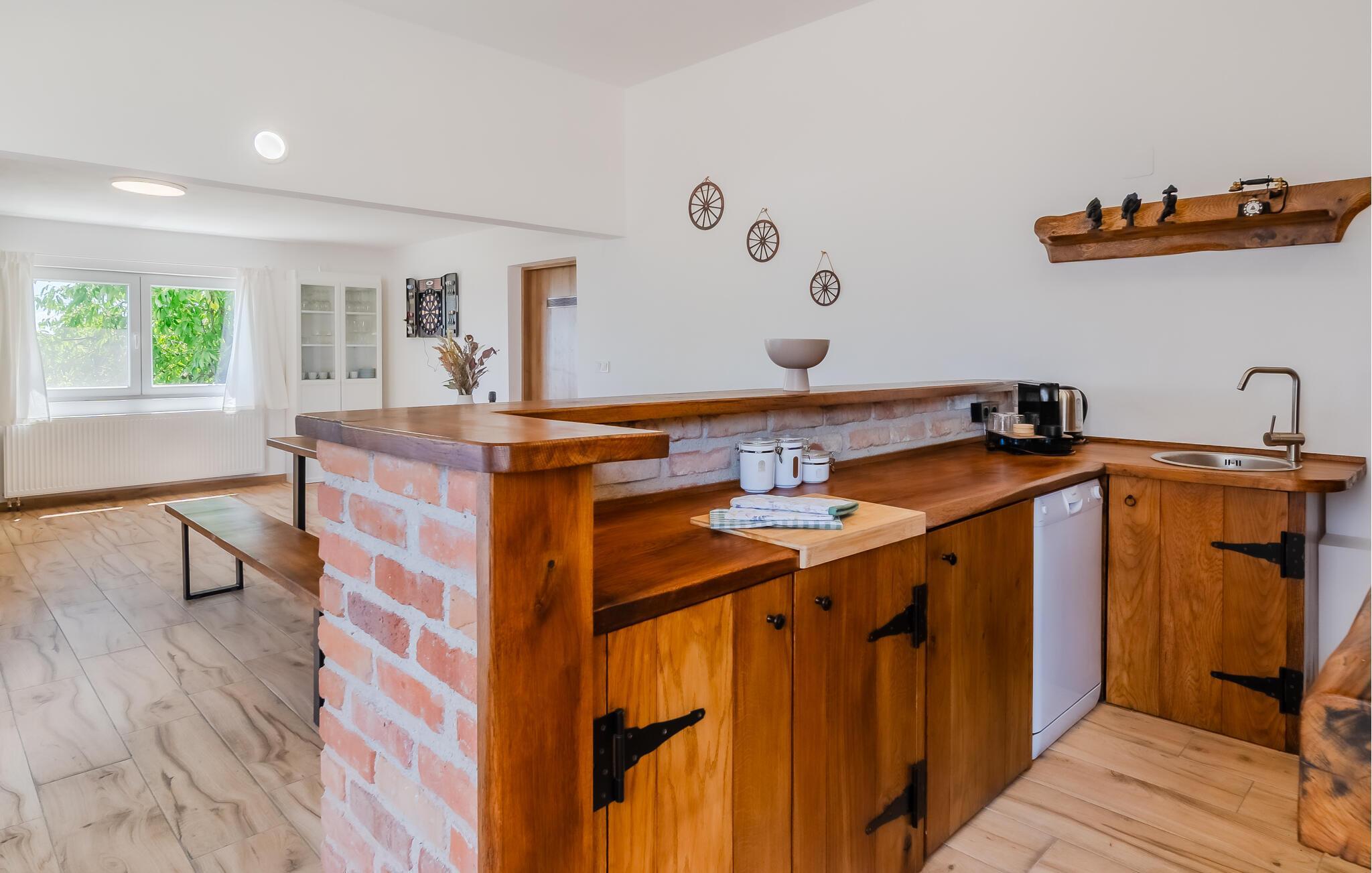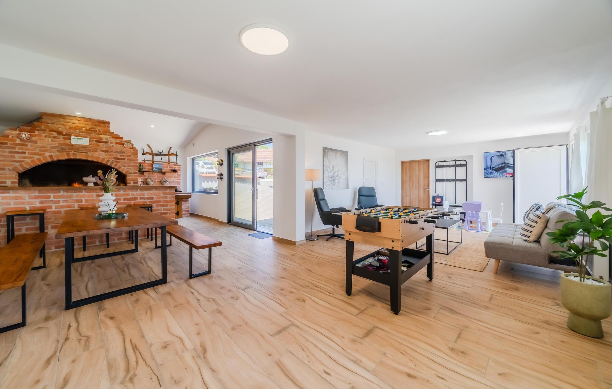 Tag familien eller jeres bedste venner med – dette rummelige feriehus tilbyder masser af plads til hyggelige måltider, sjove madlavningsaftener og hyggelige timer med familien. Brug den lyse, rummelige opholdsstue til at nyde bordfodboldbordet, afhold en spilleaften eller stream en spændende film. Hold jer i form på løbebåndet eller forkæl jer selv med en afslappende tid i saunaen.